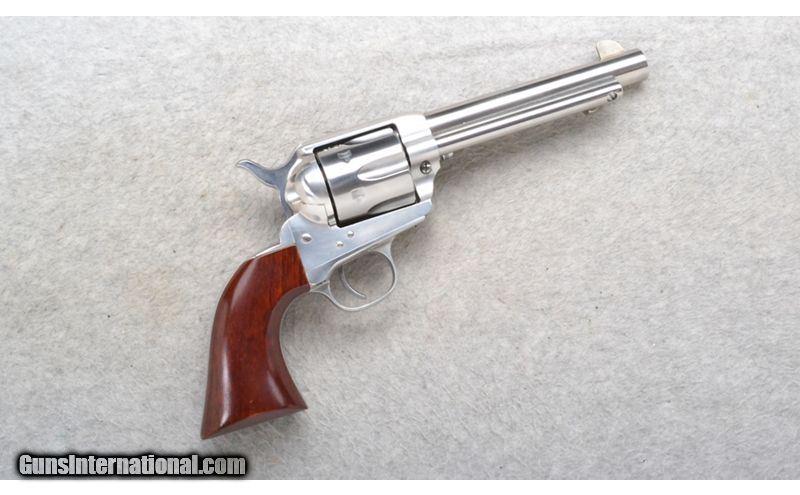 Description: This Uberti Model 1873 is a stainless steel right hand single action revolver in .45 Colt Cal. It has a 5.5 inch barrel. A blade front sight and an integral notch rear sight. The grip is a smooth hardwood. .45 Colt SOLD Chambers: 6 shot. Metal Condition: Excellent. A minor handling mark. Wood Condition: Excellent. A minor handling mark. Bore Condition: Very Good. Barrels: 5.5 inch. Triggers: Single Action. Weight: 36 oz. Sights: Blade front. Integral notch rear. Item Location: Richfield, WI |