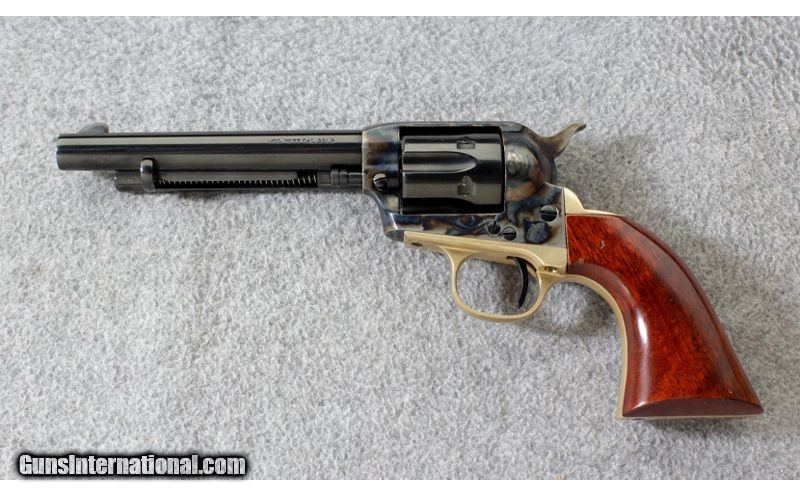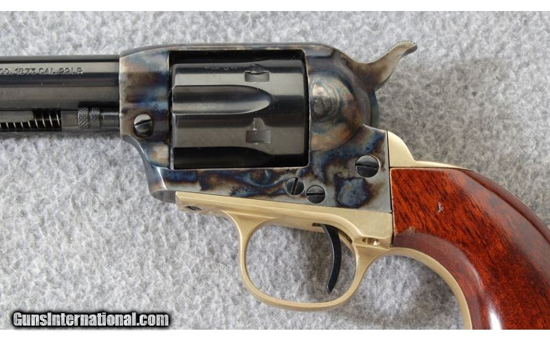 Description: Uberti's 1873 Stallion single action .22 Long Rifle revolver was designed for the shooter wanting that old West feeling. Adding to the appeal is a brass backstrap and trigger guard paired with a stunning case hardened frame. This 6-shot Uberti revolver can be easily disassembled—cylinder removed—for cleaning. The barrel is blued and has a raised blade front sight at the muzzle. The special flared grips are crafted from walnut. Manufactured 2019 .22 Long Rifle SOLD Metal Condition: Excellent Wood Condition: Very good, with some scratches Bore Condition: Excellent, sharp and bright Barrels: 5 1/2 inch barrel Triggers: Single action Weight: 36 oz. Sights: Fixed square notch rear sight with blade front Item Location: Lehi, UT |