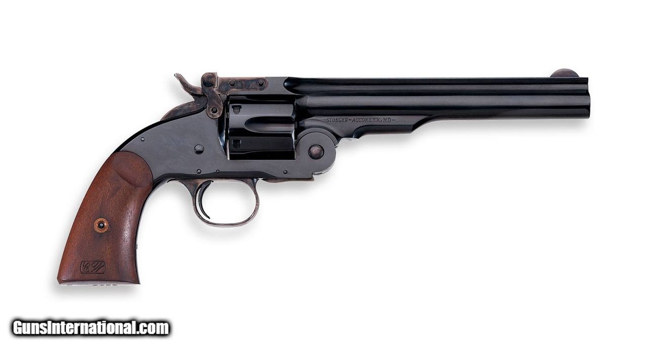 Description: Manufacturer: A. Uberti Model: 1875 No. 3 Top Break 2nd Model SKU: 348520 Caliber: .44-40 Win Capacity: 6-Shot, Fluted Barrel Length: 7" Overall Length: 12.75" Sights: F-Blade, R-Fixed Grips: Two-Piece Walnut Weight: 2.6 lbs Blue Steel Frame and Backstrap, Case-Hardened Trigger Guard Designed by Major General George Schofield, the Smith and Wesson Model 1870 "Schofield" was a revolutionary design that broke open, ejecting all six spent cartridge cases automatically while providing easy access for re-loading. Fast re-loading being a distinct advantage in his line of work, Jessie James bought a pair as did John Wessley Hardin and Wild Bill Hickok. Although the U.S. Army purchased 3,000 S&W Schofields with an improved top latch for cavalry troops, it was the Russian government that really embraced the new sidearm. With a slightly modified grip, lanyard ring and distinctive trigger-guard spur, the Czar ordered over 41,000 of the new S&W revolvers. True to the originals, Uberti Top Breaks come in all three models including the Russian model with authentic Cyrillic barrel stampings. SOLD |