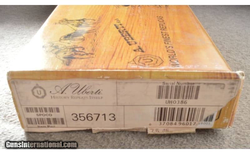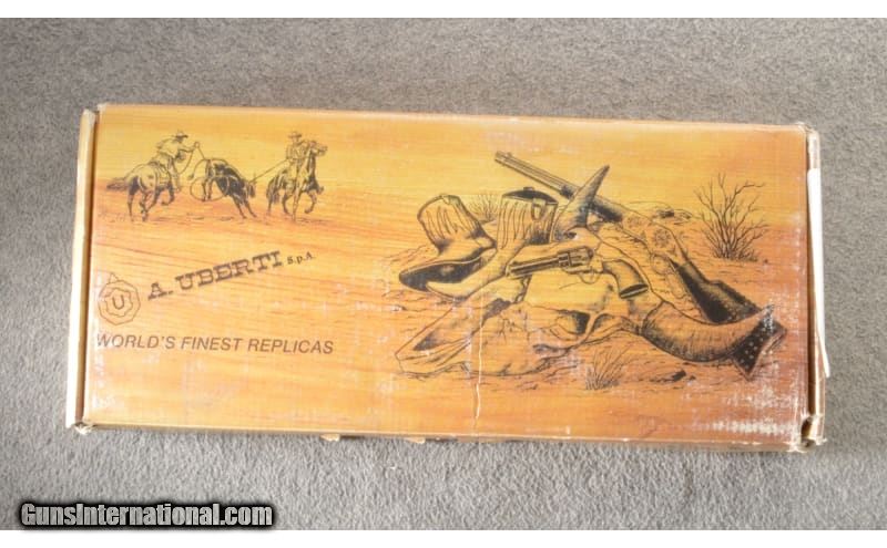 Description: This Uberti 1875 Outlaw is a replica of the 1875 Remington. This Uberti features a nickel plated steel frame, nickel plated "webbed" ejector rod tube with bright blue pins. The grips are white imitation ivory. Overall, condition is lightly used in excellent condition. Comes with a factory matched box, cable lock and paper work. .45 Colt SOLD Chambers: 6 shot revolver. Metal Condition: 99%. Bore Condition: Bright strong bore. Barrels: 7.5" barrel. Triggers: Single action trigger. Weight: 2.75 lbs Sights: Fixed. Item Location: Owatonna, MN |