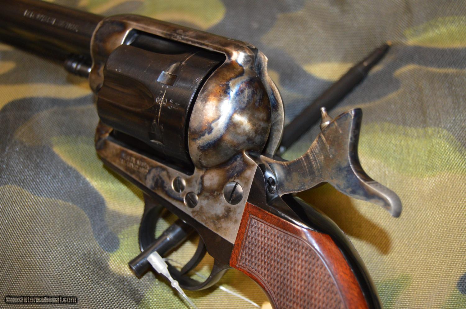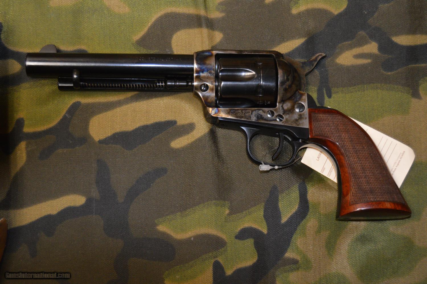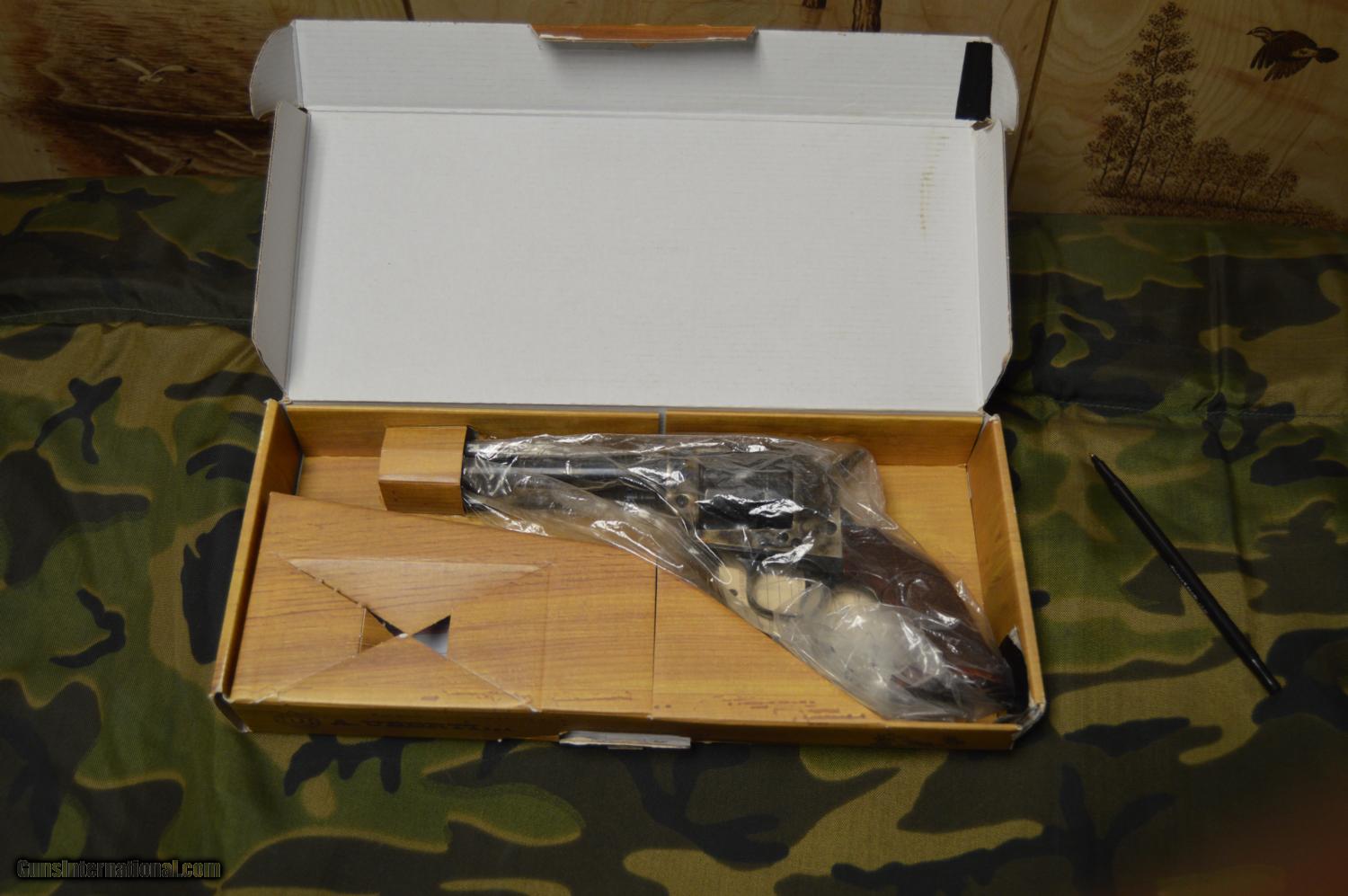 Description: This revolver is in excellent condition. it is unfired and comes in its original box. it has a beautiful color case hardened frame. the barrel is 5.5 inches long and the grips are made of checkered walnut with a six shot cylinder. the action is as smooth as ever and it holds very comfortably. SOLD |