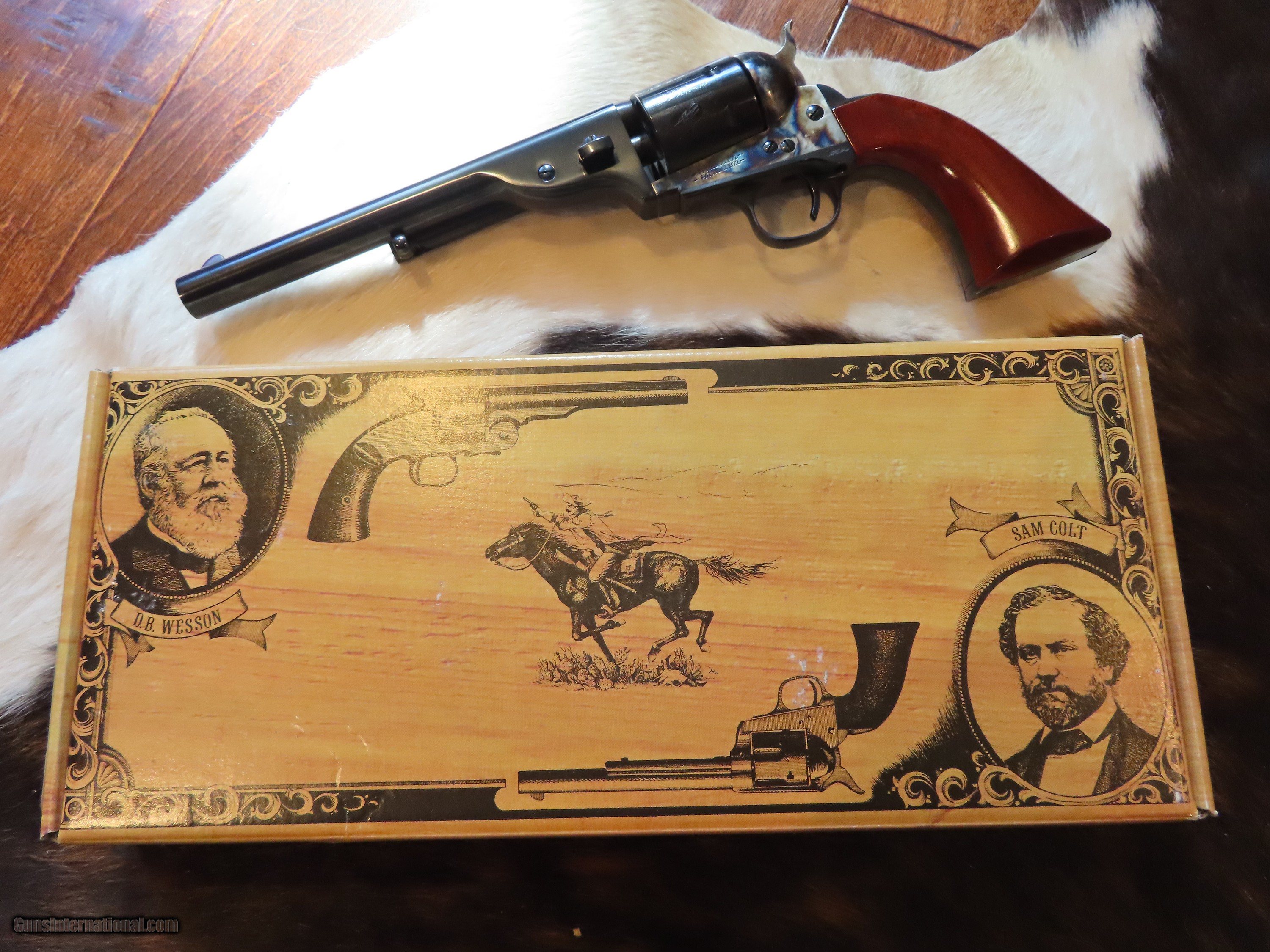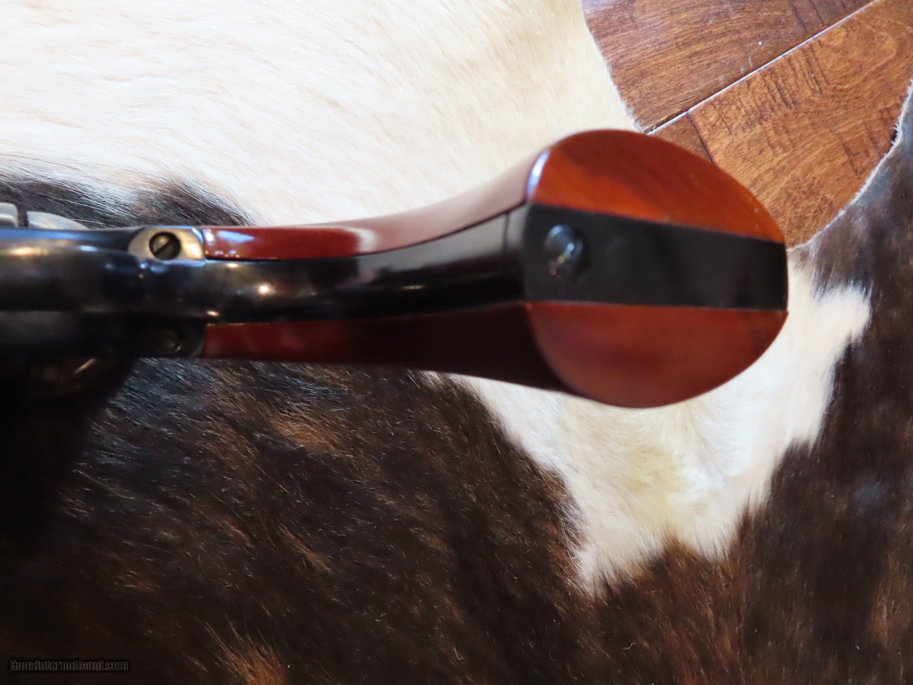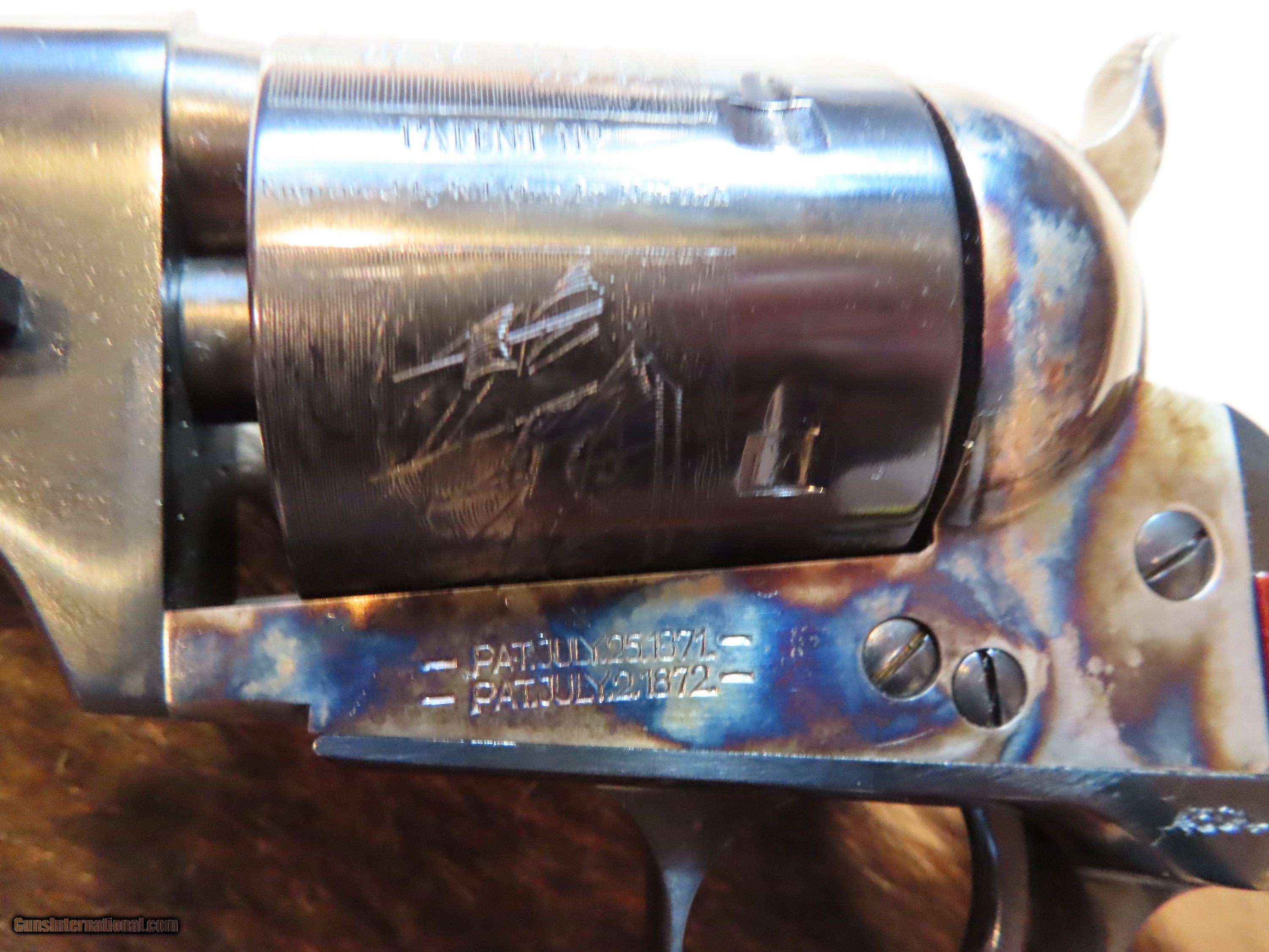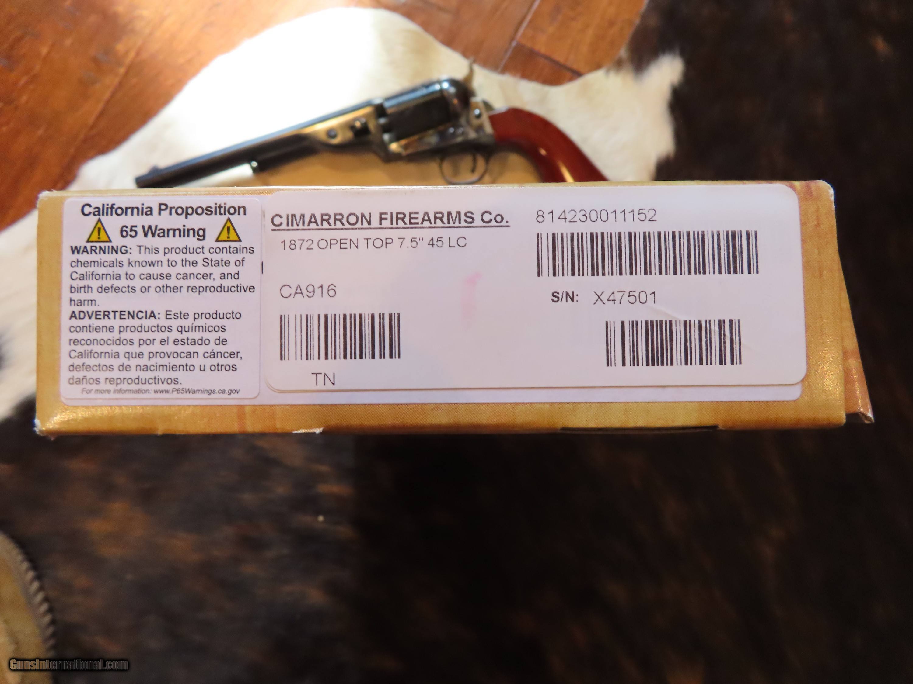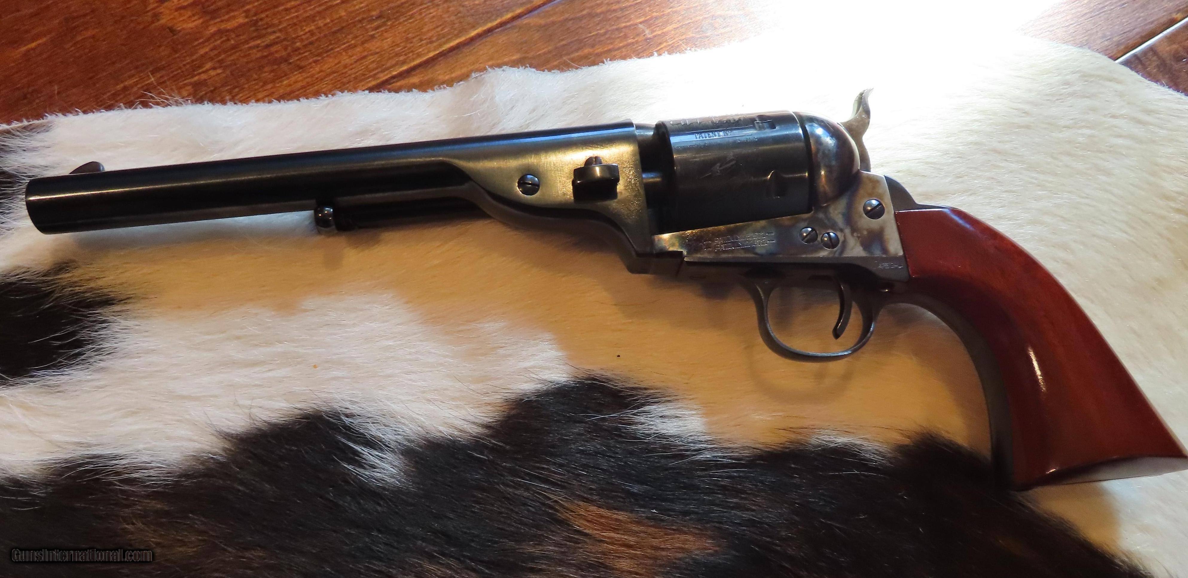 Description: THIS IS A UBERTI REPRODUCTION OF AN ARMY 1872 OPEN TOP SIX SHOT REVOLVER WITH A 7.5" BARREL IN .45 COLT. IMPORTED FROM ITALY BY CIMARRON FIREARMS. I PURCHASED THIS BEAUTIFUL REVOLVER AT THEIR FACTORY STORE, TEXAS JACK, IN FREDERICKSBURG, TEXAS. A STUNNING FEATURE OF THIS REVOLVER IS THE ENGRAVED CYLINDER WITH SEVERAL LARGE SAILING WARSHIPS. THIS REVOLVER HAS BEEN USED BY ME AND BEEN FIRED APPROXIMATELY 6 ROUNDS. EXCELLENT CONDITION, I ESTIMATE 98%. ORIGINAL BOX WITH ORIGINAL PAPERWORK. I AM NOT A DEALER BUT A COLLECTOR. SOME INFO FROM CIMARRON: 7.5 " in 45LC.These are reproductions of Colts that were converted to cartridge by Charles Richards and William Mason-Colt in the 1870's. This one in 45LC with 7 1/2 barrel with the larger Army grip. I PREFER A USPS MONEY ORDER IN PAYMENT FOR IMMEDIATE SHIPPING BY MY FFL TO YOUR FFL. ALSO ACCEPTABLE IS A PERSONAL CHECK, WHICH WILL NEED TO CLEAR MY BANK PRIOR TO SHIPPING. SHIPPING FFL TO FFL COST IS $55. NO INTERNATIONAL SALES OR TO CA, NY OR NJ. ADD THIS BEAUTIFUL PIECE TO YOUR COLLECTION OR JUST SHOOT IT FOR FUN AND GET AN IDEA OF BEING IN THE INDIAN WARS IN 1872! MATT HARTNETT BOERNE, TEXAS SOLD Handgun Caliber: .45 Colt |