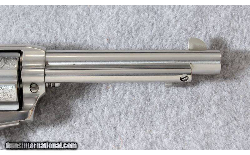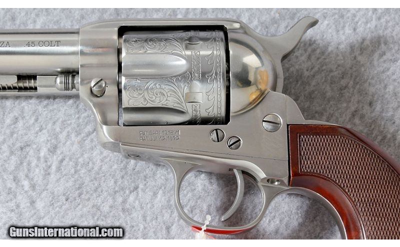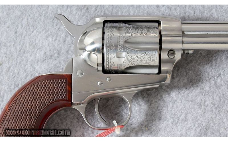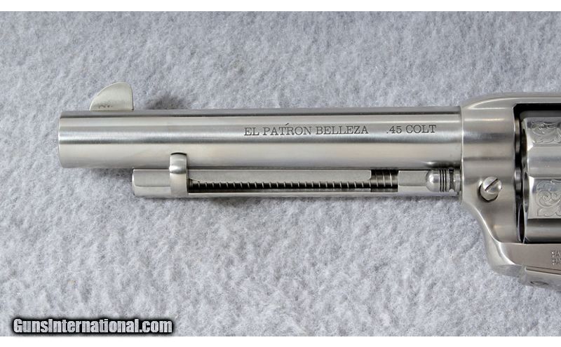 Description: The Uberti's Cattleman El Patrón Belleza is a hand-tuned 1873 Cattleman model. The Belleza sports an elegant floral engraving on the cylinder. The period-appropriate pattern is laser-etched and features classically-inspired acanthus leaves. The gunsmiths at Uberti have fitted each El Patrón with high-grade, U.S.-manufactured Wolff® springs. And each revolver has been carefully tested and certified for fit and function. They are reliable, light, and fast, with a smooth-tuned action. Manufactured 2018. .45 Colt SOLD Metal Condition: As new Wood Condition: As new Bore Condition: As new Barrels: 5 1/2 inch barrel Triggers: Single action Weight: 37 oz. Item Location: Lehi, UT |