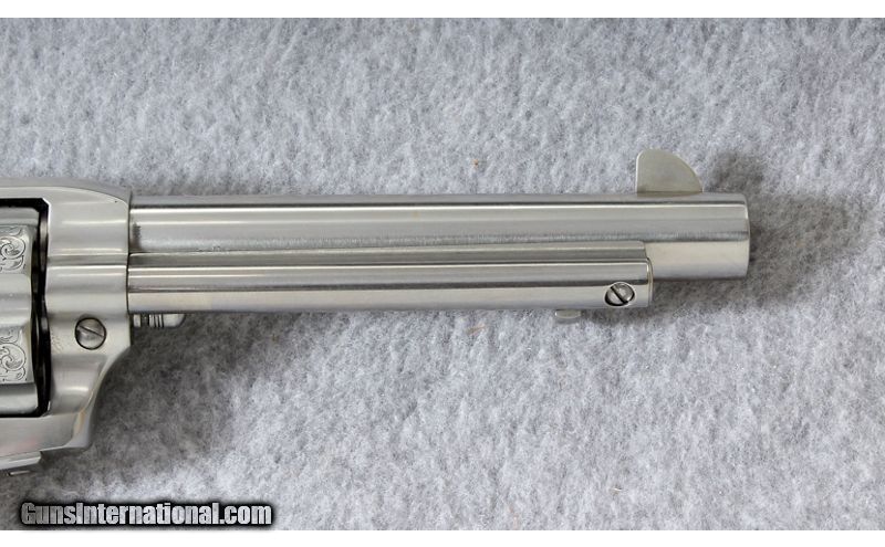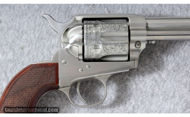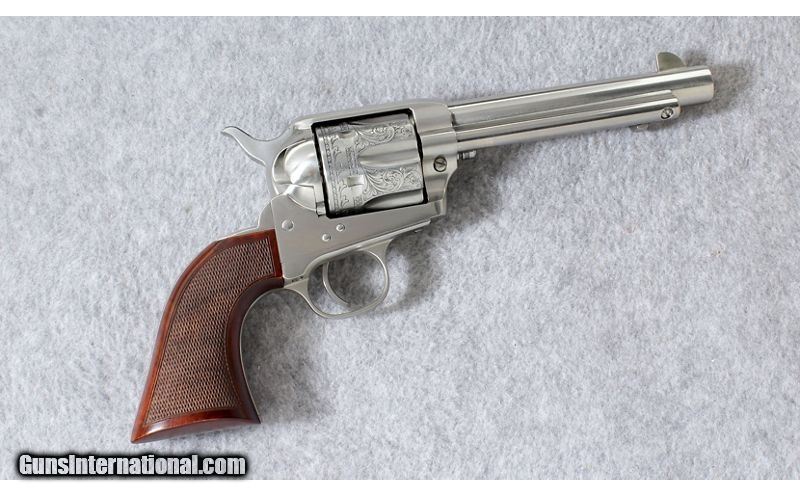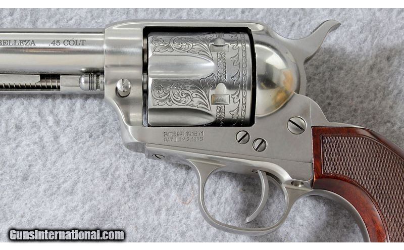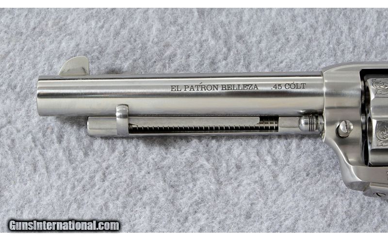 Description: The Uberti's Cattleman El Patrón Belleza is a hand-tuned 1873 Cattleman model. The Belleza sports an elegant floral engraving on the cylinder. The period-appropriate pattern is laser-etched and features classically-inspired acanthus leaves. The gunsmiths at Uberti have fitted each El Patrón with high-grade, U.S.-manufactured Wolff® springs. And each revolver has been carefully tested and certified for fit and function. They are reliable, light, and fast, with a smooth-tuned action. Manufactured 2018. .45 Colt SOLD Metal Condition: As new Wood Condition: As new Bore Condition: As new Barrels: 5 1/2 inch barrel Triggers: Single action Weight: 37 oz. Item Location: Lehi, UT |