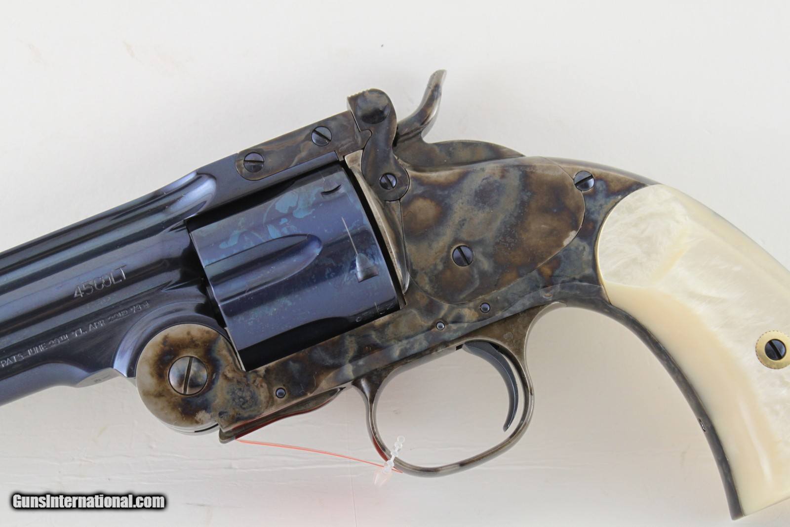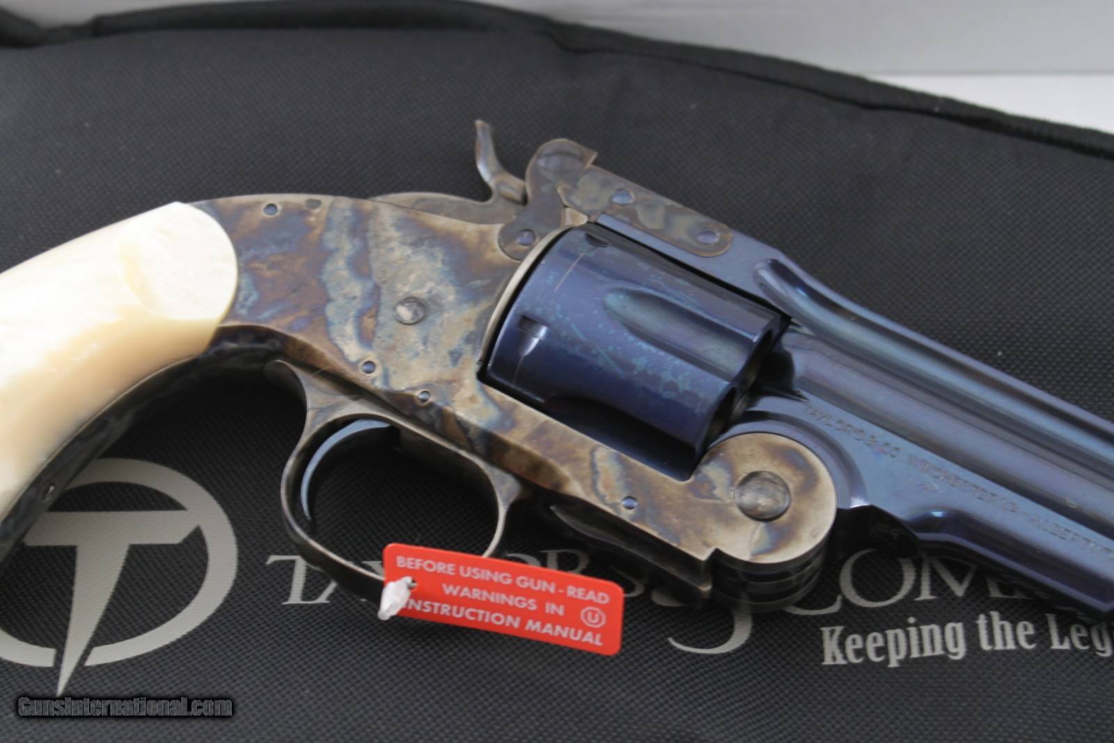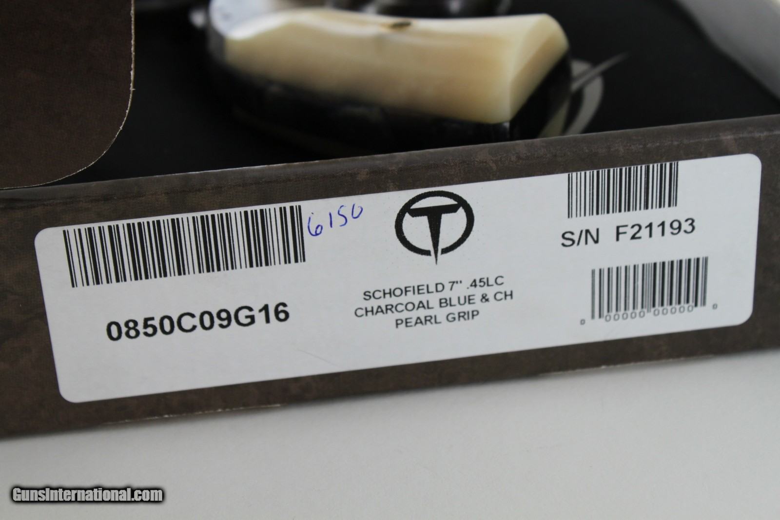 Uberti Schofield by Taylor, 45 Long Colt, 7 inch bbl, Charcoal Blue/case hardened Finish, Factory Im. Pearl Grips, factory box and case.
