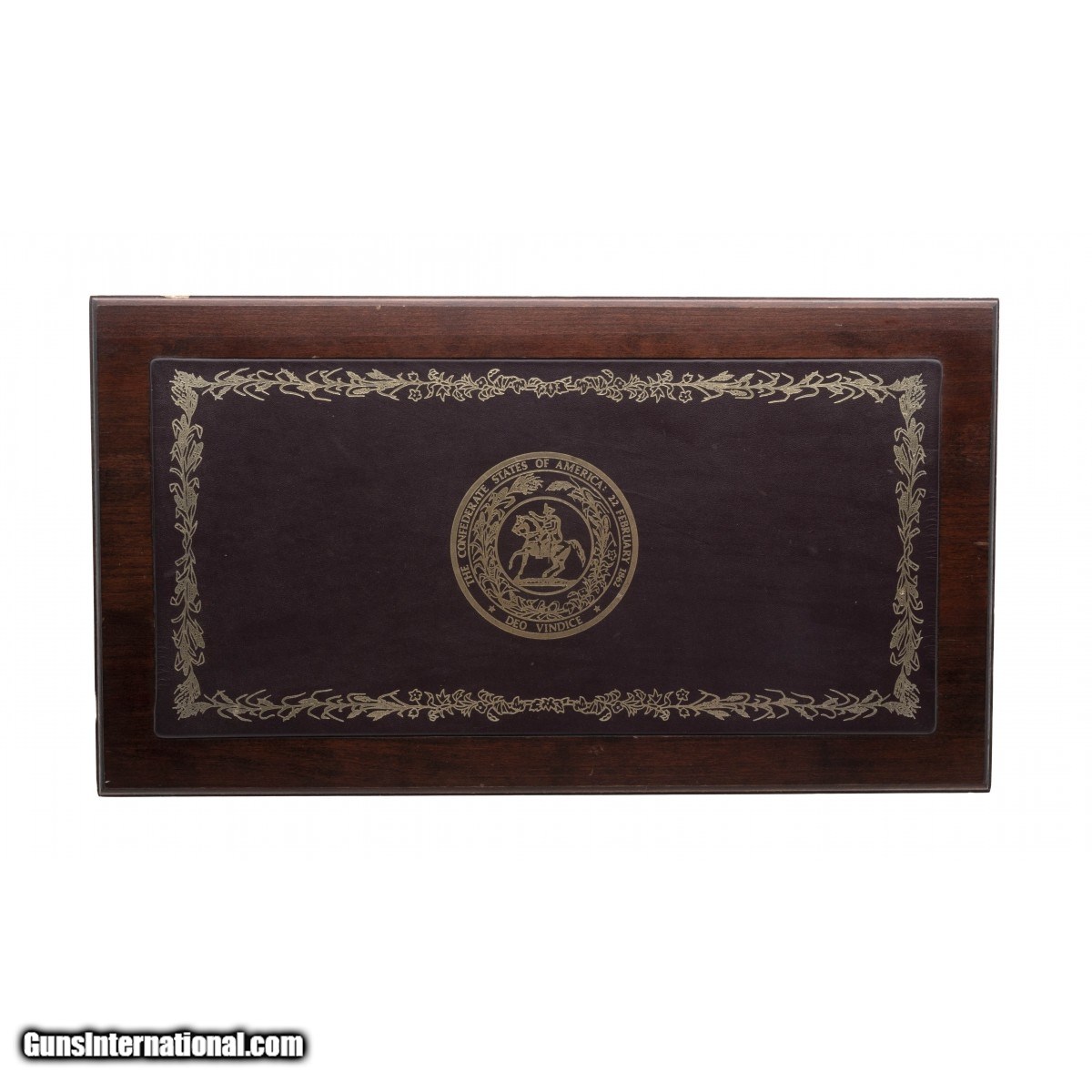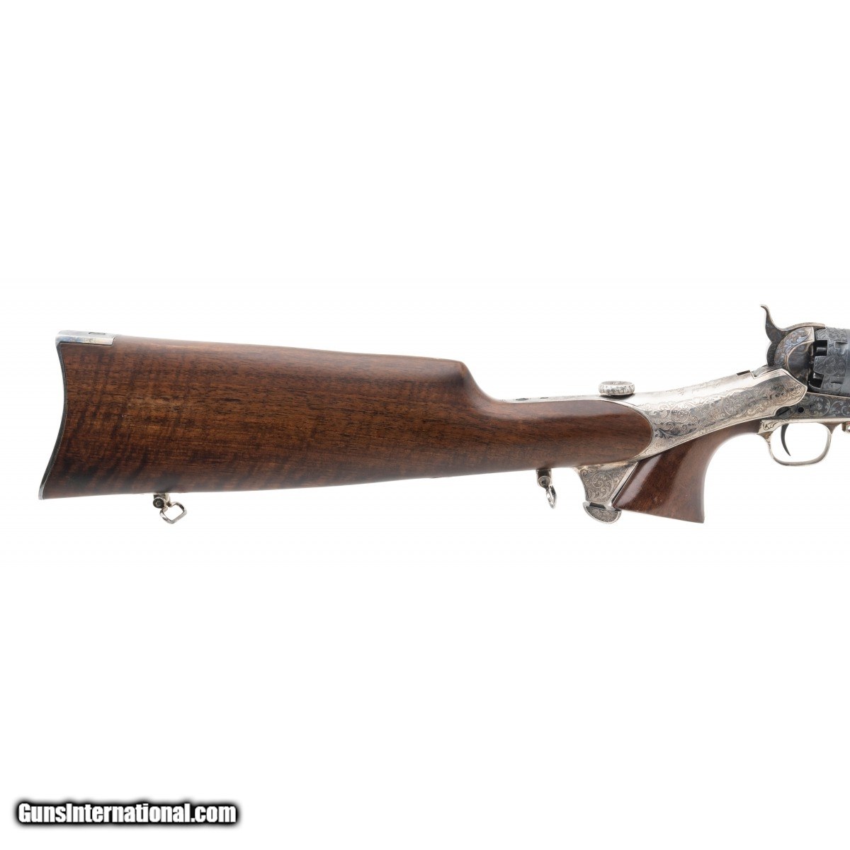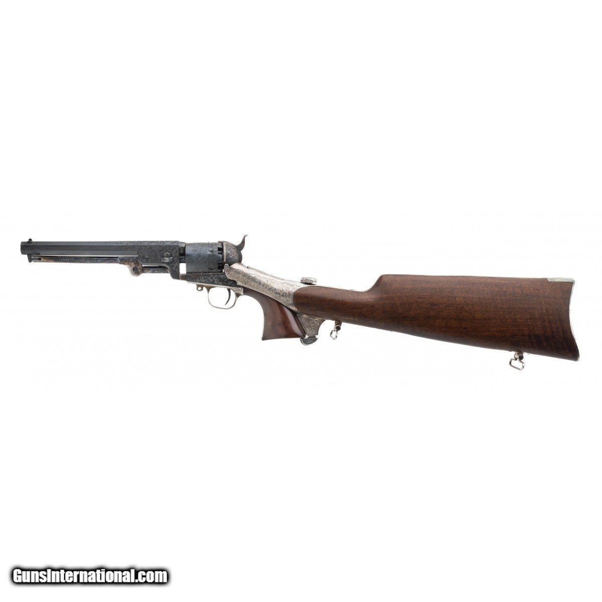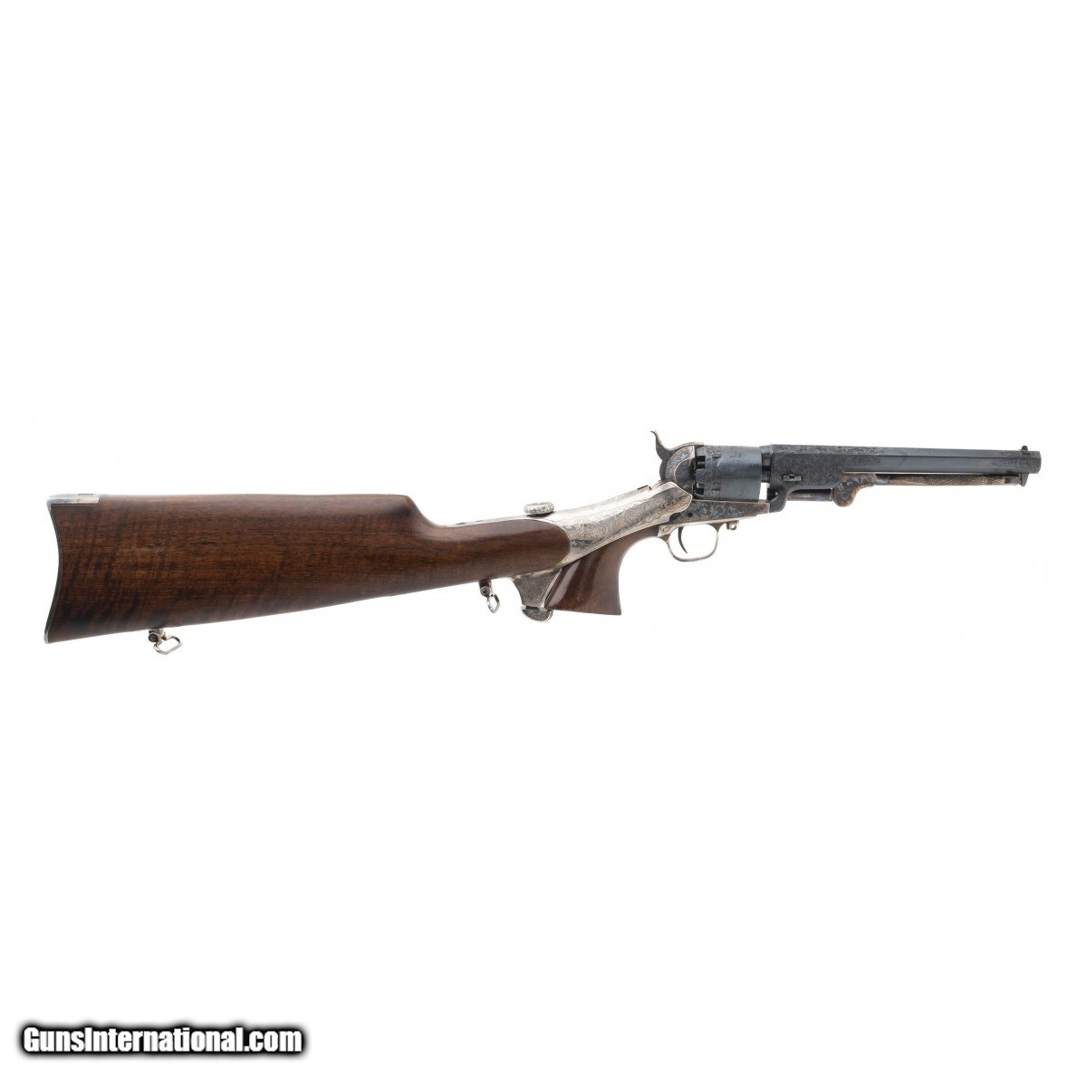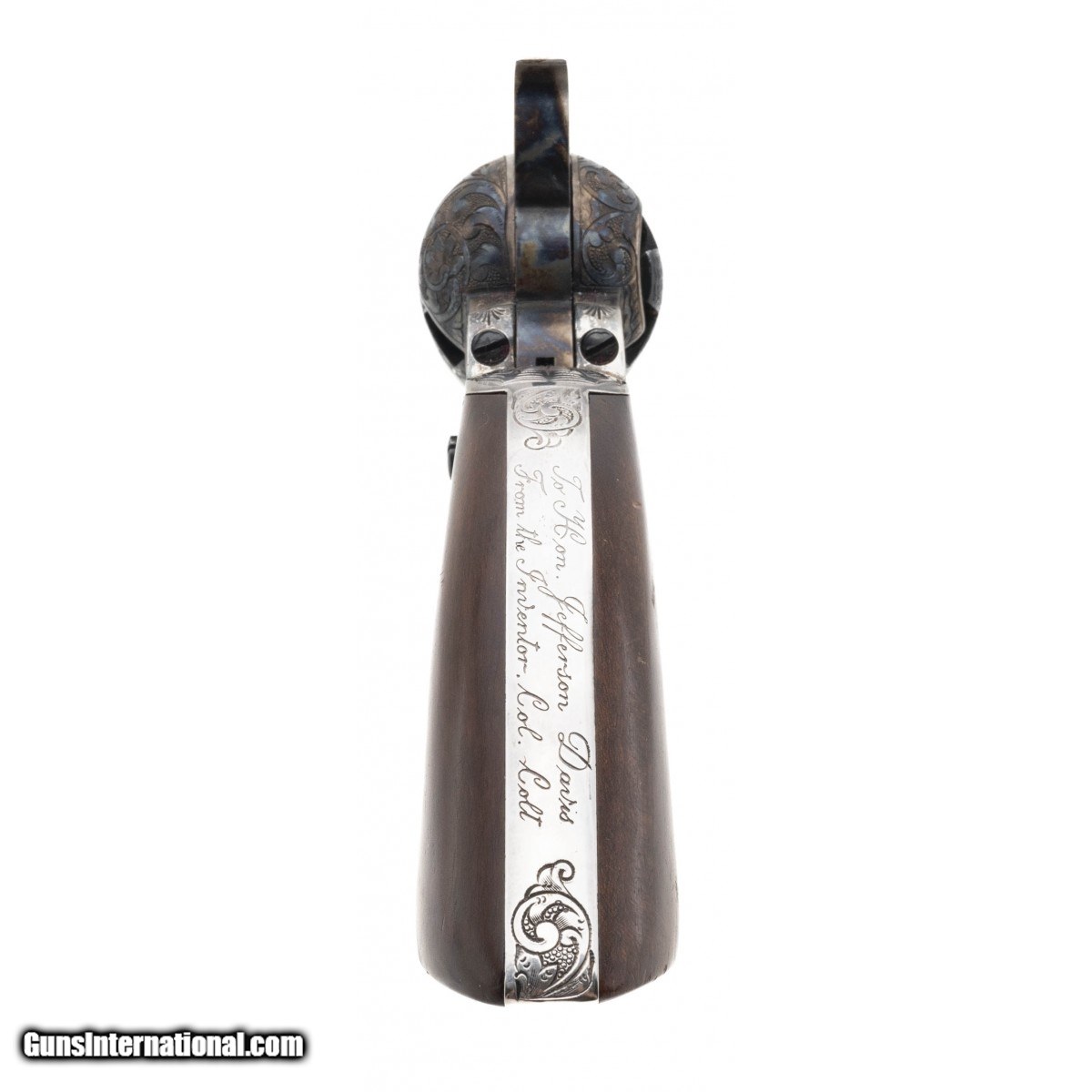 Description: " Jefferson Davis commemorative 1851 Navy blackpowder revolver issued by the U.S. Historical Society. Comes in a wooden presentation case with a detachable buttstock and accessories. The gun is beautifully engraved and is inscribed on the backstrap ""To Hon. Jefferson Davis / From the Inventor Col. Colt"". A beautiful set. SOLD |