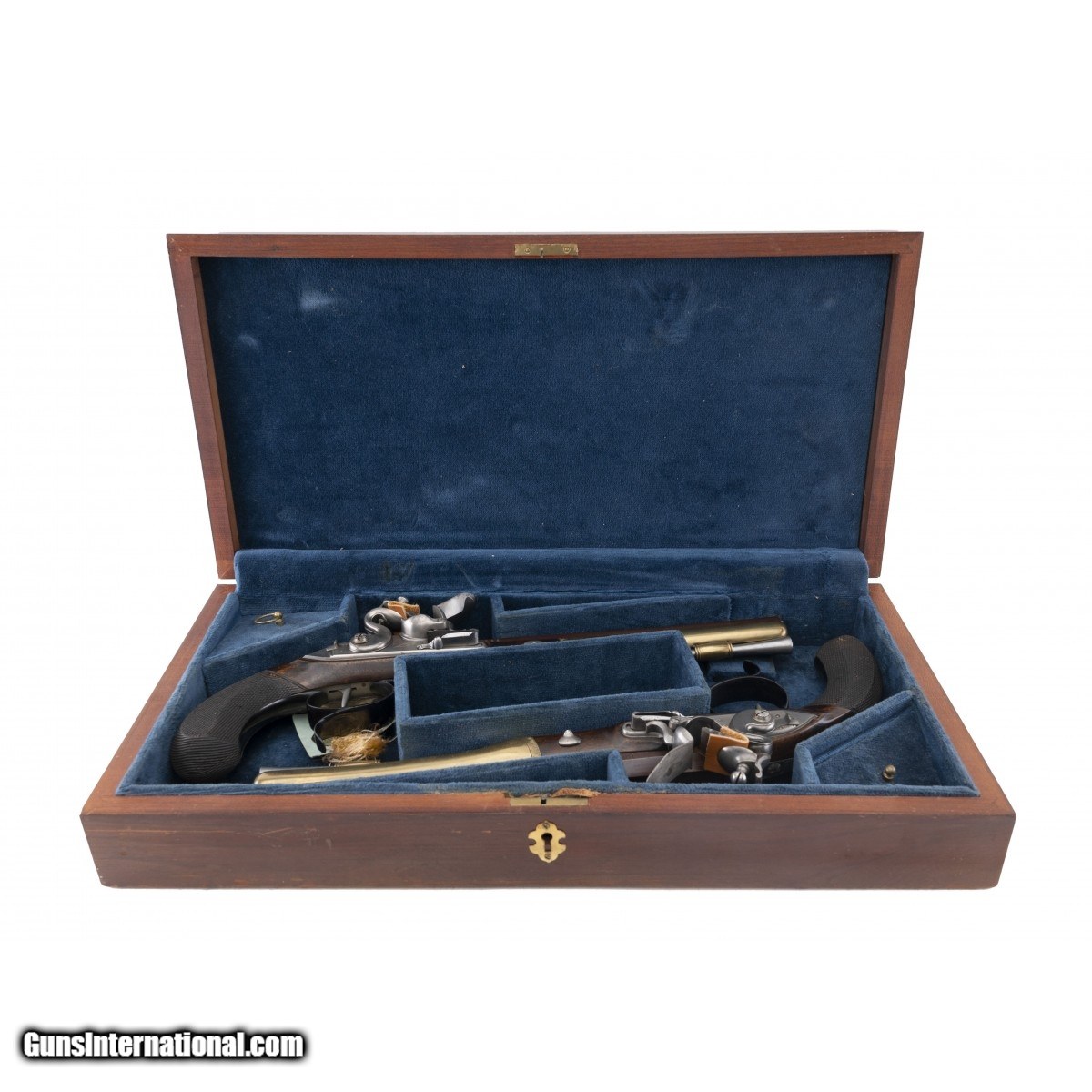 Hamilton-Burr commemorative cased pair of flintlock pistols. Locks are inscribed ""Wogdon"". Barrels have a nice armory brown finish, with pistol B having having some minor loss, of finish, on side that rests in case. Grips are nicely checkered. A good looking pair of commemorative dueling pistols.