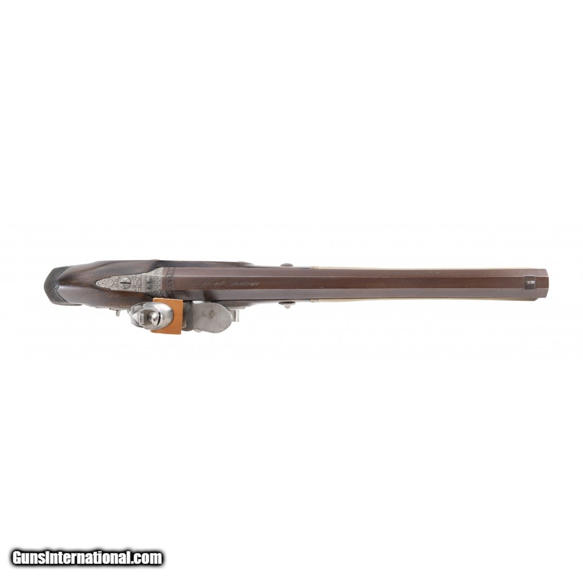 Description: " Hamilton-Burr commemorative cased pair of flintlock pistols. Locks are inscribed ""Wogdon"". Barrels have a nice armory brown finish, with pistol B having having some minor loss, of finish, on side that rests in case. Grips are nicely checkered. A good looking pair of commemorative dueling pistols. SOLD |