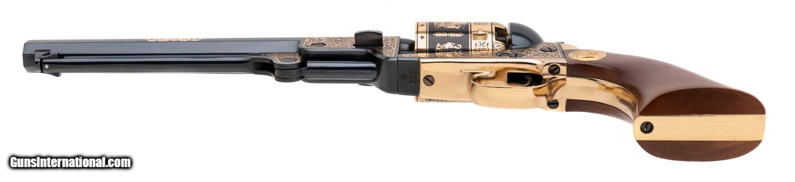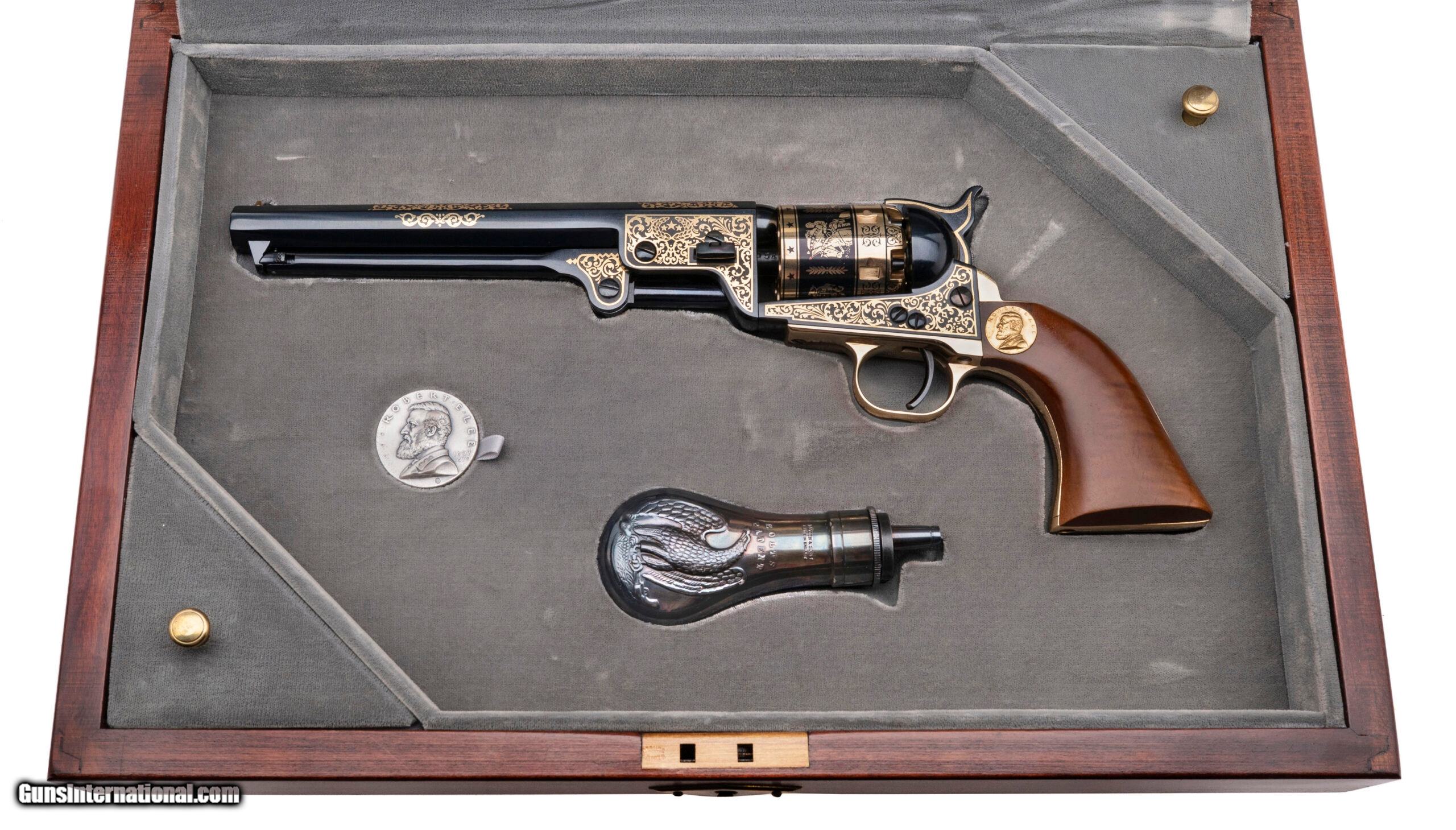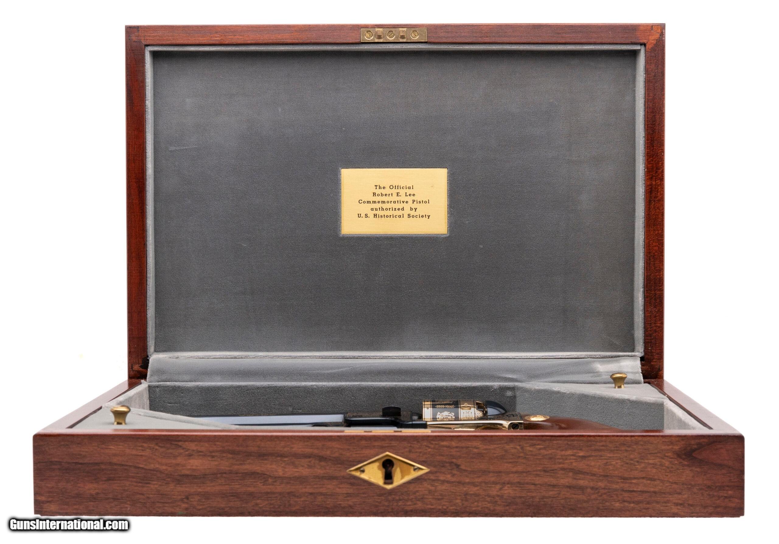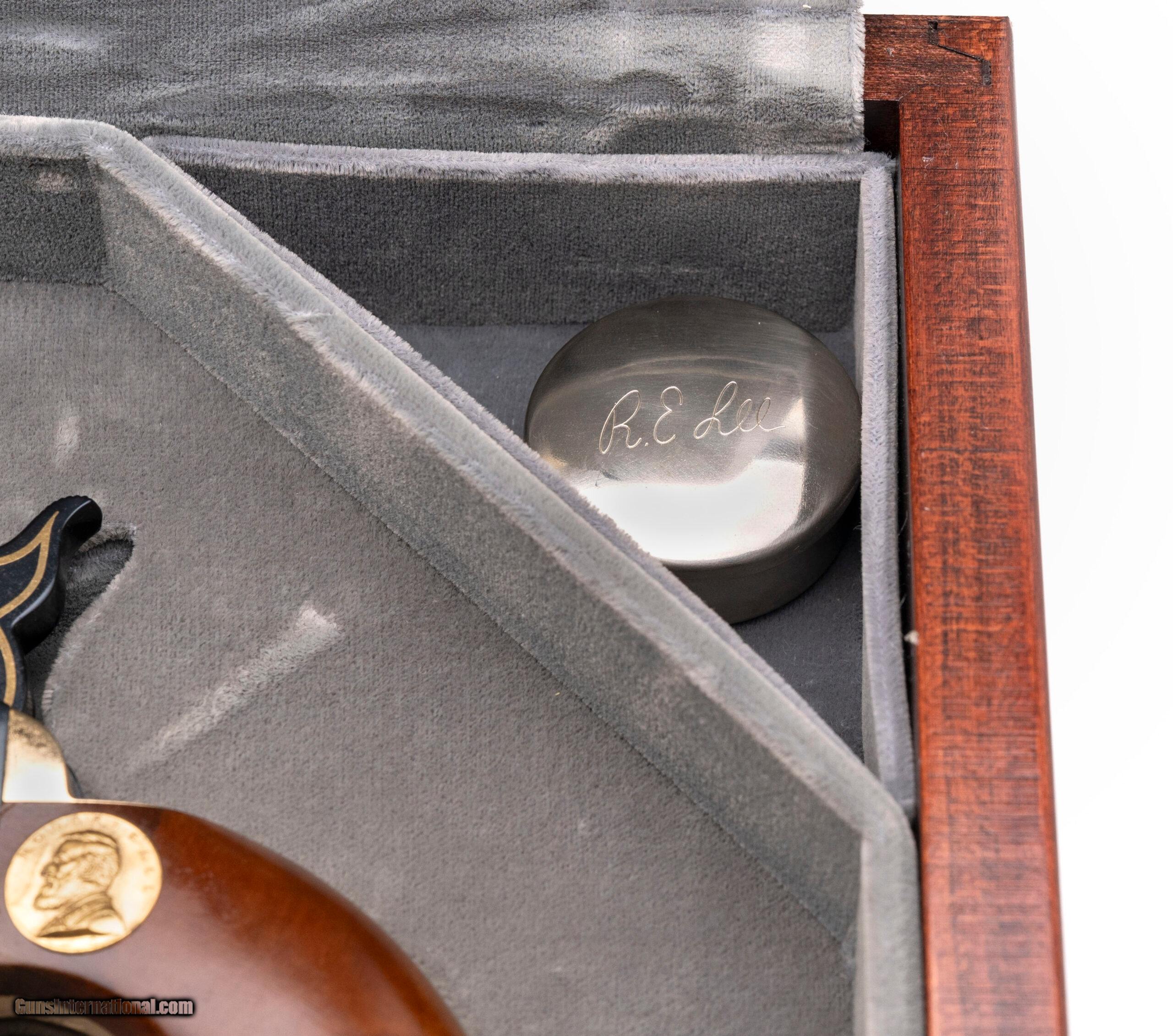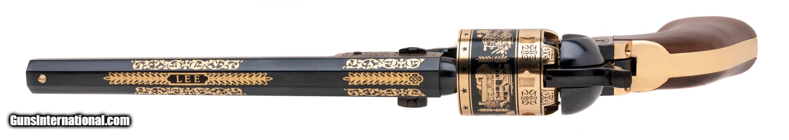 Description: "Made circa 1980's. Robert E. Lee Commemorative black powder 1851 Navy revolver embellished with gold scroll and scenes. Excellent condition with presentation case, accessories and papers. SOLD |