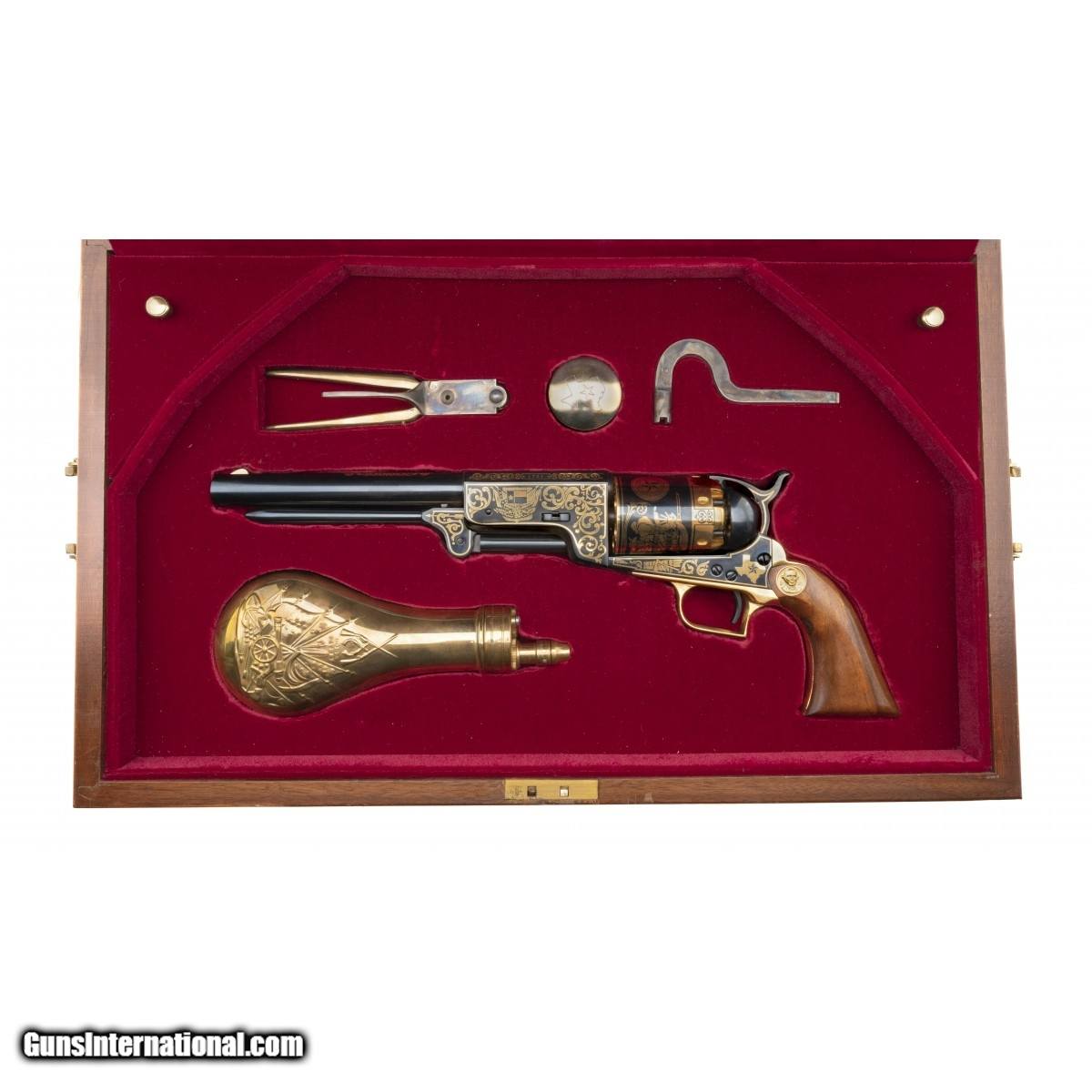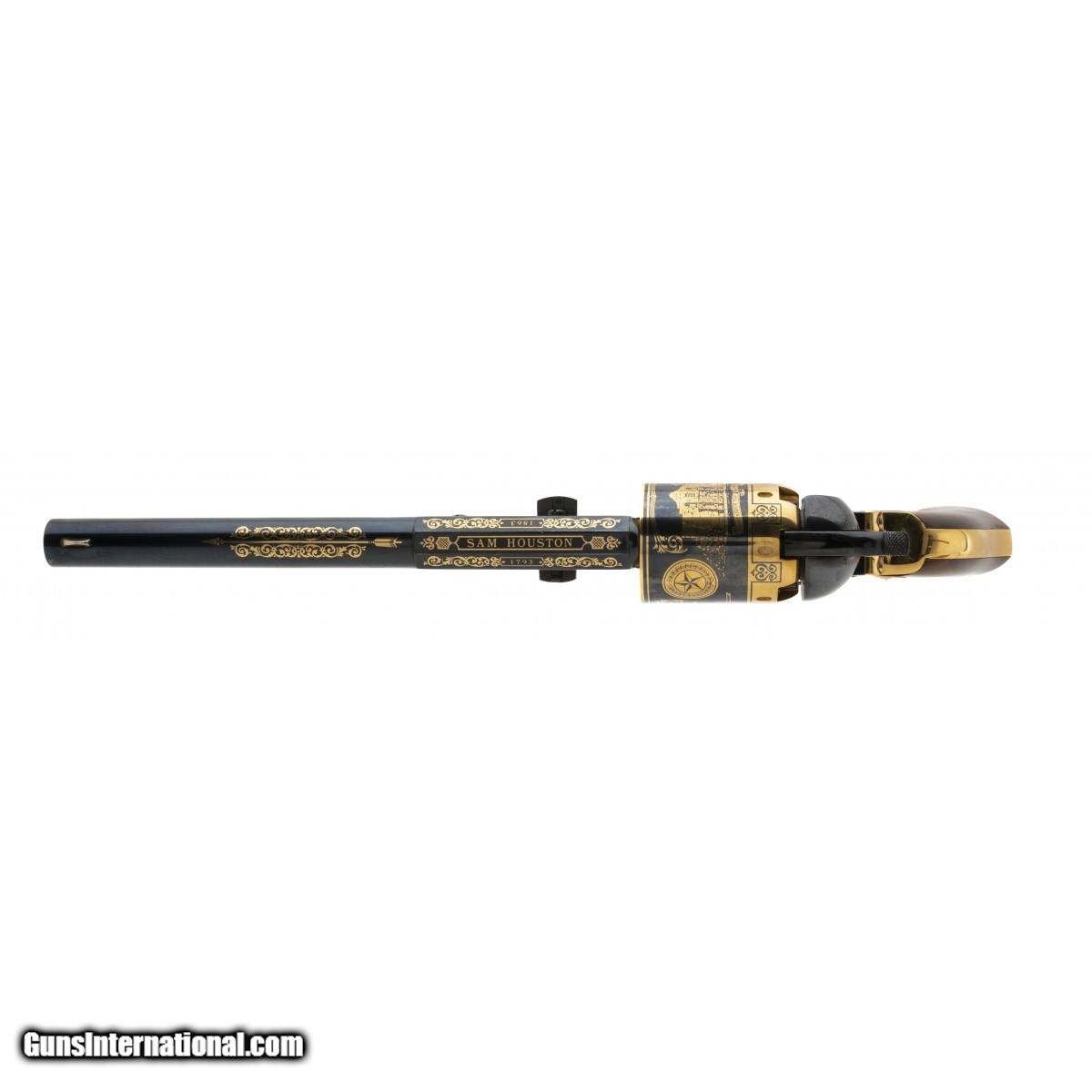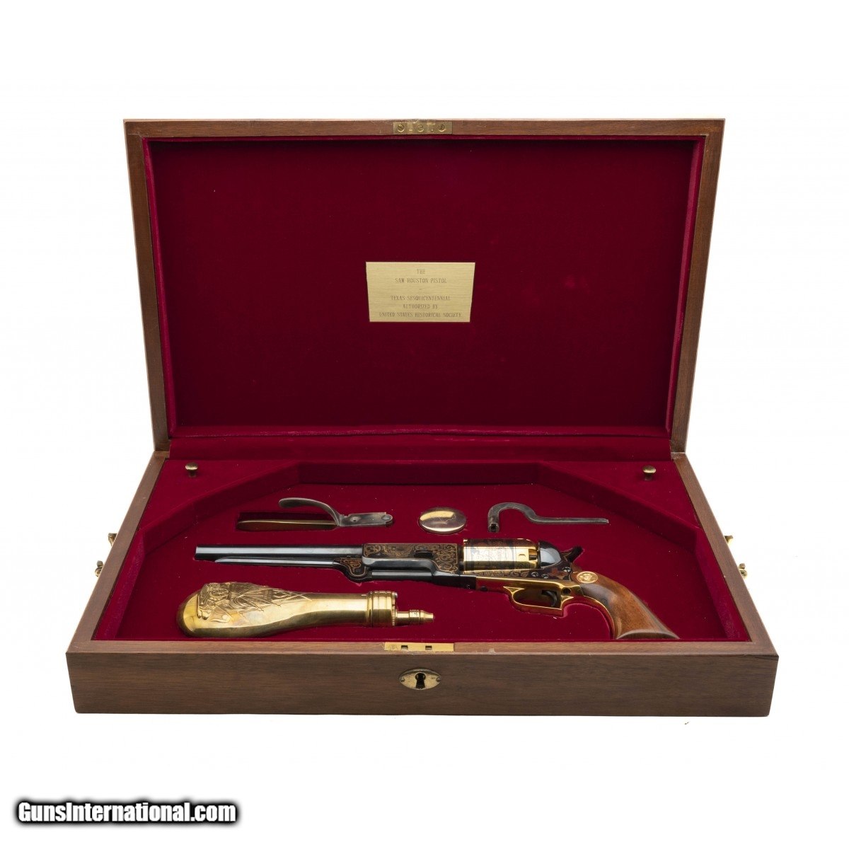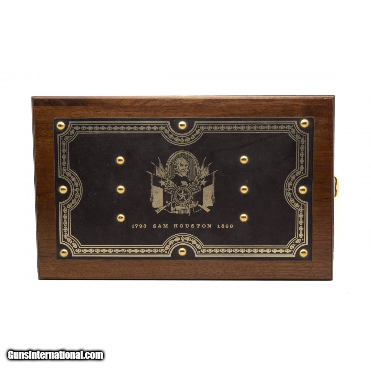 Beautiful Sam Houston Commemorative. Revolver has gold motifs commemorating the Alamao and San Jacinto along with Sam Houston. Excellent condition with display case and accessories.