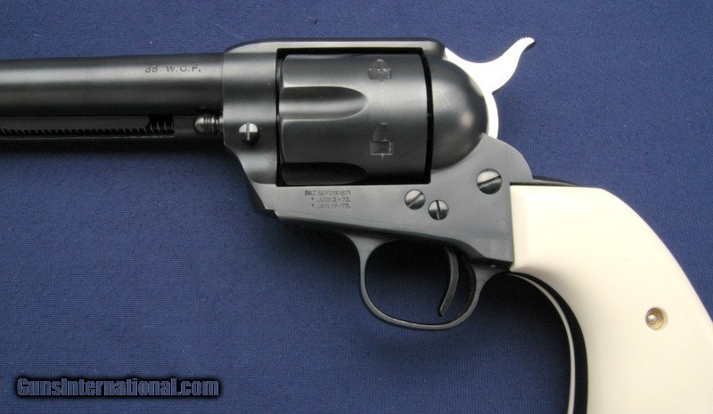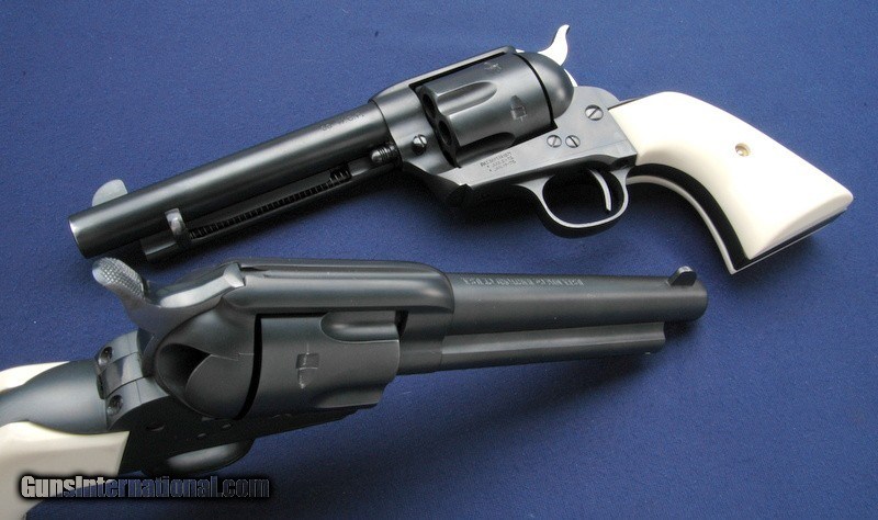 Description: Screaming deal of the day!!! Consecutive numbered PAIR of USFA Rodeo single action revolvers. Priced to sell fast at $1699.99!! Includes 2 quality custom holsters by Dennis Yoder out of Hamburg, PA. The maker is passed now, but I believe these are examples of his "Boot Hill" pattern. A size 40? gunbelt from Triple K and an aluminum hardcase are also included. No papers nor the original boxes are included in this sale. Both revolvers are in identical condition, with 5.5" barrels, possibly used in 1 or 2 SASS competitions. Both have spotless bores and fantastic triggers. Both have polymer ivory-like grips. Very light turn rings, some high edge wear at the muzzles and trigger guards, a few light scuffs from use. No buggered screws, deep scratches or any other surprises. This is seriously a very good deal on a lightly used consecutive pair of perfect SASS competition guns. No single action you've ever handled locks up as tight as a USFA. They bleed quality. $85 shipping for the pair to the lower 48. 3% surcharge for using a CC. If you pay with a personal check, you can expect us to hold the item for up to 10 days. SOLD |