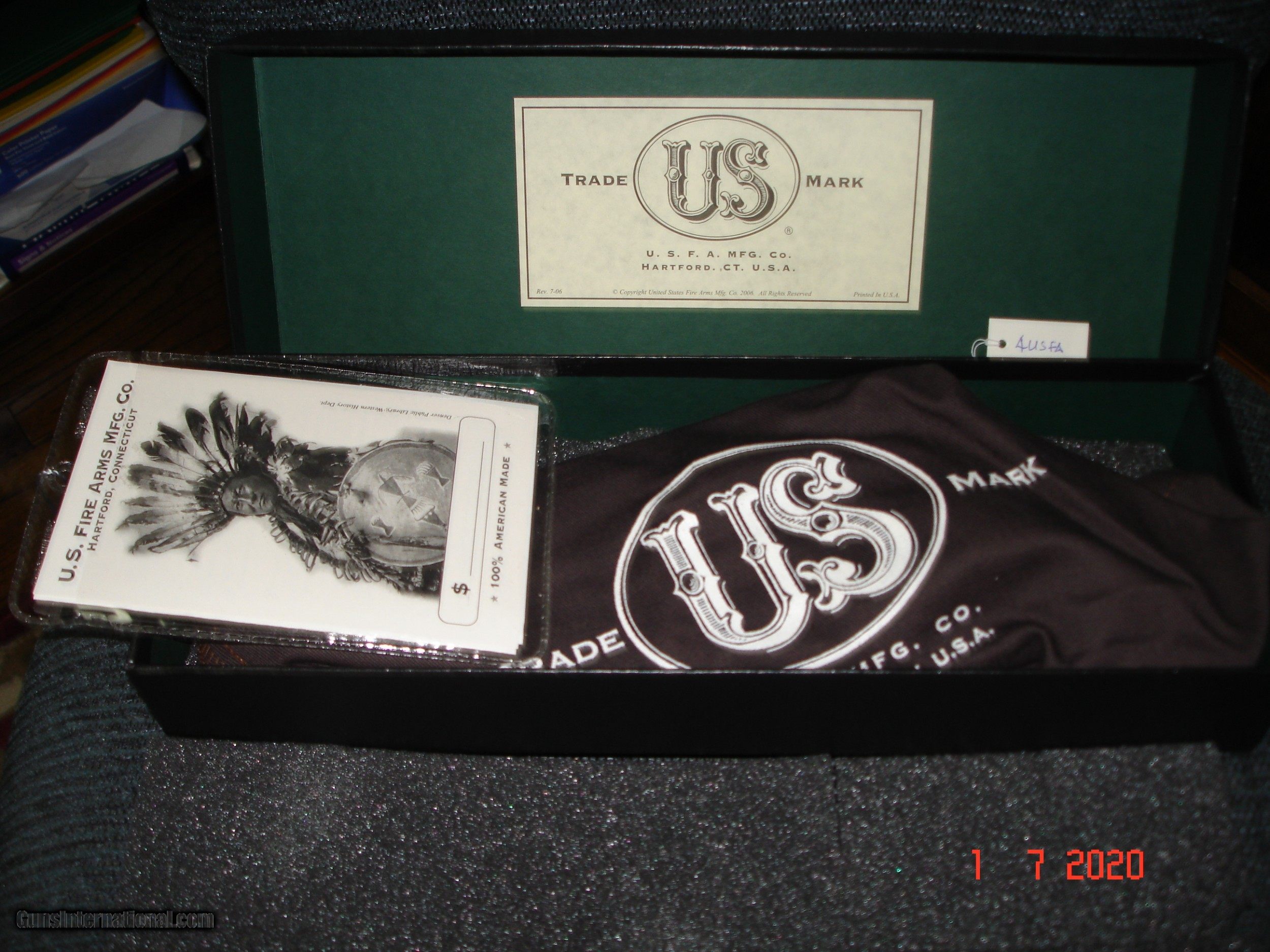 Description: Very Rare USFA 15th Anniversary Edition SA revolver. There were only 15 made,This is Number # 4. USFA Single action .45 Colt caliber with a 5 1/2" BBl. Beautiful Blue & case color by Turnbull. Factory Engraved full C coverage., with Special US Logo in the back strap.Walnut 2- piece stocks with gold US medallions. This is 1 of only 15 made. This is Number # 4, Made in 2009 SER#. 4USFA New in the Box, with manual, papers and sock Etc. A very Rare USFA Revolver! Special $5499.00 Shipping & Ins.to your FFL $40.00 Ask about our Free Layaway,s! Sale Pending SOLD |