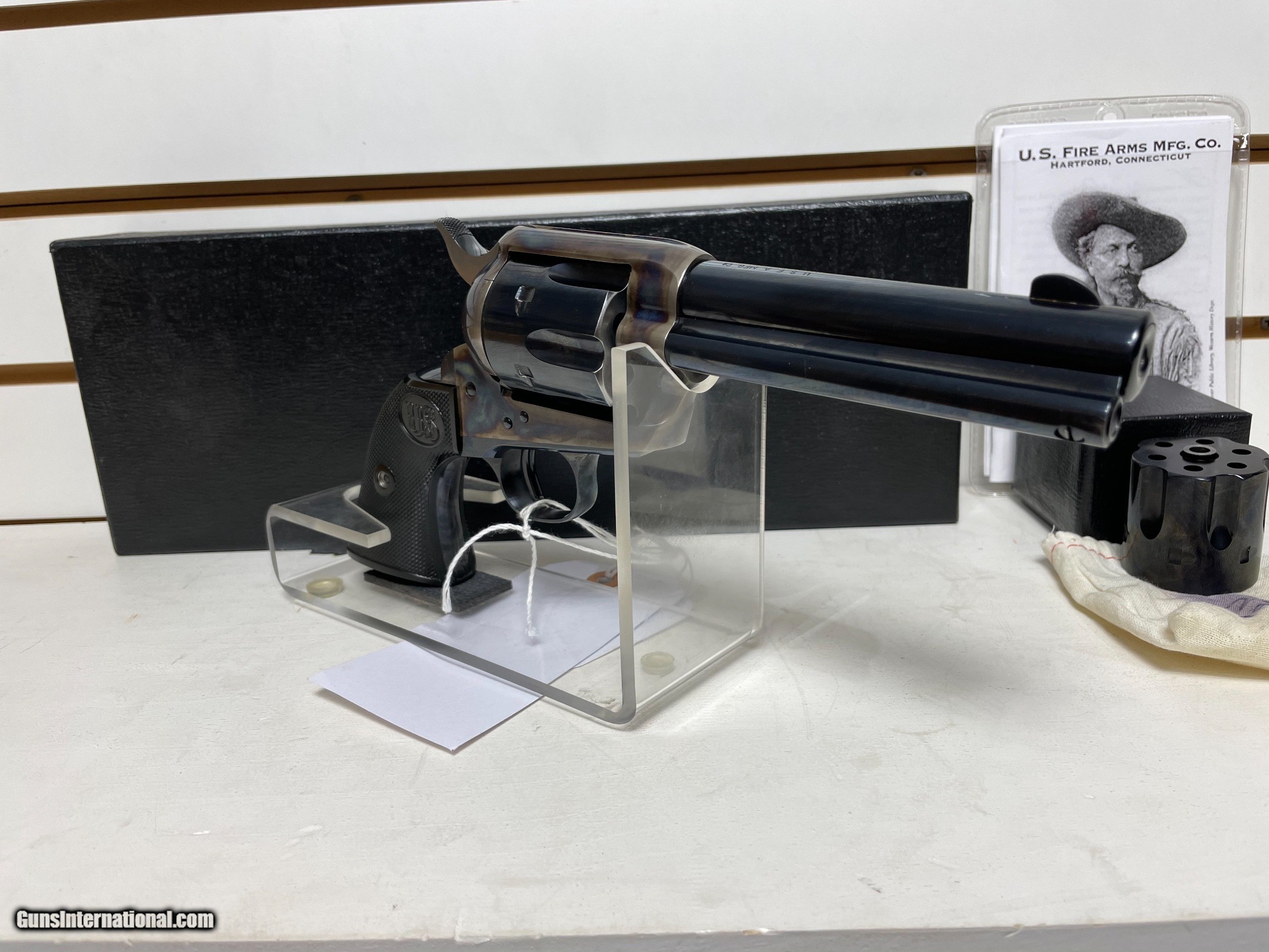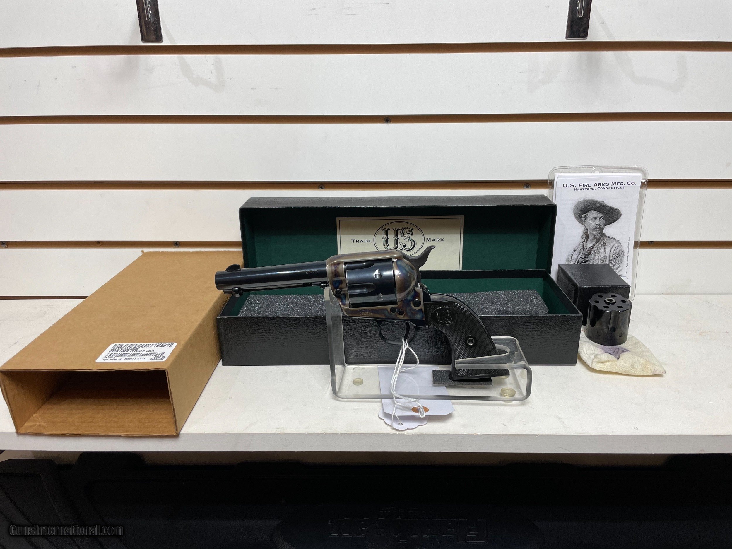 Description: USFA’s Plinker is a classic, full-size Single Action revolver chambered in .22 LR with a six-round capacity. It’s built on a special cross-pin rimfire frame and comes standard with an extra cylinder chambered in .22 WMR. Other features include black hard-rubber grips, either a nickel finish or a bone case and blue finish with a white-sided hammer (a color case hammer is optional), a square-notch rear sight and a front blade sight. SOLD Handgun Caliber: .22 Long Rifle, .22 WMR (.22 Magnum) Manufacturer: USFA Model: Plinker Serial Number: 28147 |