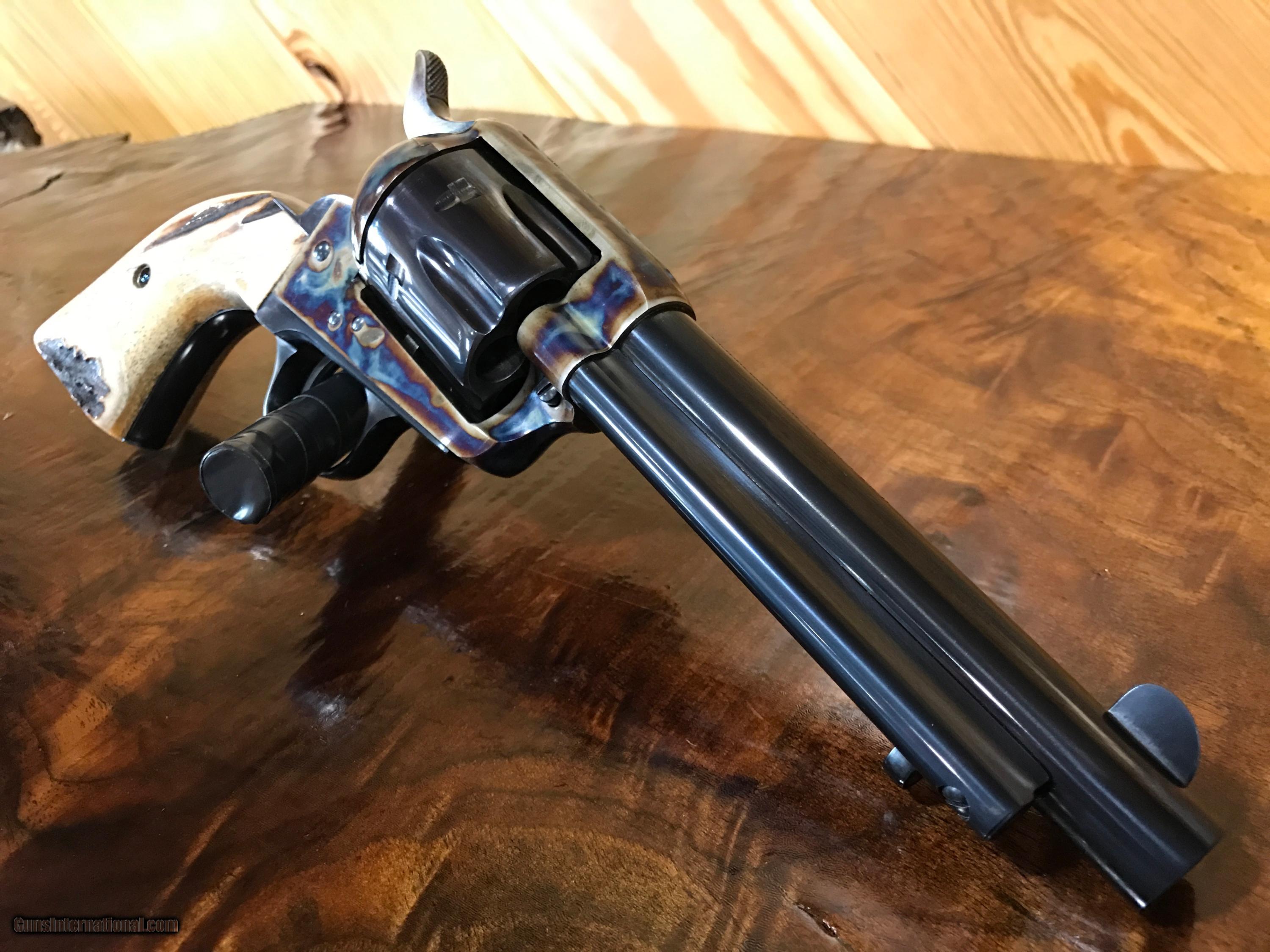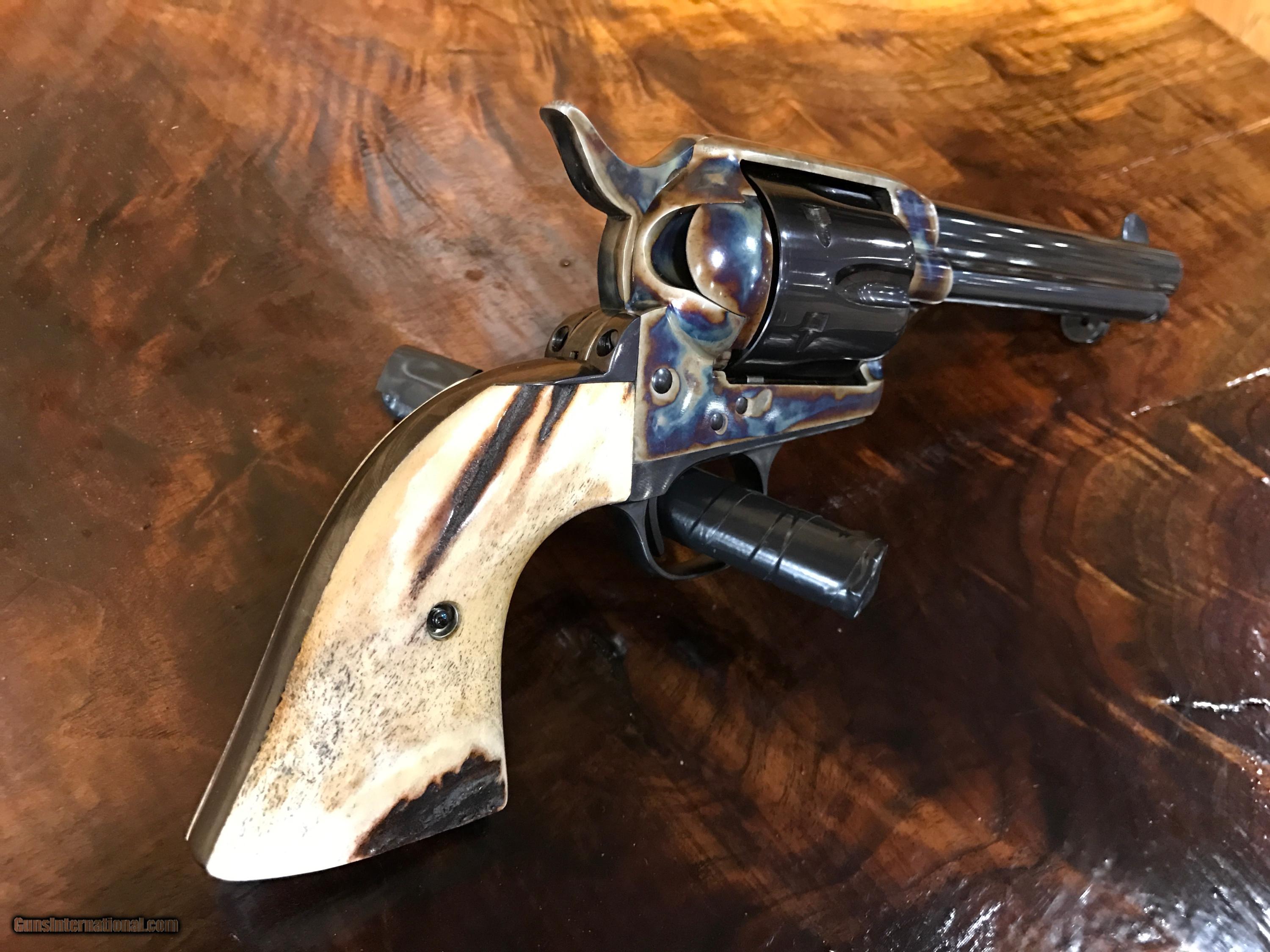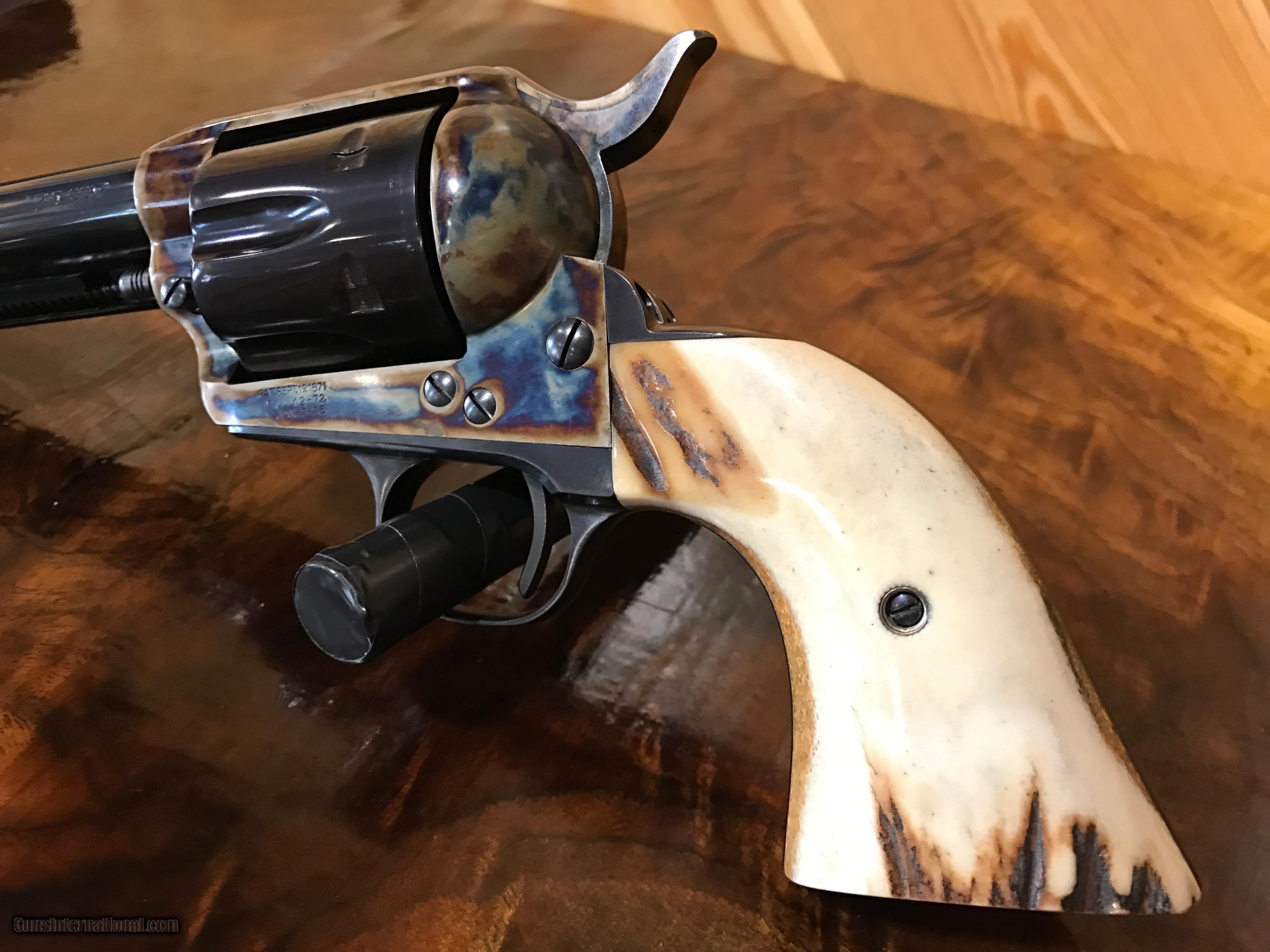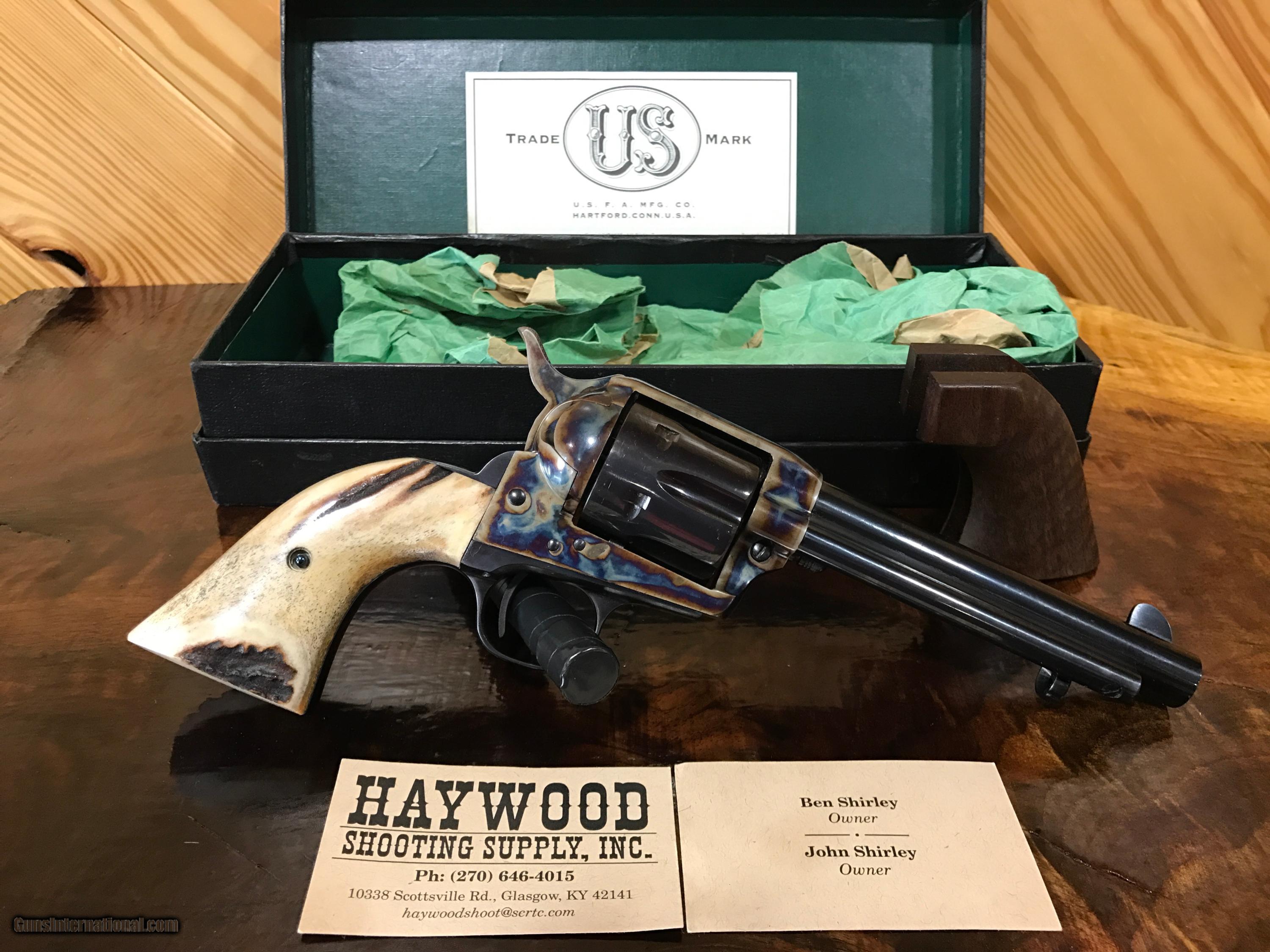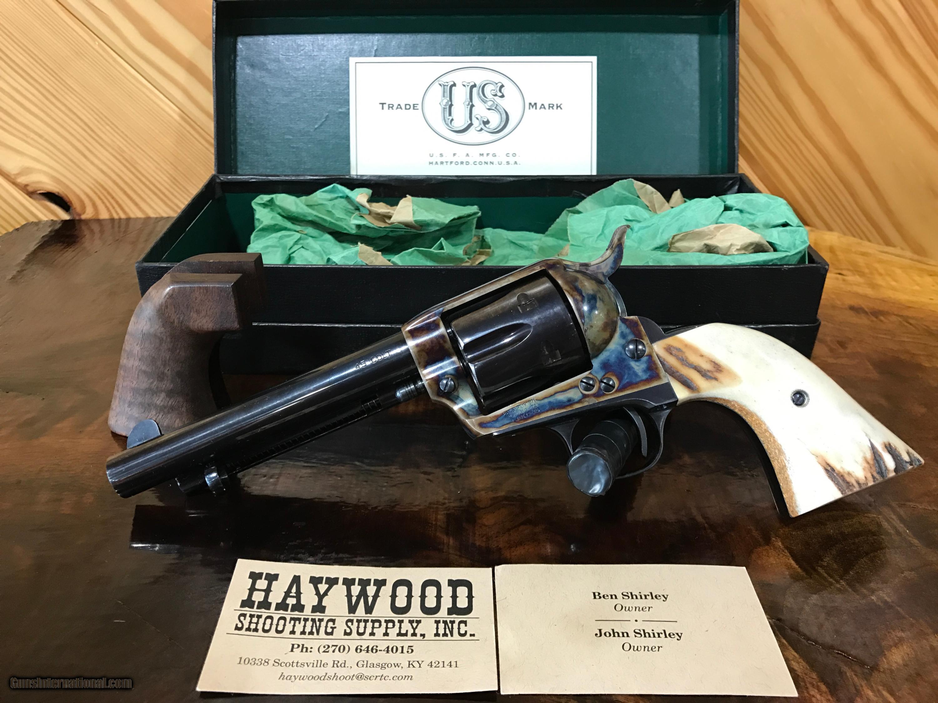Description: THIS IS A BEAUTIFUL USFA .45 LONG COLT NEW IN THE ORIGINAL BOX WITH A 5" BARREL AND A CASE HARDEN FINISH. THIS GUN COMES WITH A SET OF BEAUTIFUL STAG GRIPS, ALONG WITH THE GRIPS RECIEPT, AS WELL AS THE ORIGINAL GRIPS. + $35.00 SHIPPING CHARGE ***SORRY, NO SALE TO CALIFORNIA*** SOLD |