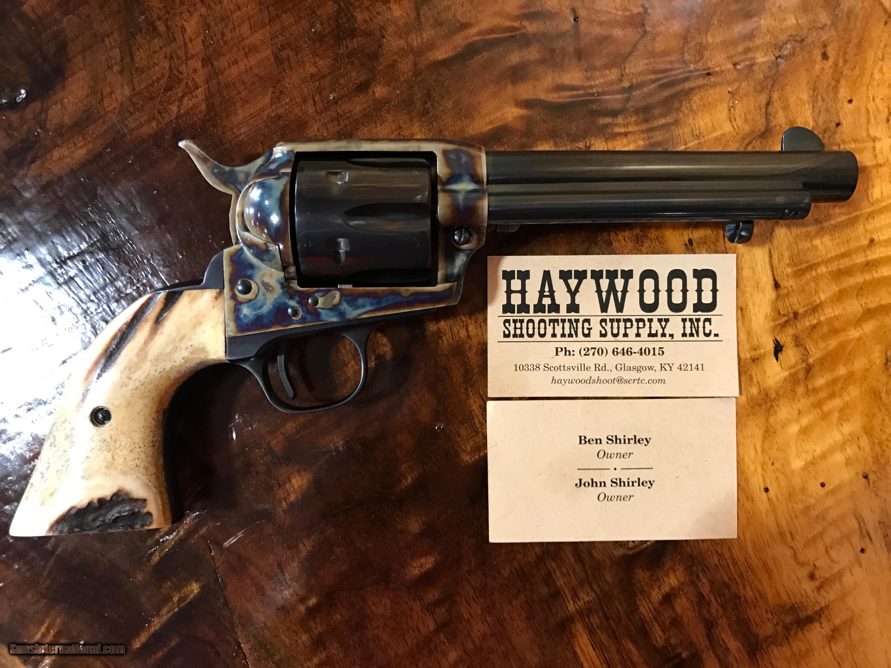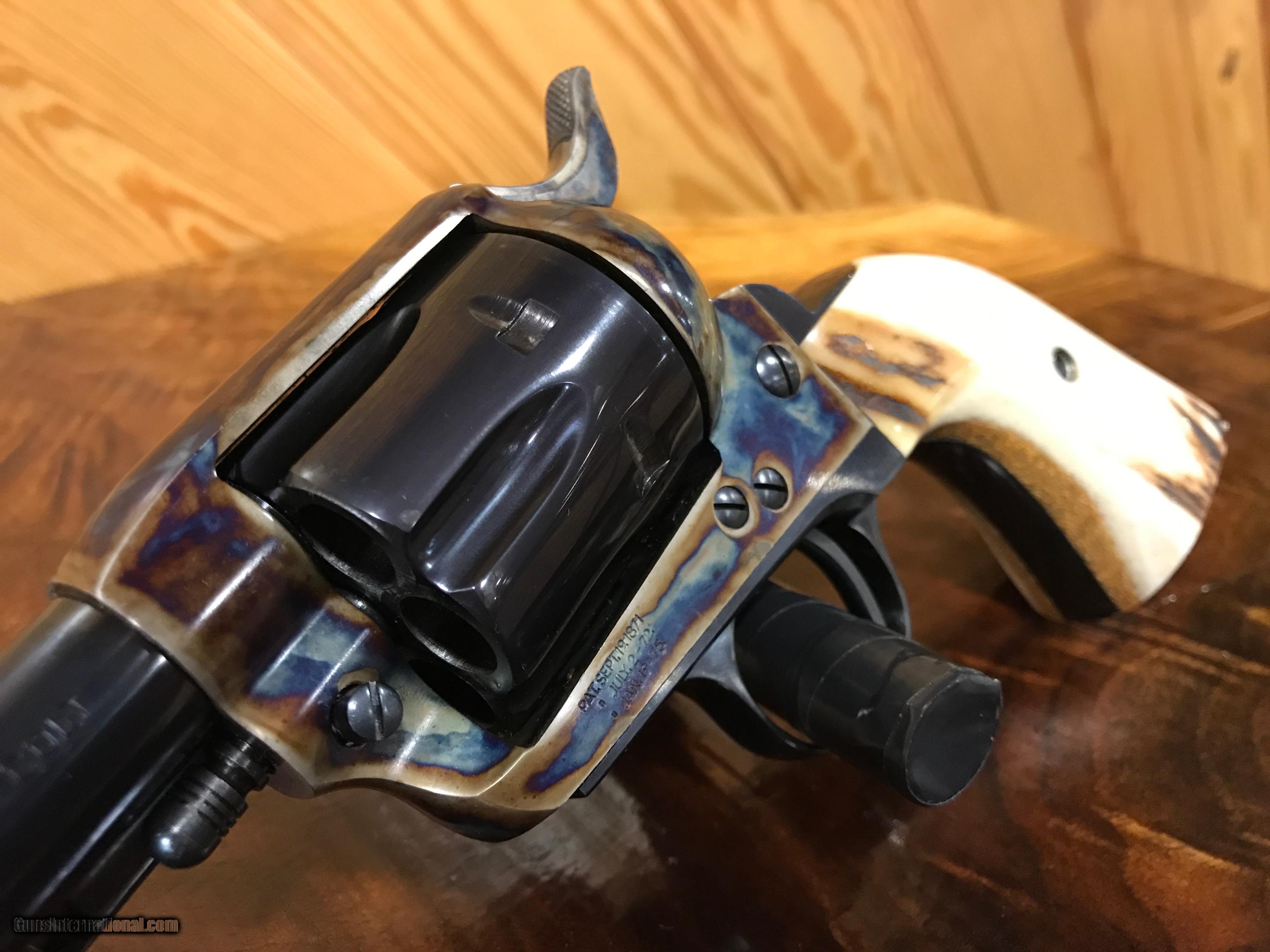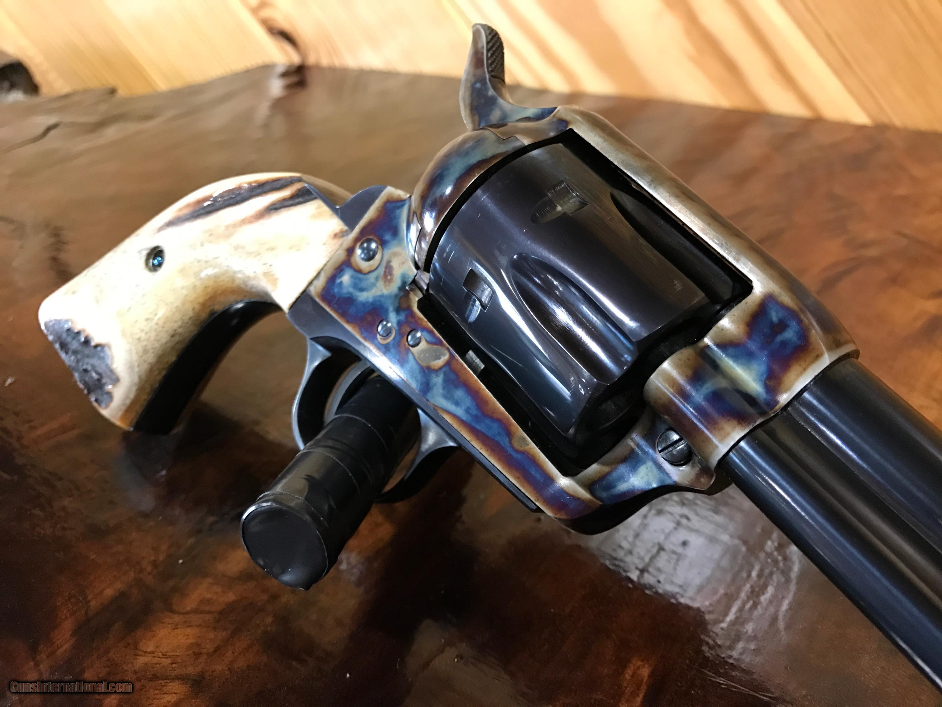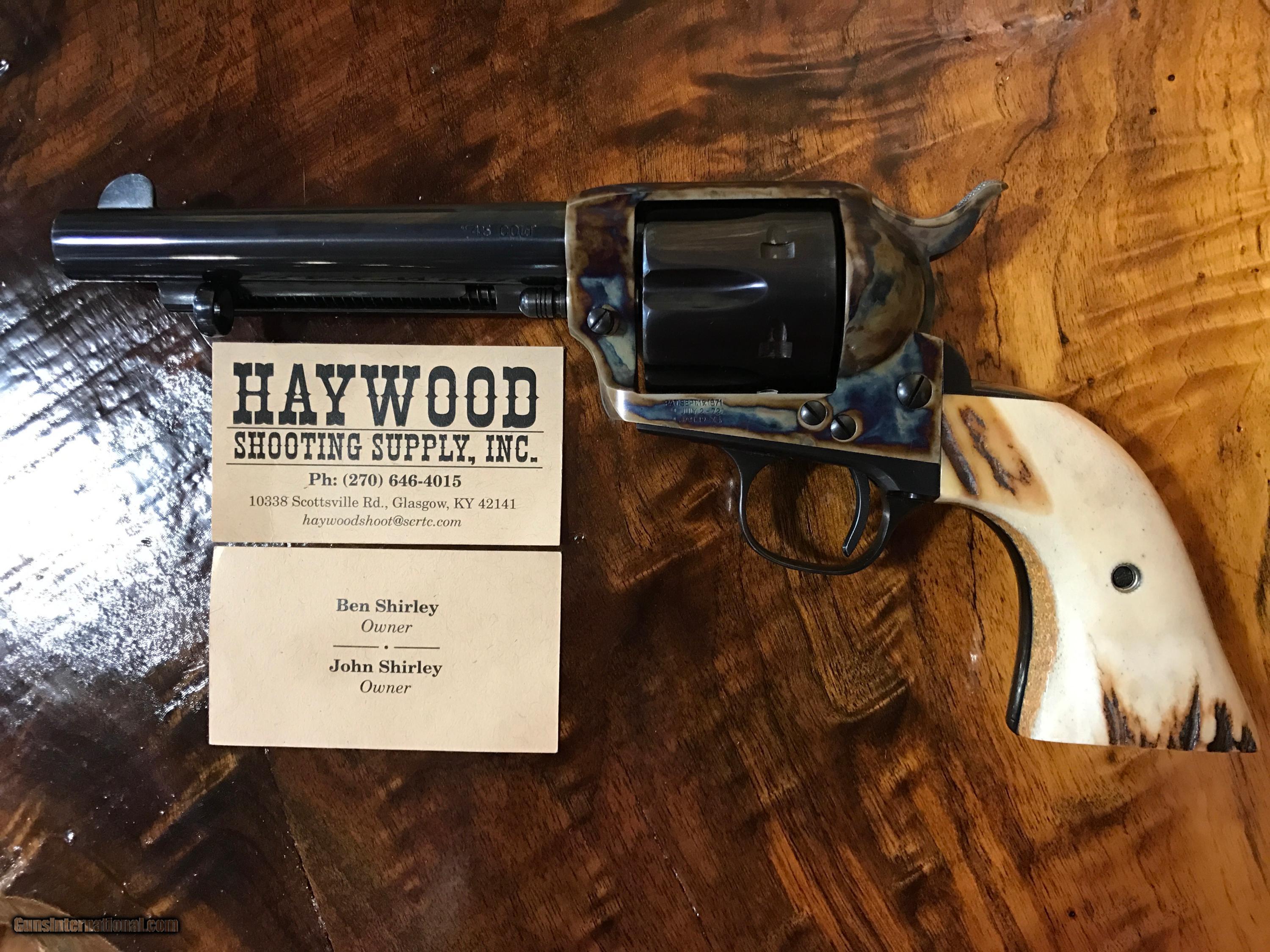 Description: THIS IS A BEAUTIFUL USFA .45 LONG COLT NEW IN THE ORIGINAL BOX WITH A 5" BARREL AND A CASE HARDEN FINISH. THIS GUN COMES WITH A SET OF BEAUTIFUL STAG GRIPS, ALONG WITH THE GRIPS RECIEPT, AS WELL AS THE ORIGINAL GRIPS. + $35.00 SHIPPING CHARGE ***SORRY, NO SALE TO CALIFORNIA*** SOLD |