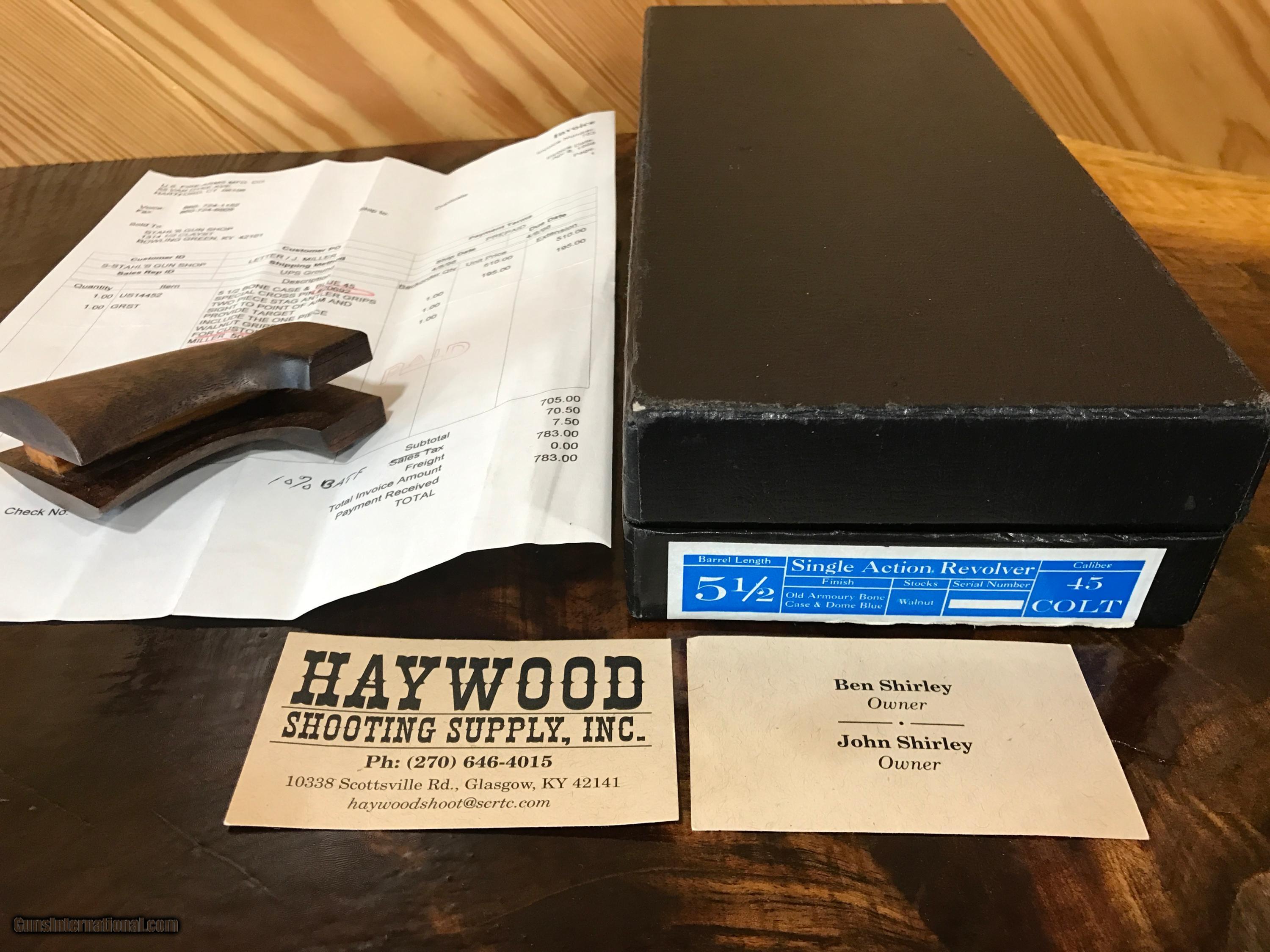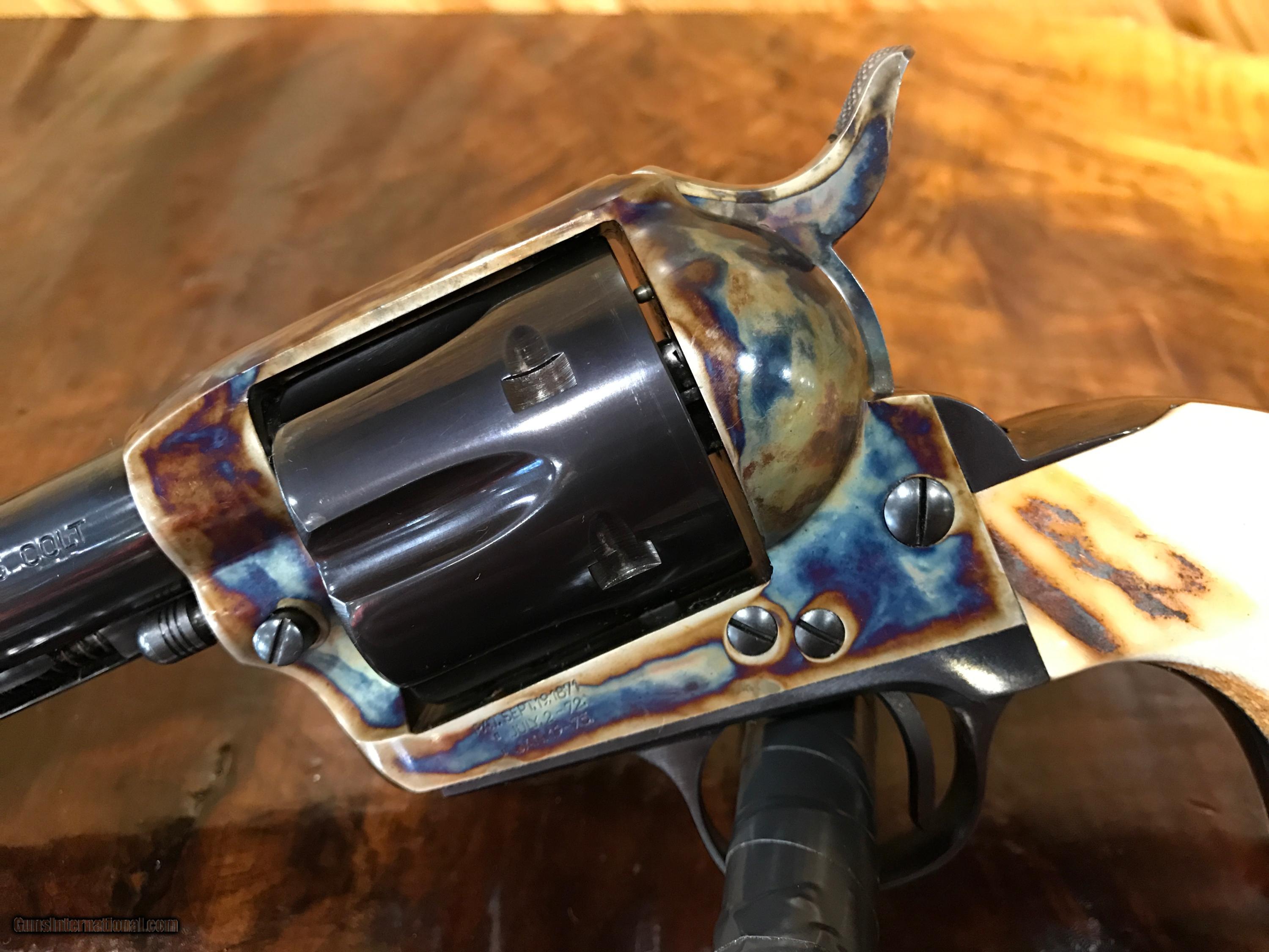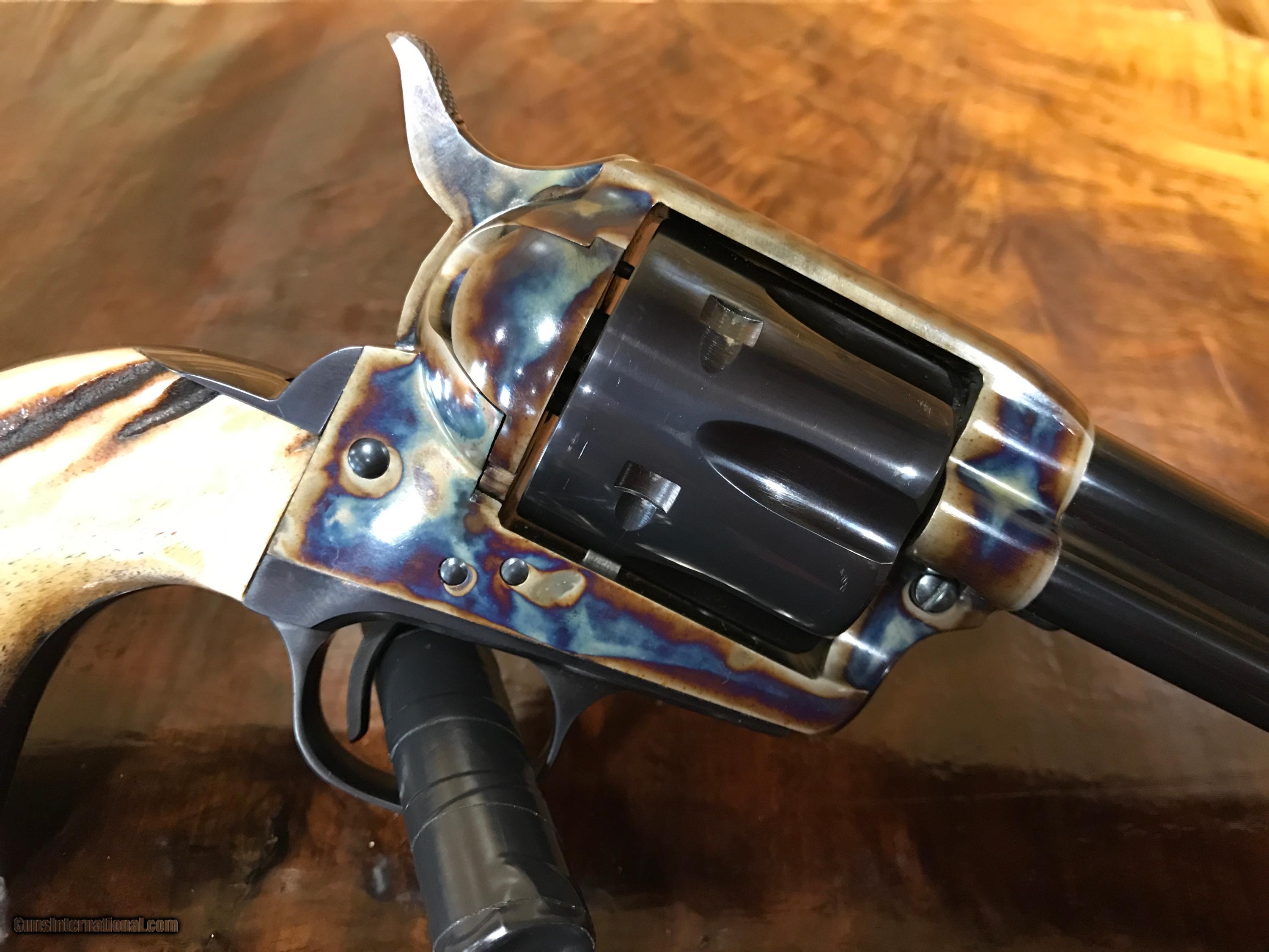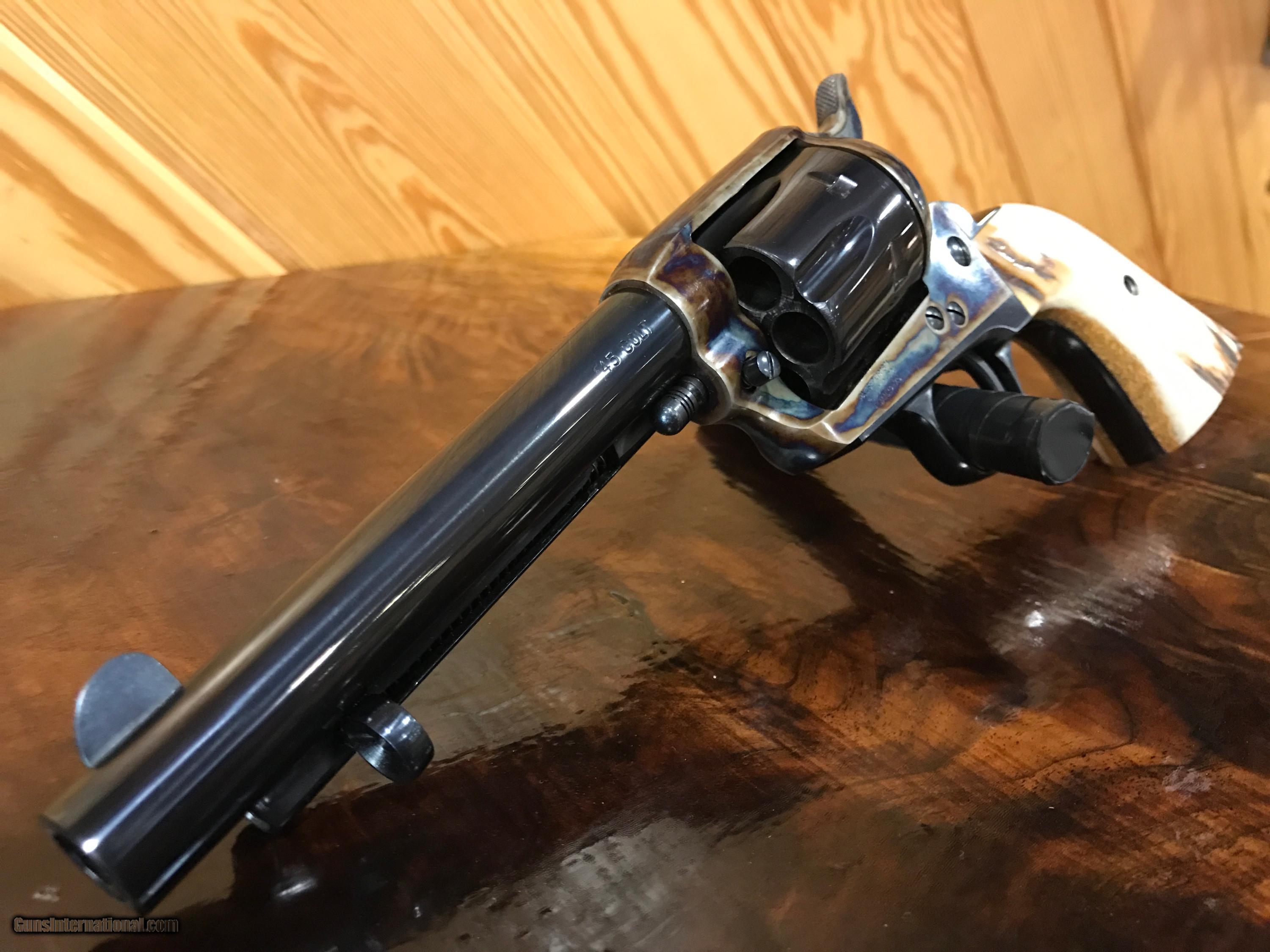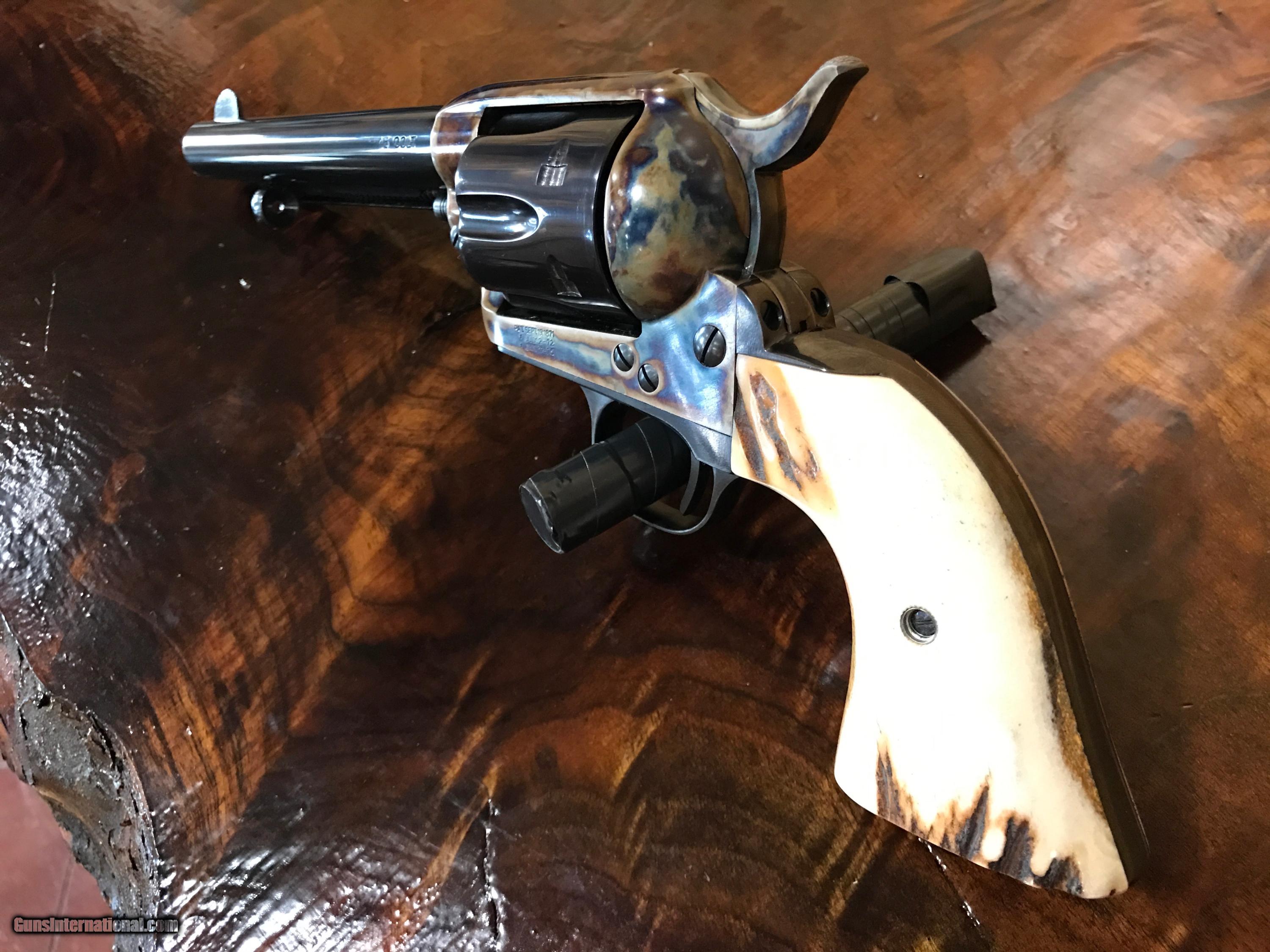 Description: THIS IS A BEAUTIFUL USFA .45 LONG COLT NEW IN THE ORIGINAL BOX WITH A 5" BARREL AND A CASE HARDEN FINISH. THIS GUN COMES WITH A SET OF BEAUTIFUL STAG GRIPS, ALONG WITH THE GRIPS RECIEPT, AS WELL AS THE ORIGINAL GRIPS. + $35.00 SHIPPING CHARGE ***SORRY, NO SALE TO CALIFORNIA*** SOLD |