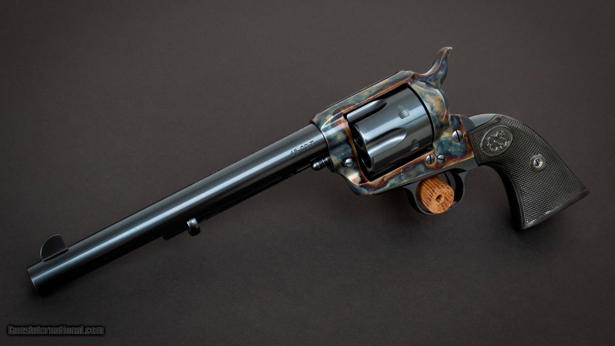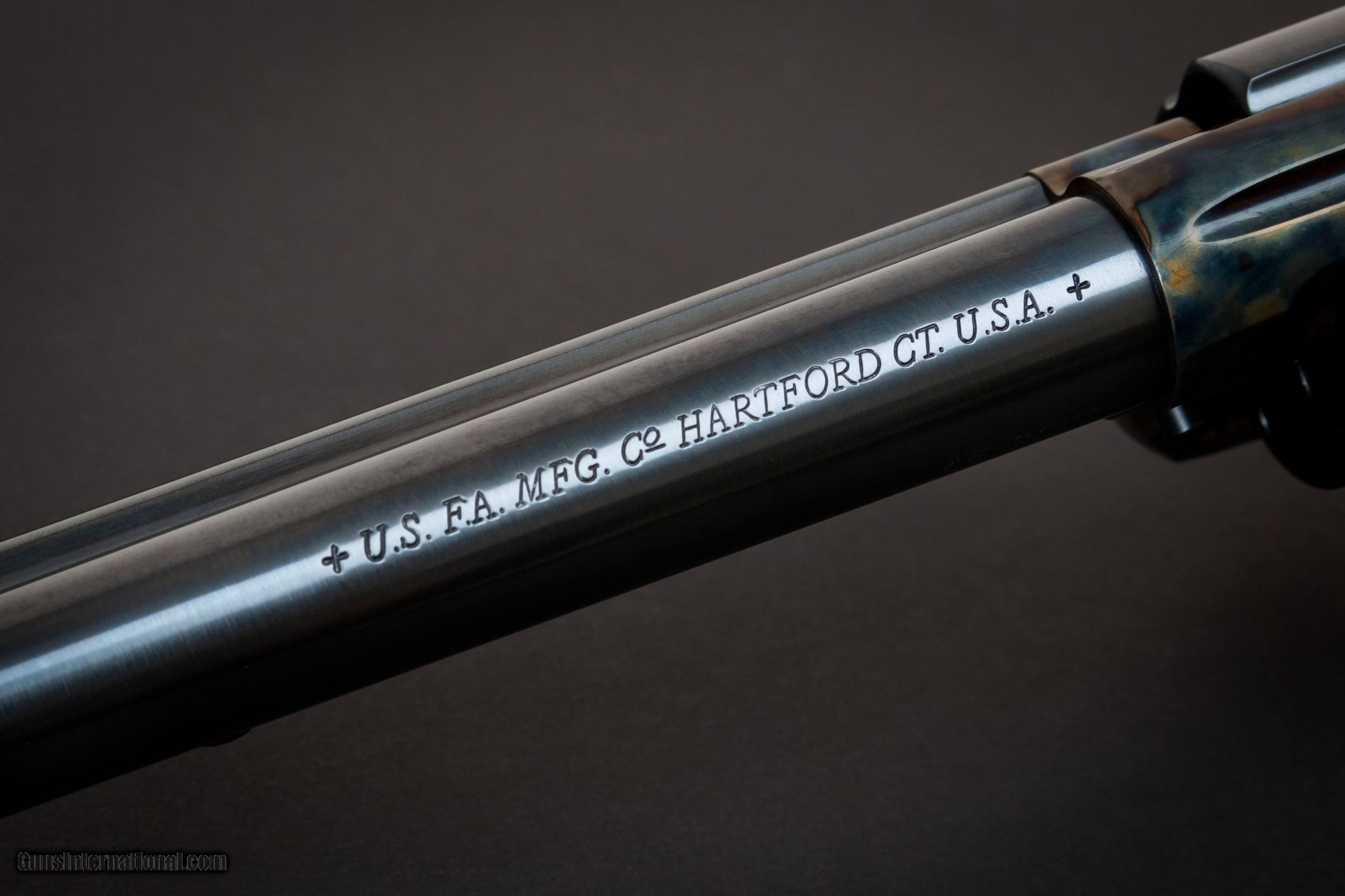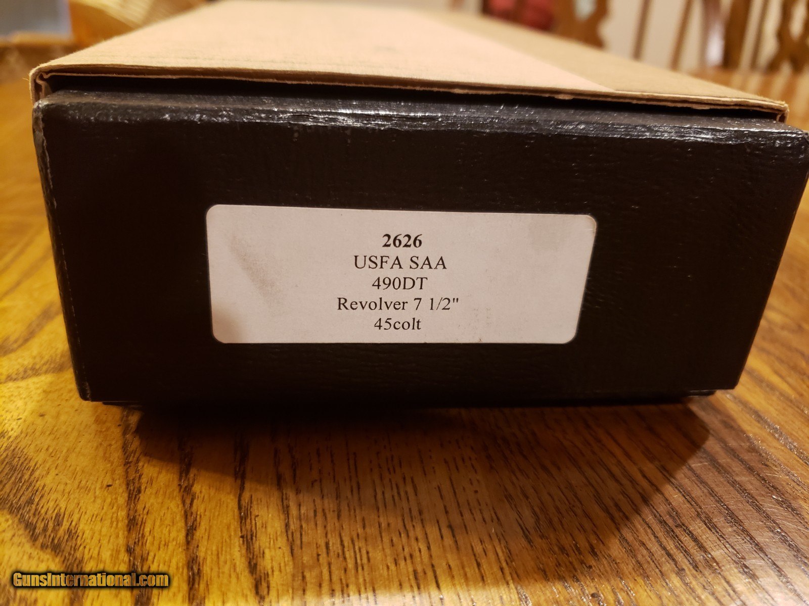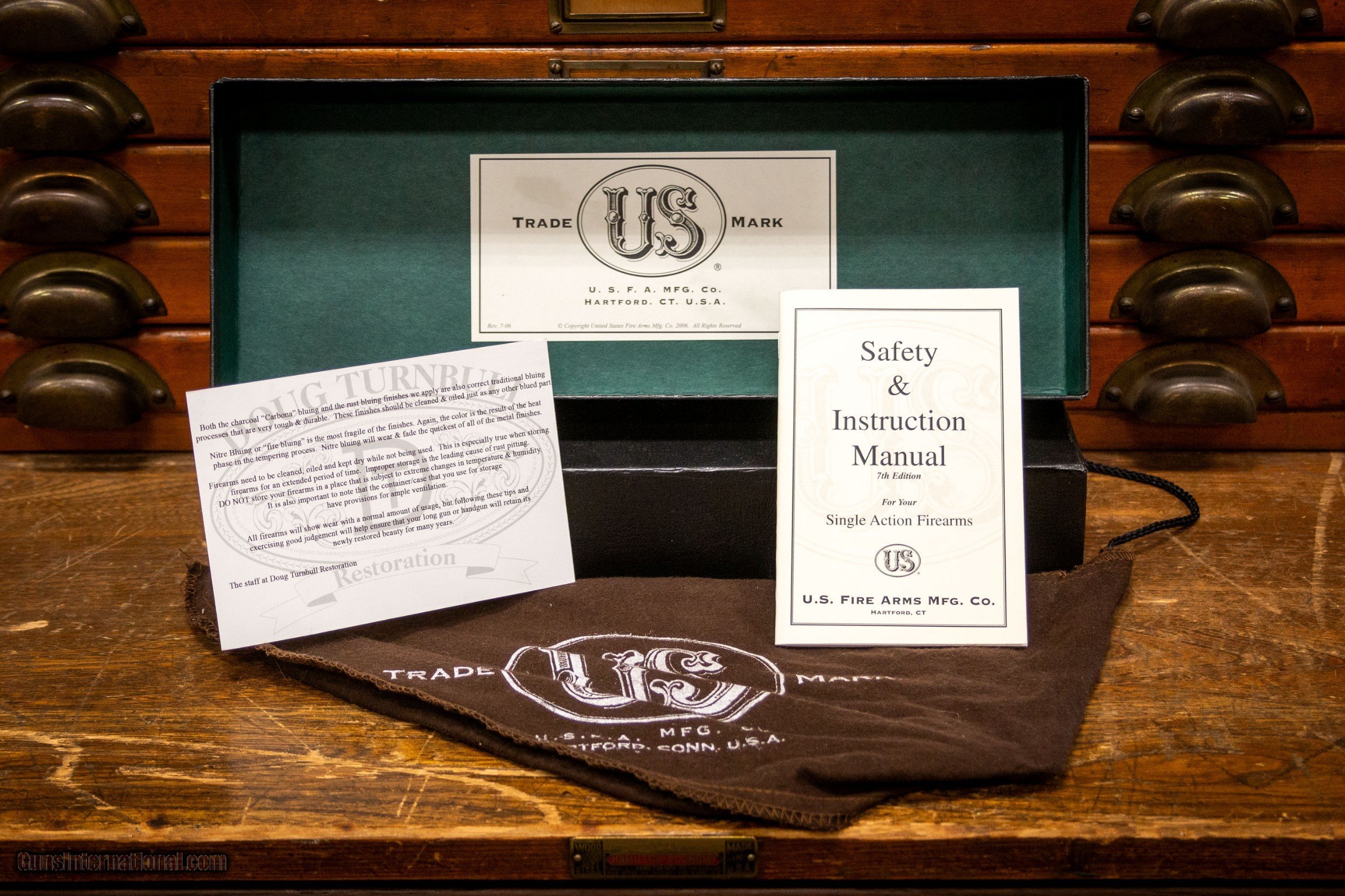 Description: SALE PENDING U.S. Fire Arms SAA with 7-1/2″ barrel, chambered in .45 Colt, new, unfired in factory two piece black box with cardboard sleeve, cloth sleeve, literature. Collectors...this one is perfect in every way.......shooters.....do you really want to shoot this one? Was from a batch of approx 500 that Doug Donnelly sent to Doug Turnbull for finishing around 2008….Donnelly put Turnbull Serial #s on before sending to Turnbull, which was not always the case.....this one has the much desired Armory Blue(not dome blue), similar to the USFA Pre-War models, and Old Armory Bone Case Hardening process that only Turnbull can perform. No sales to NYC or other locations prohibited by law. $65 shipping, insurance, transfer fee from my FFL to yours. SOLD Handgun Caliber: .44 Colt Manufacturer: USFA Model: SAA Serial Number: 490DT |