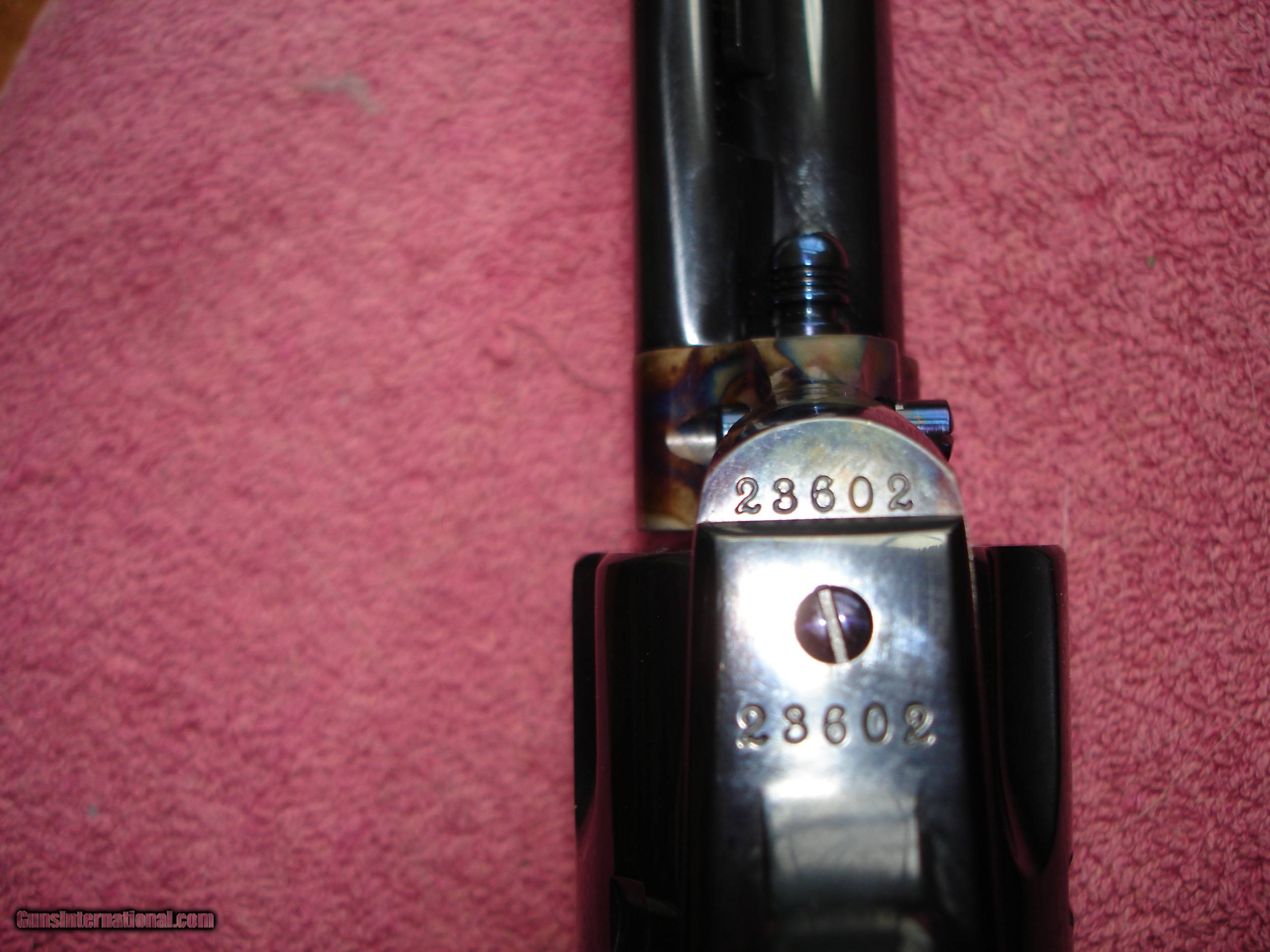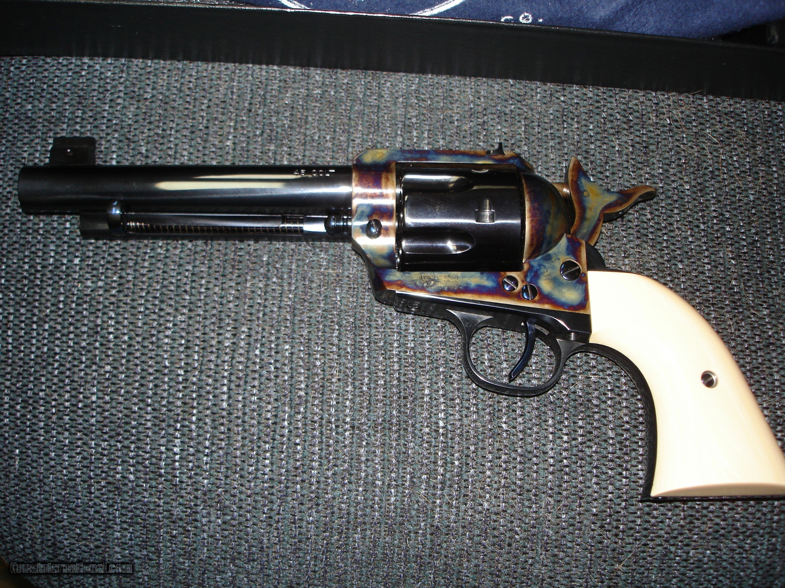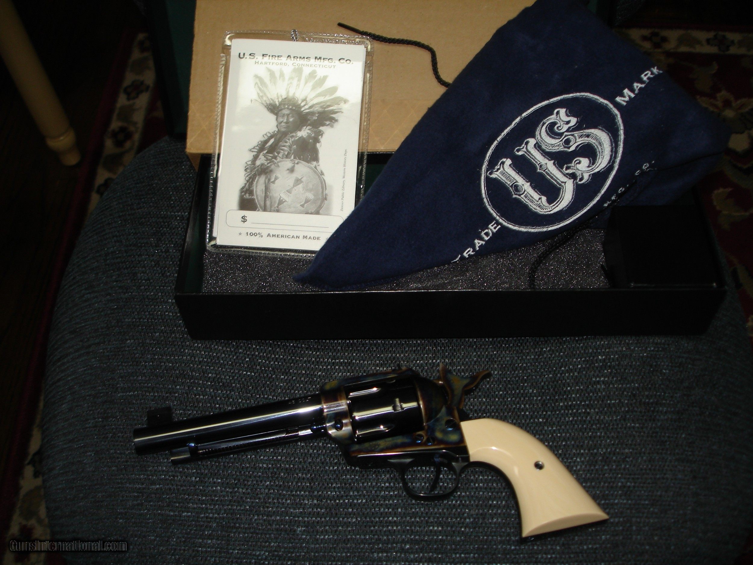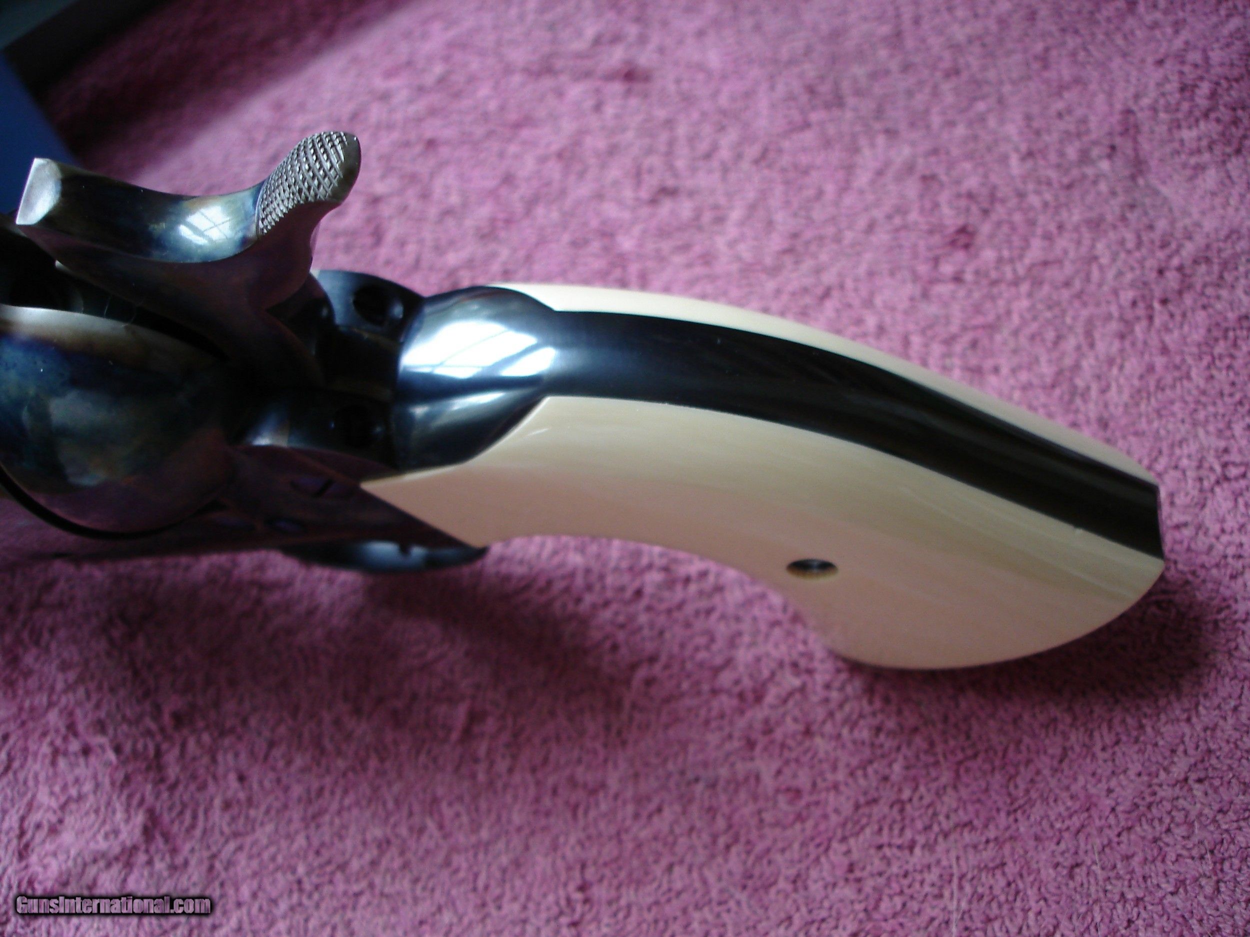 Description: Out of my long term collection I have for sale a Beautiful Very Rare Flat Top Target S/A Revolver. MFG 2004? Premium Grade S/A Revolver .45 Colt Caliber. 4 3/.4" BBl. Flat Top, Adjustable Rear Sight, High Front Sight. Beautiful Dome Blue Gloss Finish, with Fire Blue screws and Appointments. Wounderful Blue & Case Colors, also found on the hammer. Real Leagle, Two Piece Ivory Stocks. Weight 40.4oz. New in the Original Box, with all shipping papers and sock, and Slip Cover ETC. SER#. 23602. This is a Very Rare and Beautiful USFA Revolver, I sure do hate to let it go. It is one of the most Beautiful Revolvers that I own. Price is $4999.00 Shipping & insurance to your FFL is $60.00 Sale Pending SOLD |