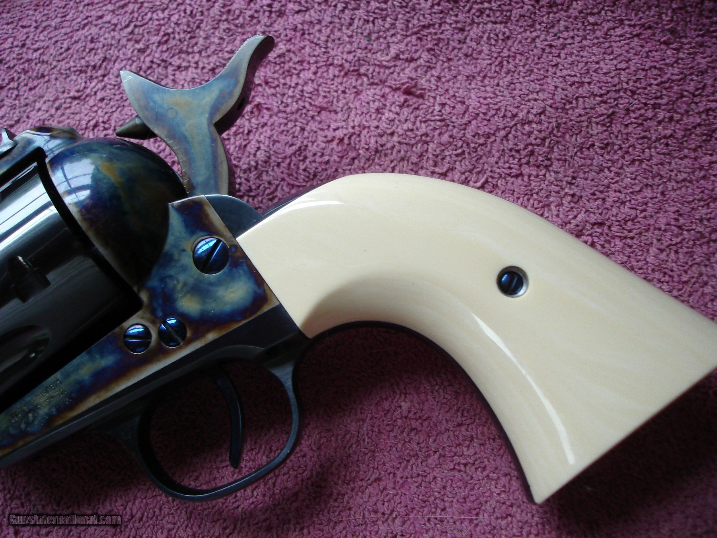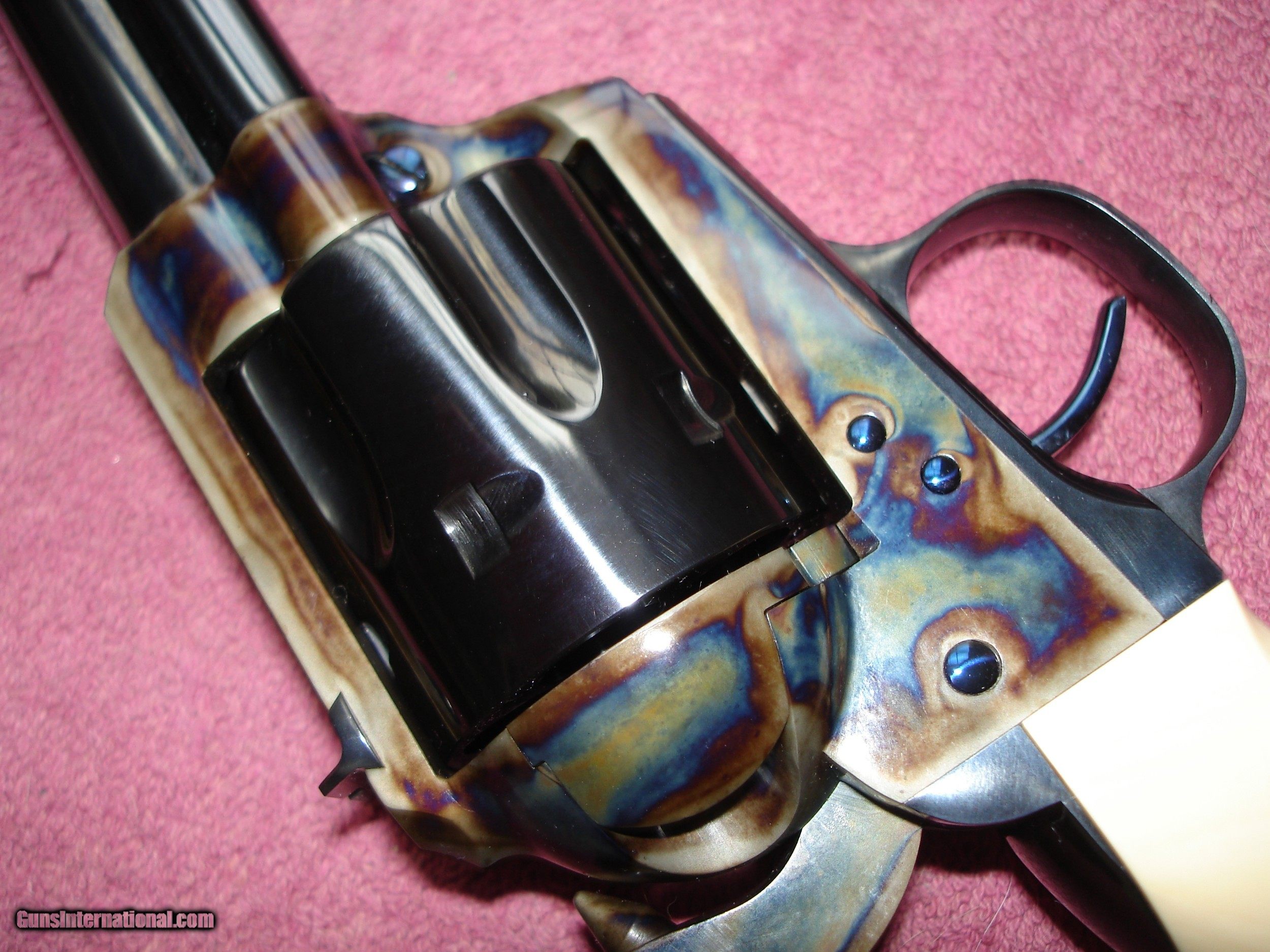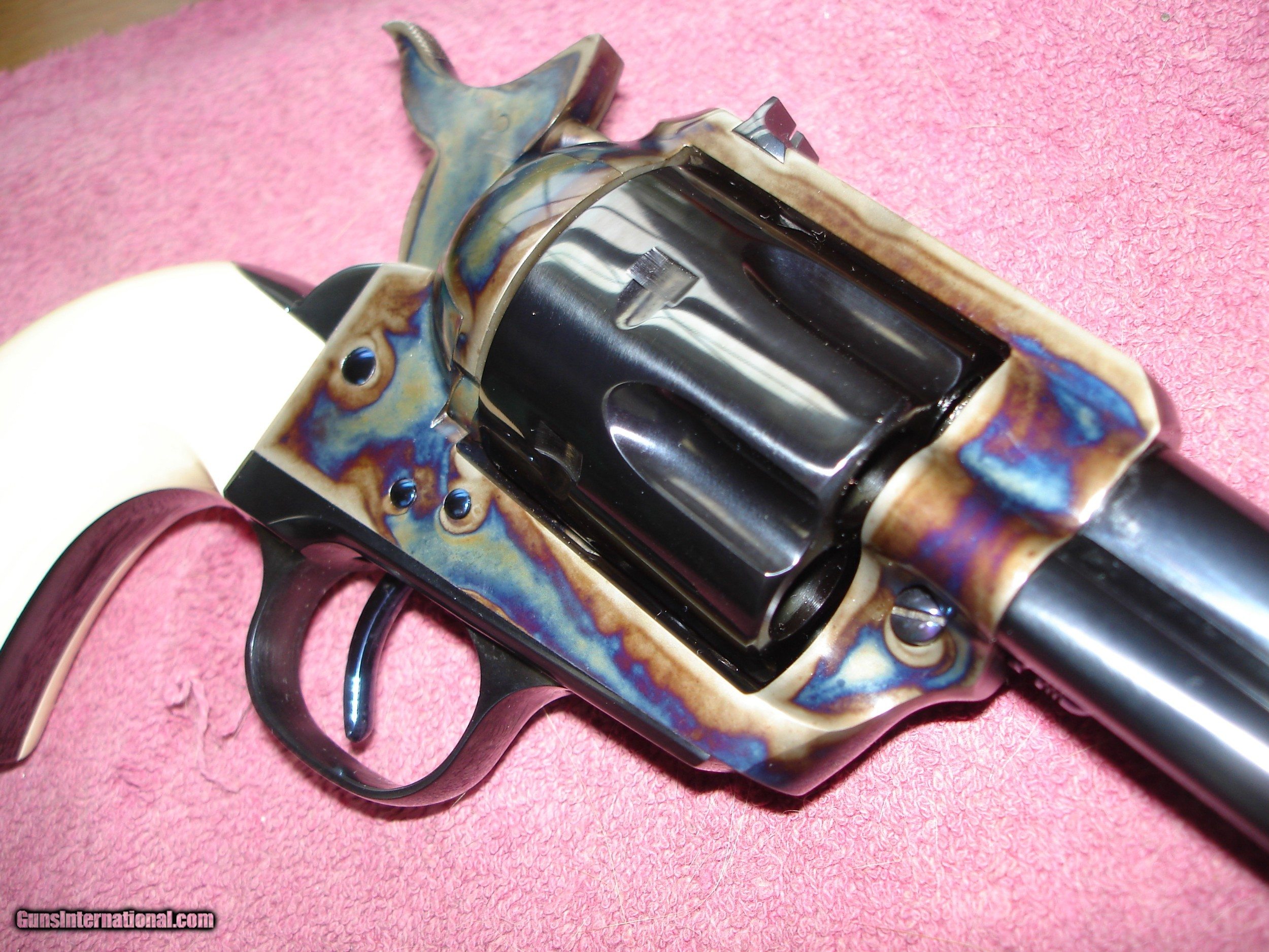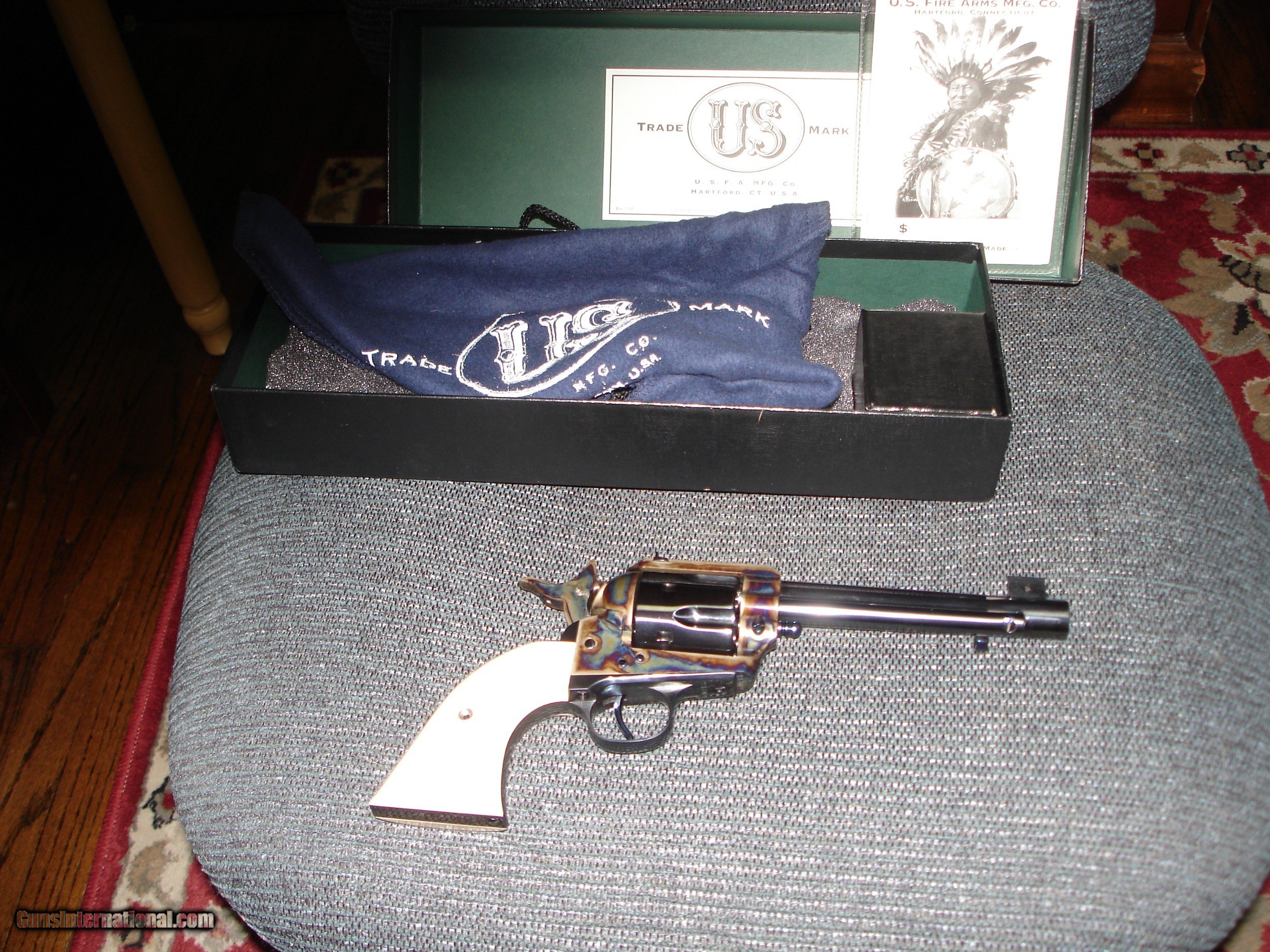 Description: Out of my long term collection I have for sale a Beautiful Very Rare Flat Top Target S/A Revolver. MFG 2004? Premium Grade S/A Revolver .45 Colt Caliber. 4 3/.4" BBl. Flat Top, Adjustable Rear Sight, High Front Sight. Beautiful Dome Blue Gloss Finish, with Fire Blue screws and Appointments. Wounderful Blue & Case Colors, also found on the hammer. Real Leagle, Two Piece Ivory Stocks. Weight 40.4oz. New in the Original Box, with all shipping papers and sock, and Slip Cover ETC. SER#. 23602. This is a Very Rare and Beautiful USFA Revolver, I sure do hate to let it go. It is one of the most Beautiful Revolvers that I own. Price is $4999.00 Shipping & insurance to your FFL is $60.00 Sale Pending SOLD |