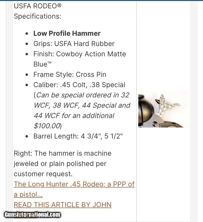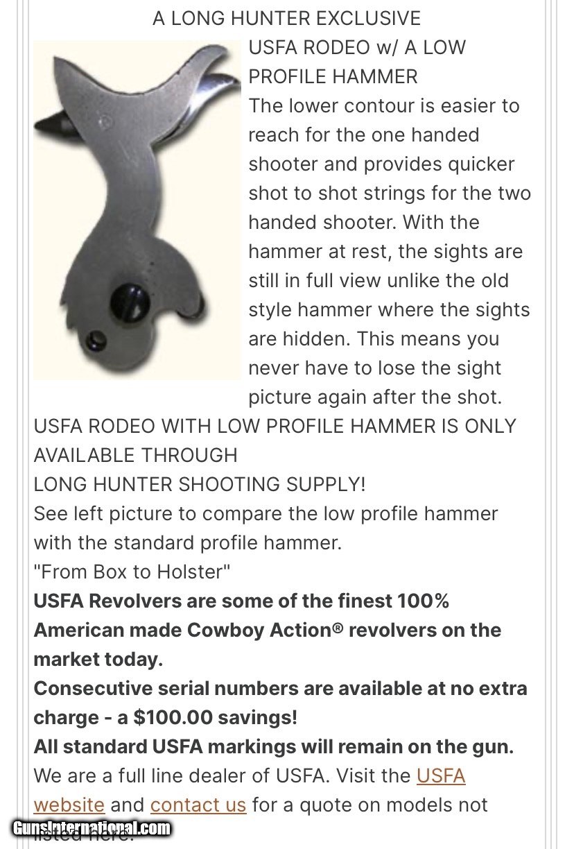 Description: Selling a rare All US made custom longhunter rodeo model. L prefix serial so well into the all US made ones. L422. You don’t see these come up for sale too often. I have the consecutive numbered partner also if the buyer wants a pair. (L421) Just double the final price and you can have it. This listing is only for one. It’s in the desirable 45 Colt with 4 3/4” barrel. Has the hard to find low profile CCH hammer. The hammer is numbered to the gun and original to it. I have posted pictures from the now closed Longhunter shop that shows all the custom features that this has. And it has many desired features just see the list of them in the pics. These are said to be the best shooters of any of the USFA. Action is very very smooth. You will be amazed. It is used and has what appears to be a gunslinger type finish. $45 shipping ffl to ffl (if want the pair I'll ship them together) - usps medium priority with tracking. Insurance available at request and purchase of buyer, once item ships its buyers item. I accept personal checks, usps money orders and certified checks. Feel free to contact me with any questions or if you want any specific pictures taken. Thanks for looking. SOLD Manufacturer: USFA Model: Rodeo Serial Number: L422 Barrel Length: 4 3/4” |