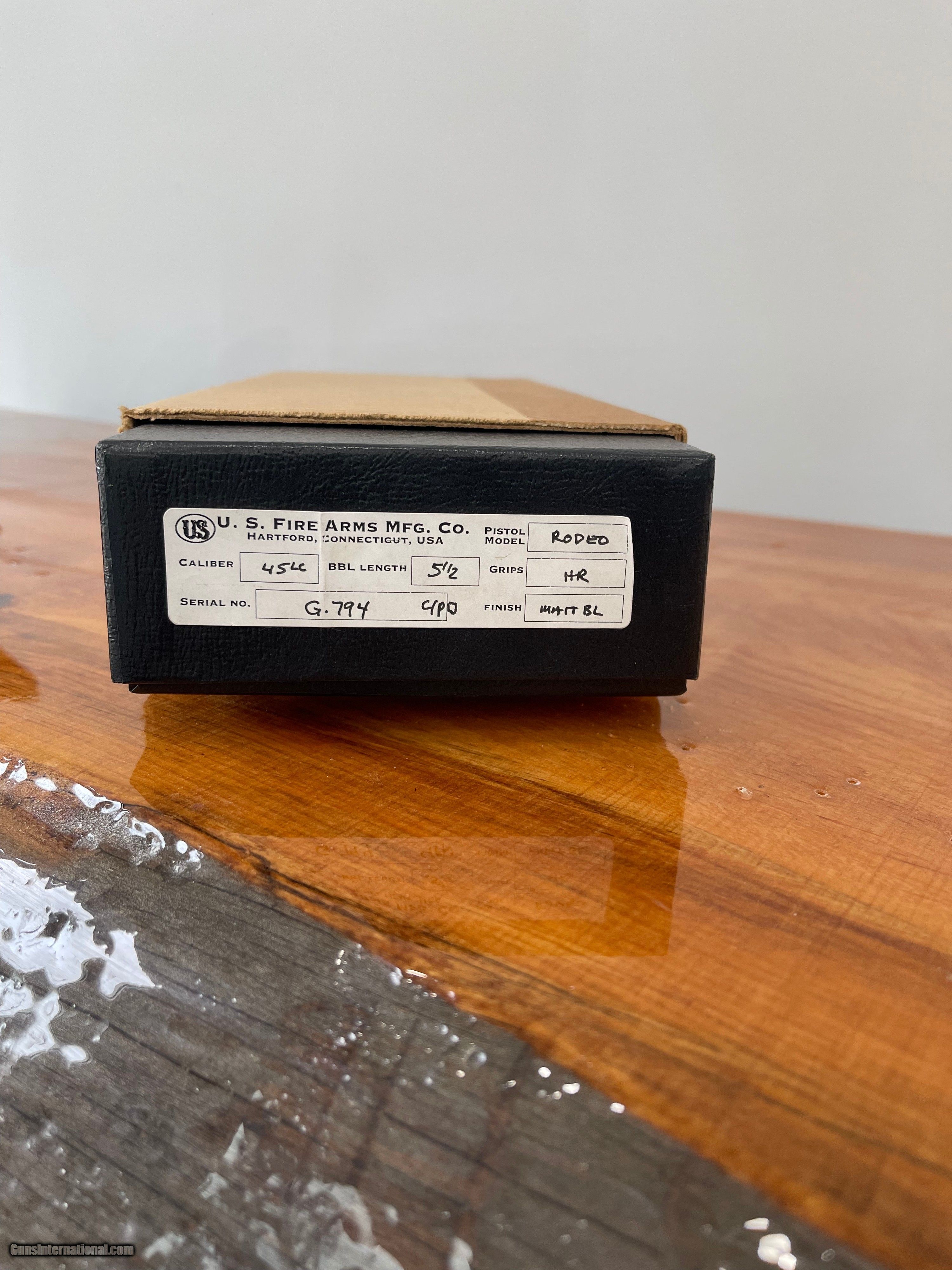 Description: A new in the box USFA Rodeo 45 long colt unfired with all orginal paperwork. This gun was bought new by the owner and has never been fired or even been cocked. 5 1/2 inch barrel. Matte blue finish. You will not find a revolver this clean or in this good of shape for this price. Buyer will pay actual shipping cost. Any more questions feel free to ask SOLD Handgun Caliber: .45 Colt Manufacturer: USFA Model: Rodeo Serial Number: G7xx Barrel Length: 5 1/2 Bore: New Chambers: 6 Ejectors: 1 Condition: New in Box Metal Condition: New Bore Condition: New Barrels: 1 Barrel Type: Blued Action: Single Action Triggers: 1 Finish: Matte Blue Sights: Fixed Item Location: Machiasport |