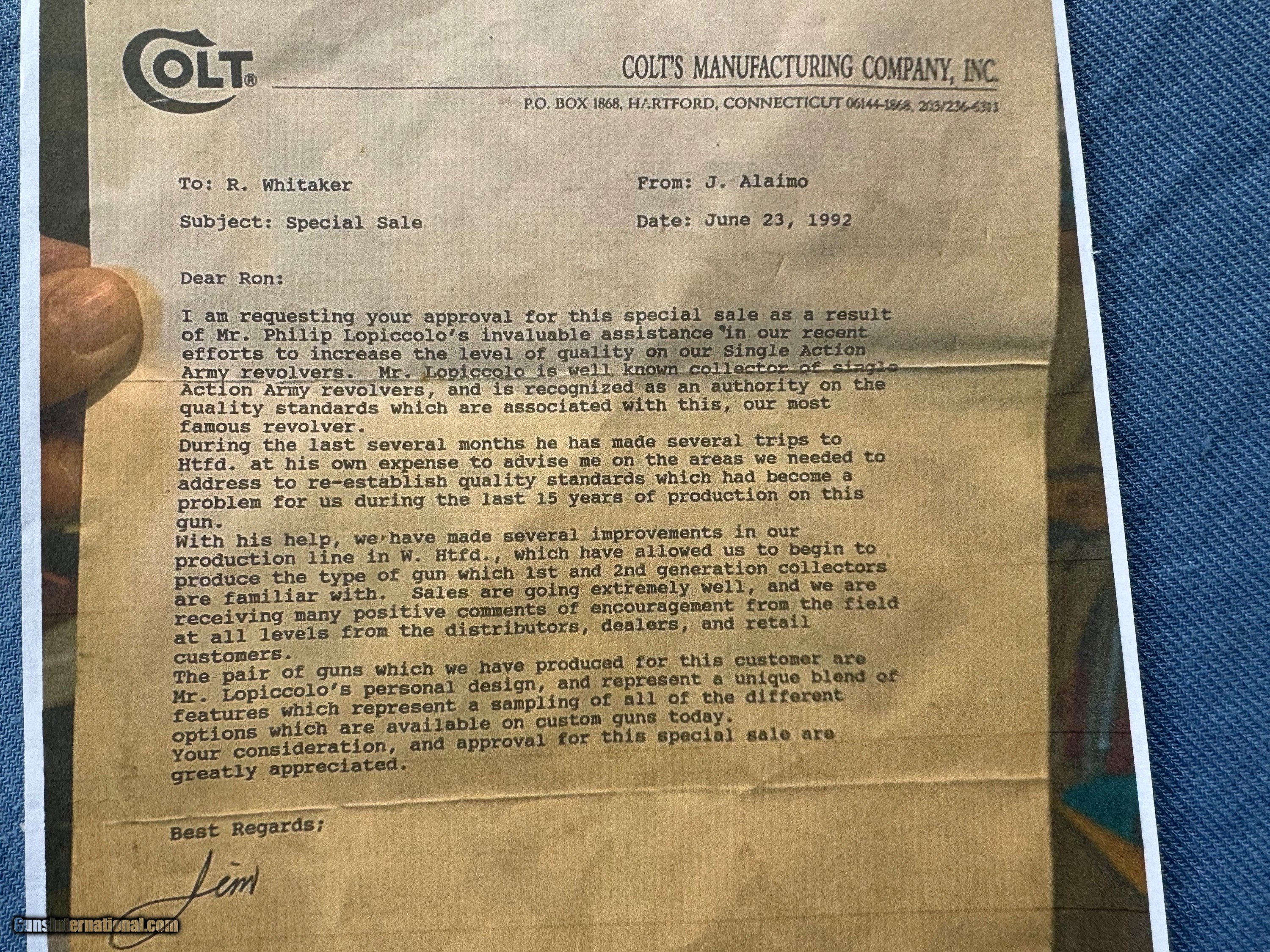 Description: Here's a mint example of a USFA SAA Master Engraved by Colt Master Engraver Steve Kamyk ! 41 Special Caliber. Serial number Mustang 5 . 4 3/4" barrel . Gun comes with Buffalo Horn Grips Made by Dennis Holland . Gun was owned by Phillip Lo Piccalo . Phillip worked with the Colt Custom Shop for many years ! And was good friends with Steve Kamyk and had Steve engrave this gun for him . Also had the Buffalo Horn Grips made by Dennis Holland. Theres a photo of the letter by Colt Factory explaining how Phillip LoPiccolo influenced and helped Colt in the Custom shop ! Steve Kamyk really Captures the Style of Master Engravers Helfrect and Nimske in this Wonderful SAA ! One of the finest Excuted Examples of Steve Kamyk's Master Engraving! Gun is like new condition! Please review my photos and email me with any questions? 3 day inspection as allways. Thank you for looking, Little Jo SOLD Curio/Relic: Yes Handgun Caliber: .41 Colt Special Manufacturer: USFA Model: SAA Serial Number: Mustang 5 Barrel Length: 4 3/4” Condition: Mint |