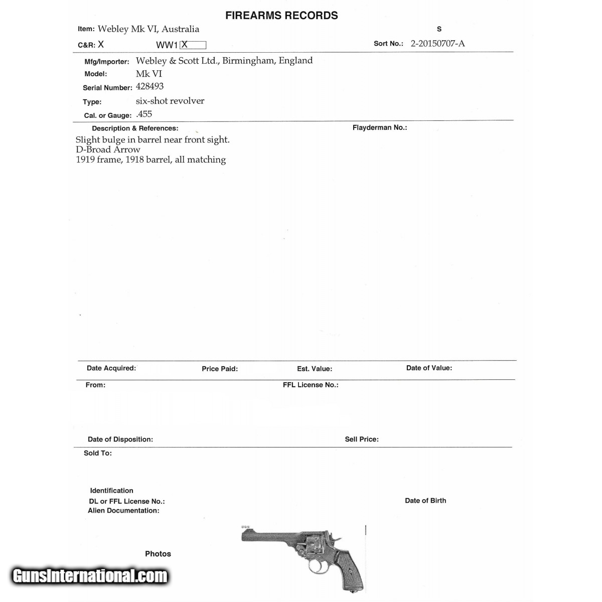 Description: " Serial No. 428493, made in 1919, .455, 6"" barrel. Overall finish is a grey/brown patina. Serial numbers are matching, barrel is dated 1918 with Broad Arrows visible. Frame and Barrel assembly are marked the ""Broad Arrow inside D"". Bore shows frosting in the grooves with strong rifling remaining. Grips are intact with minor chips noted. Action functions correctly. It is noted that there is a slight Bulge in the barrel by the front sight. SOLD Curio/Relic: Yes |