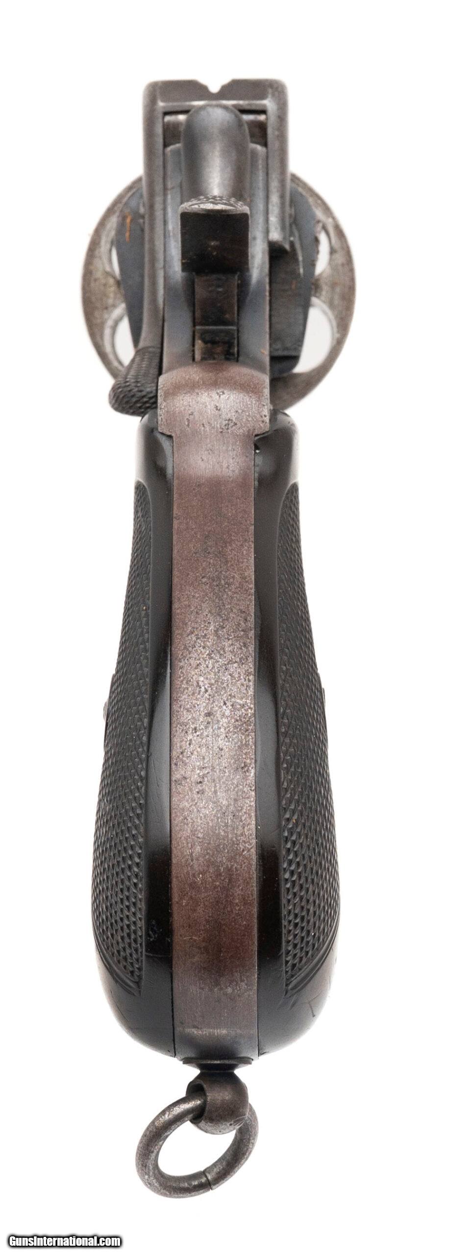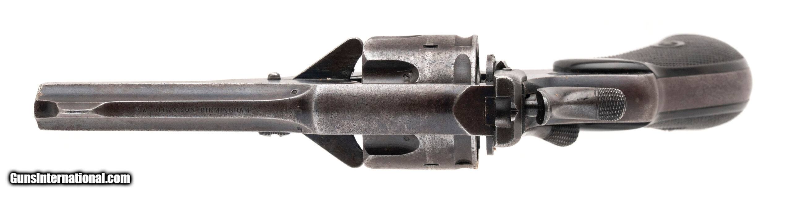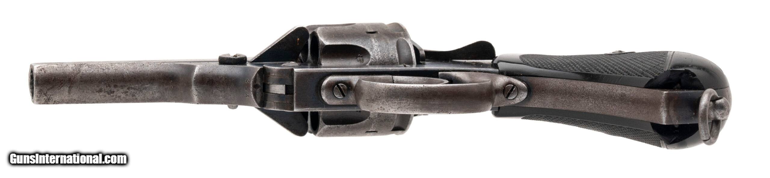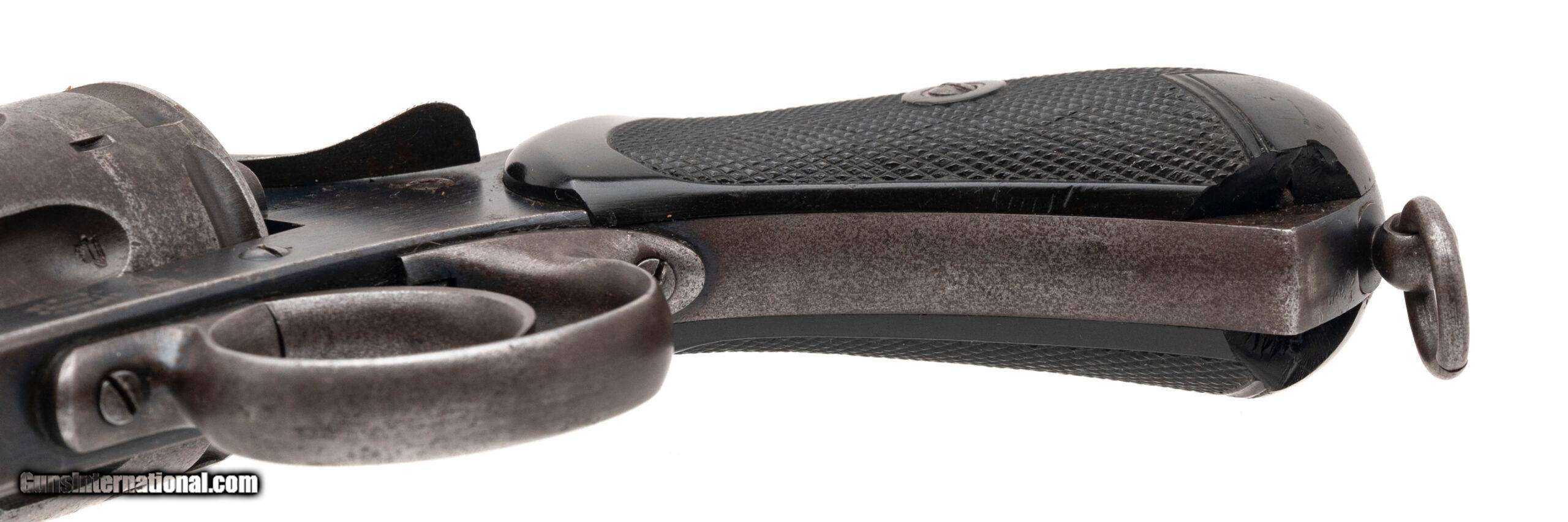 Description: "Serial No. 31575, manufactured circa 1887–1894 by P. Webley & Son, Birmingham, 4" octagonal barrel marked “P. WEBLEY & SON – BIRMINGHAM." Originally chambered for .455 Webley, the cylinder has been cut to accept .45 ACP with moon clips. Approximately 40% of the original blue finish remains, primarily on the frame; the balance has aged to a smooth grey patina. Serial numbers are matching, and factory markings remain sharp. Checkered grips are in excellent condition, showing only light handling wear. Action indexes correctly with a tight lock-up. SOLD Antique: Yes |