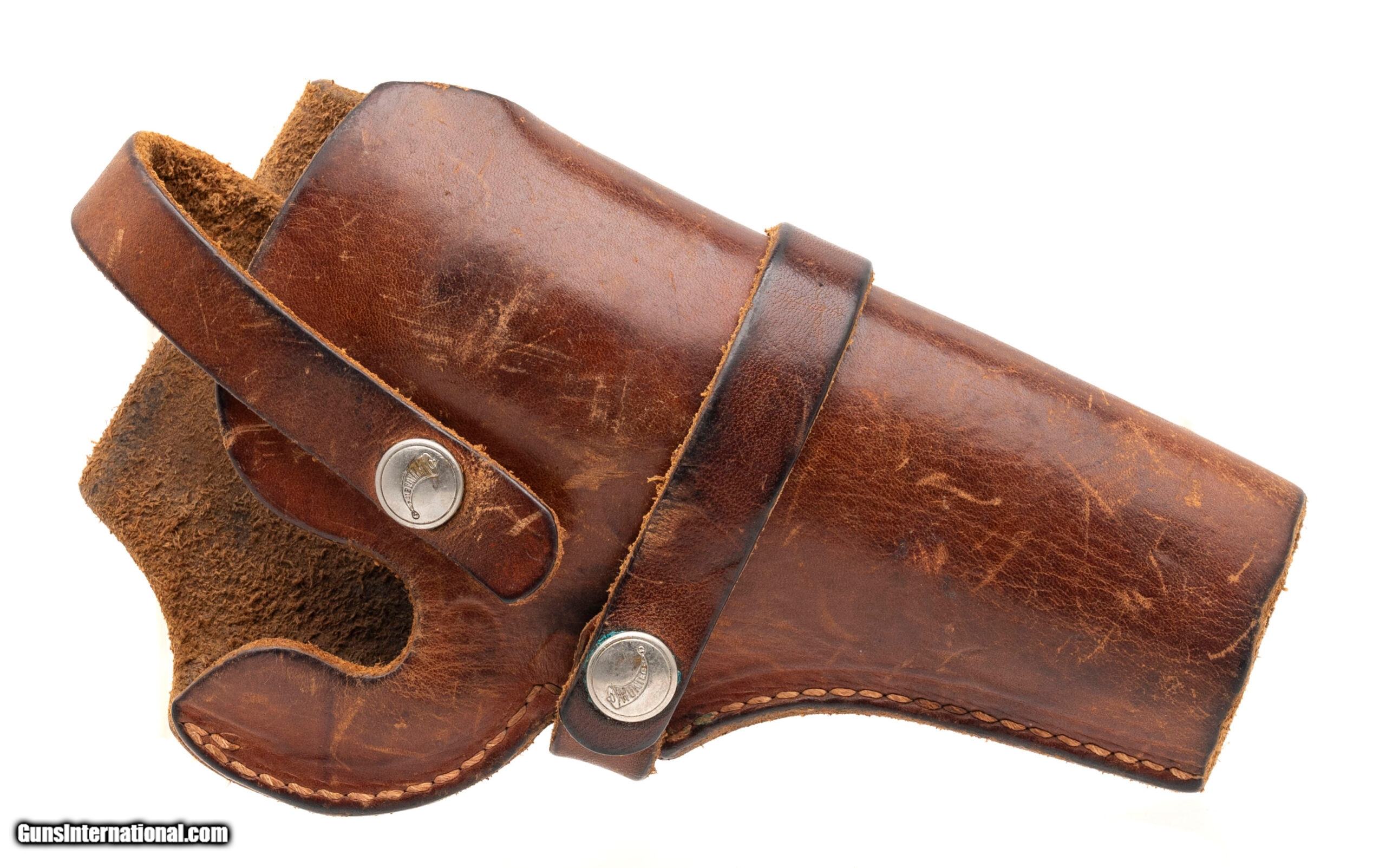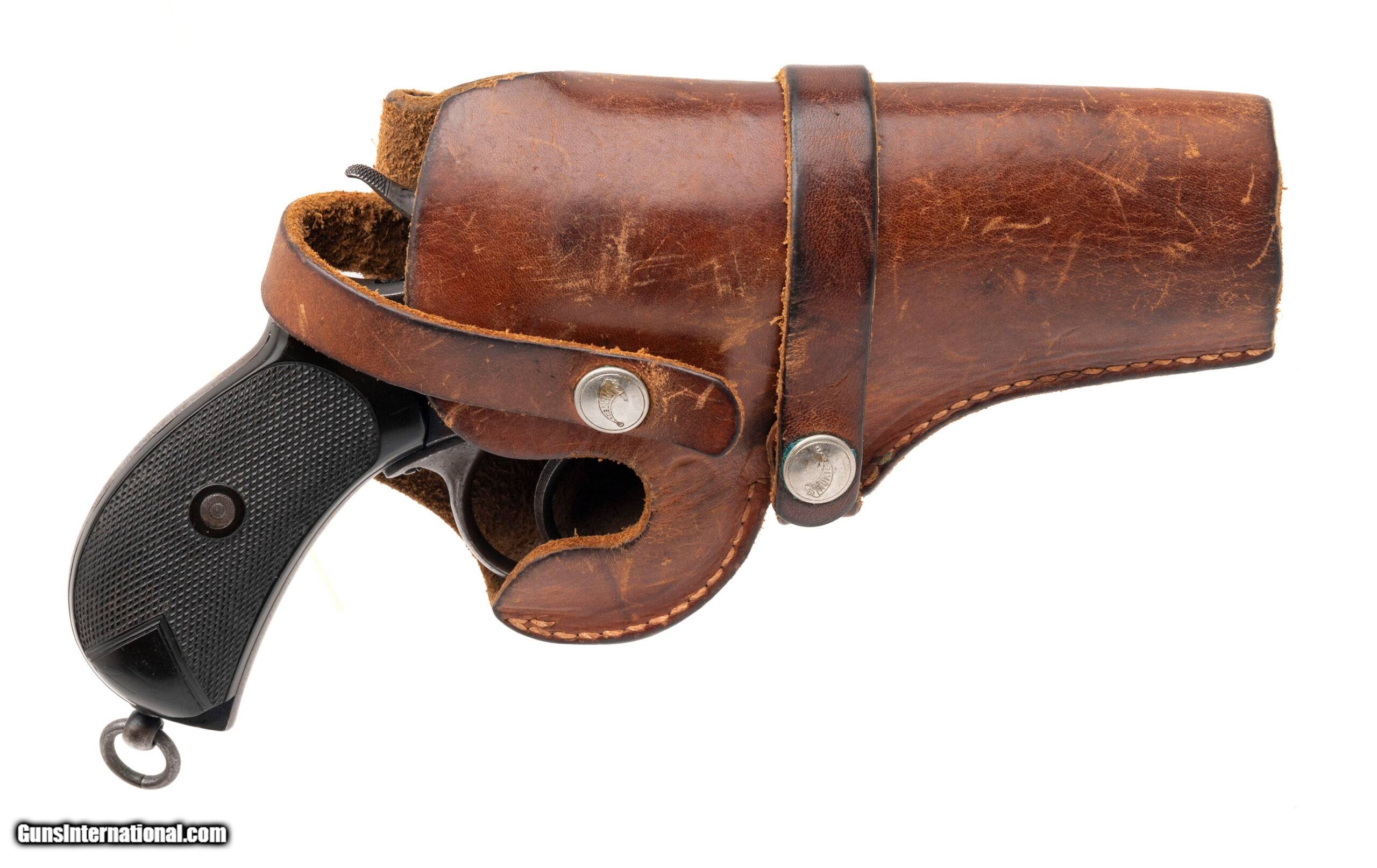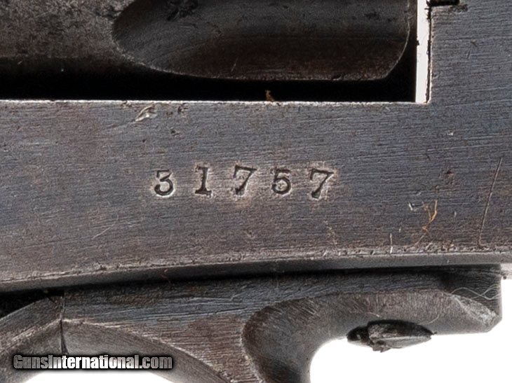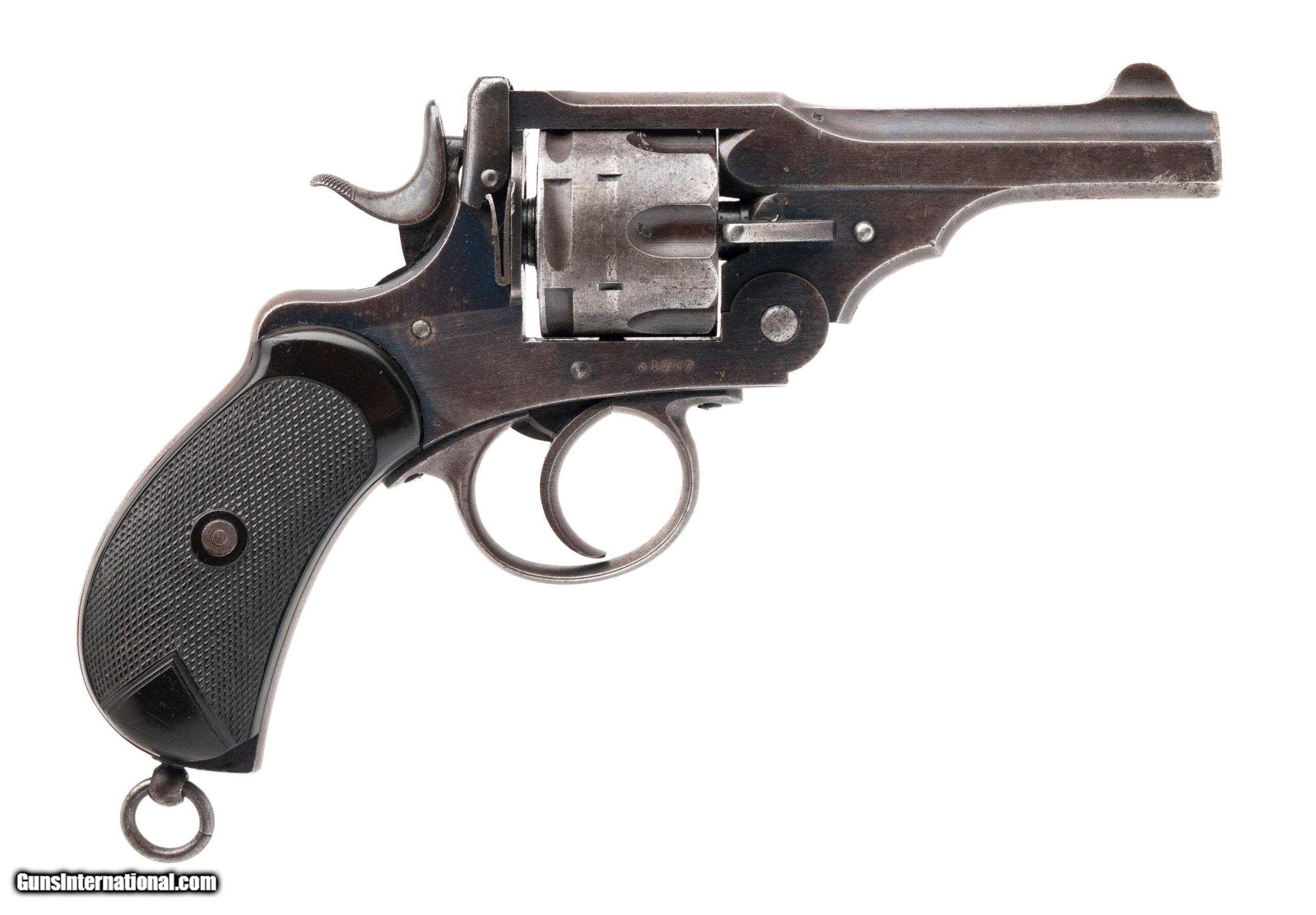 Description: "Serial No. 31575, manufactured circa 1887–1894 by P. Webley & Son, Birmingham, 4" octagonal barrel marked “P. WEBLEY & SON – BIRMINGHAM." Originally chambered for .455 Webley, the cylinder has been cut to accept .45 ACP with moon clips. Approximately 40% of the original blue finish remains, primarily on the frame; the balance has aged to a smooth grey patina. Serial numbers are matching, and factory markings remain sharp. Checkered grips are in excellent condition, showing only light handling wear. Action indexes correctly with a tight lock-up. SOLD Antique: Yes |