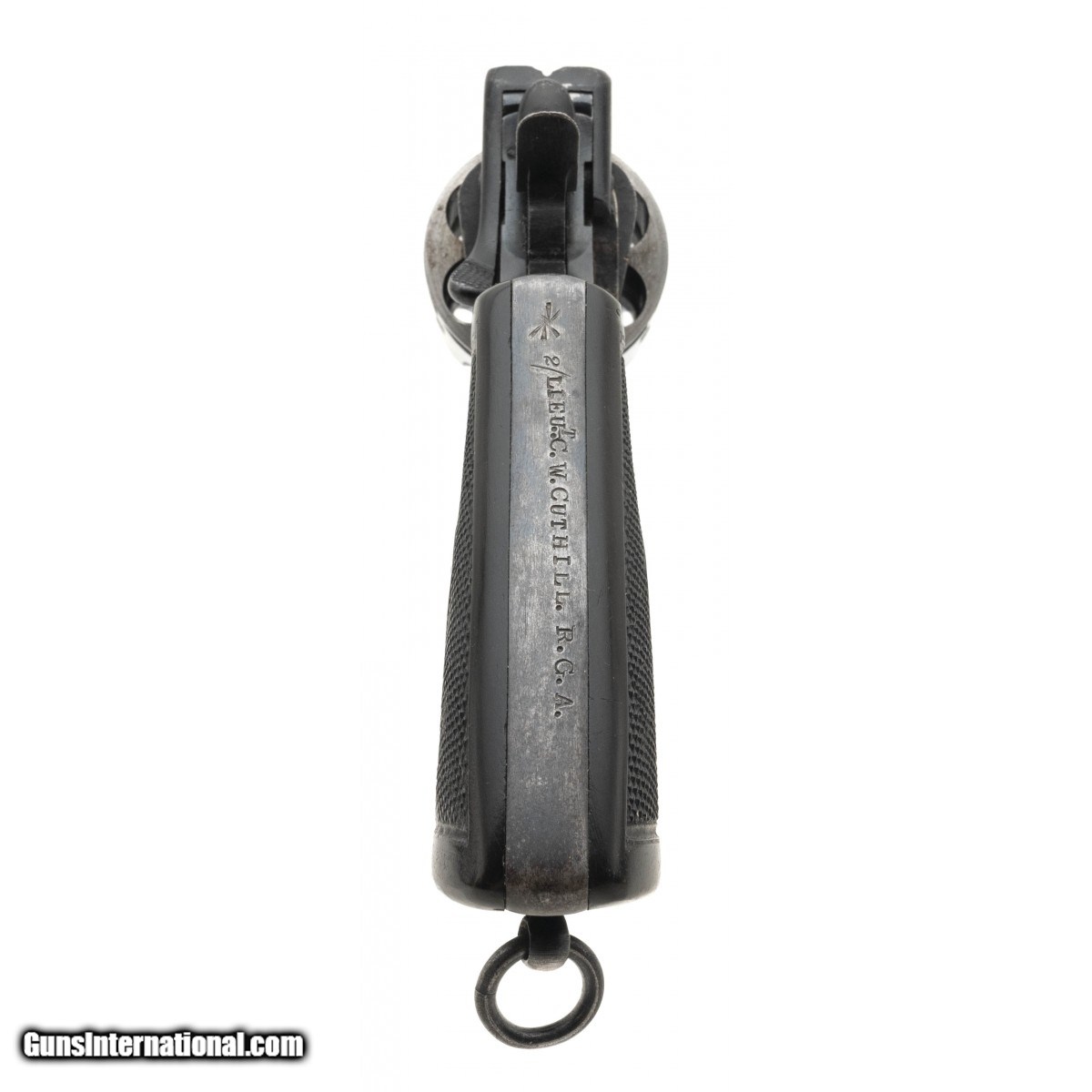 Serial No. 180451, made in 1915, .45acp, 6"" barrel. Finish is approximately 95%, back strap is engraved with ""Lieu../T. C.W. Cuthill R.G.A"". 2nd Lt. Cuthill was in charge of Heavy Artillery along the front lines. Bore shows strong rifling with light frosting visible in the grooves, Brown checkered grips are very good with slight scratches visible. Cuthill would receive the Victory Medal and British War Medal. The cylinder unfortunately has been shaved to accept .45acp in moon clips. CONSIGNMENT.