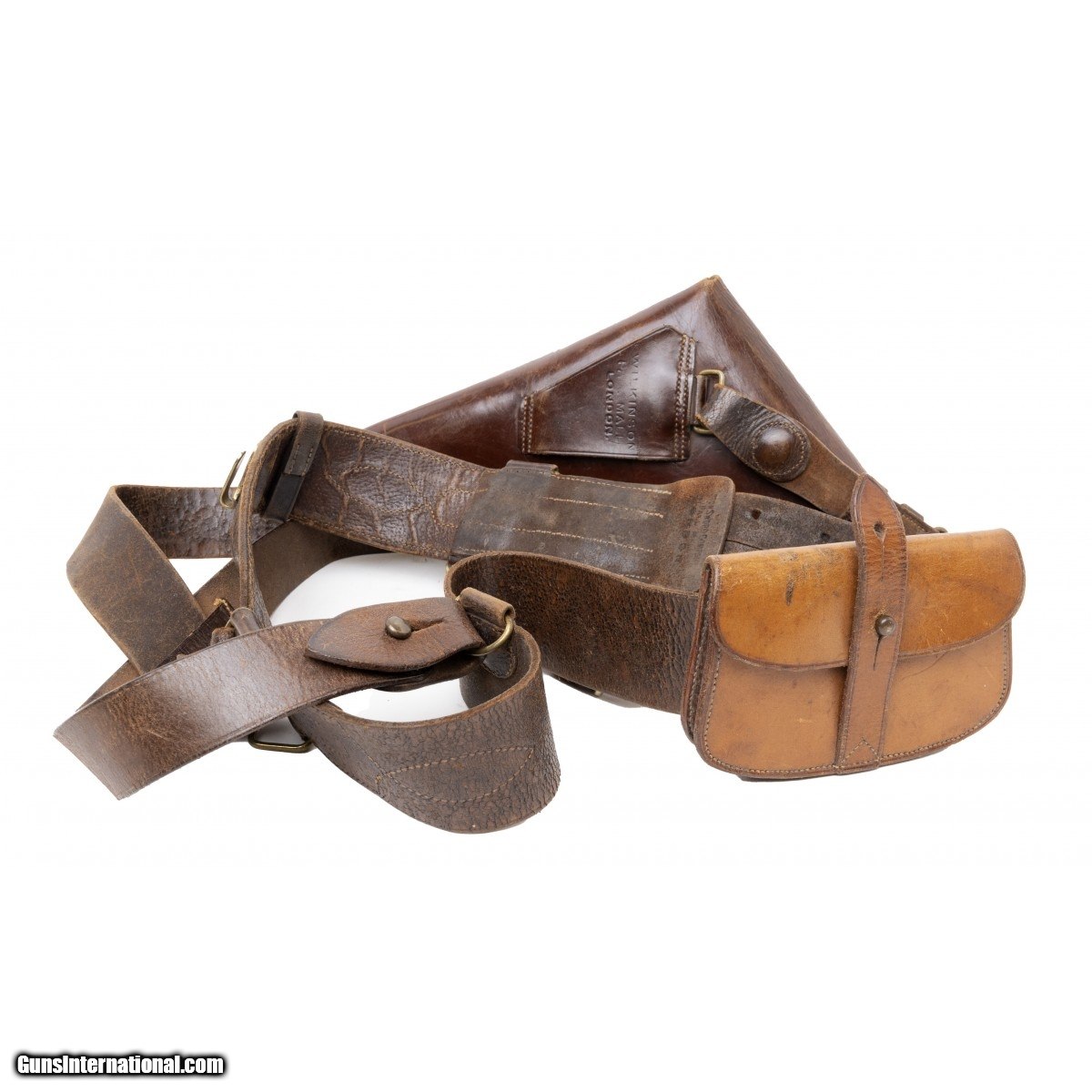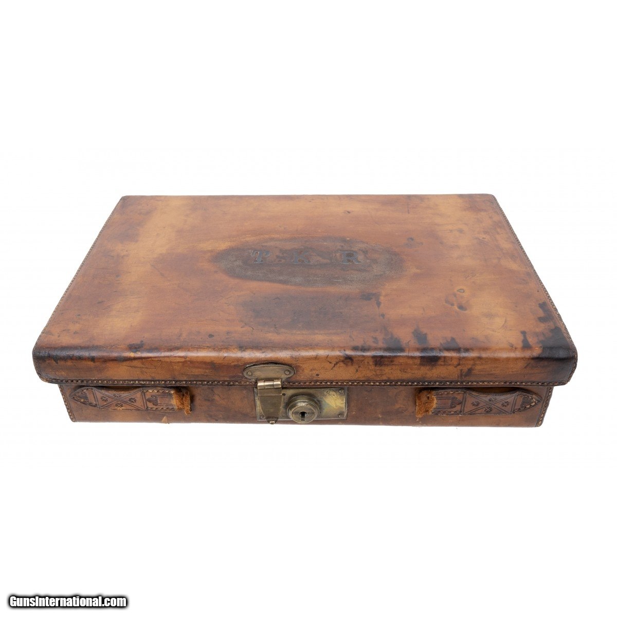 Description: " This revolver is marked on the barrel rib ""WILKINSON SWORD CO. PALL MALL LONDON"". This revolver is marked in a silver roundel ""TKR"" on the left side grip and is marked TKR on the lid of the leather luggage style case as is often found on personalized cases such as this. TKR was ""Thomas Kane McClintock Bunbury He was the2nd Baron of Rathdonnell 1848-1929,and his family addressed him as TKR. He was a member of Irish Aristocracy and served as Colonel in the Royal Irish Rifles .Additional information on TKR is included covering his service in the political arena such as lord Lieutenant of County Carlow and other posts. Included with this set is his holster (marked ""Wilkinson, Pall Mall London""). Along with his military belt and cartridge pouch also marked Wilkinson. The shoulder strap has a provision for his ""over the top"" whistle used by officers to signal to the troops in the trenches to climb out and attack the enemy usually resulting in the severe casualties of trench warfare. Photos of TKR as a young man and in later years are included. It is unusual to find such a complete ensemble intact as is this assembly. The revolvers has 90% original blue. Action works perfectly and barrel is also perfect in appearance. Grips show handling wear as to be expected years of service. SOLD Curio/Relic: Yes |