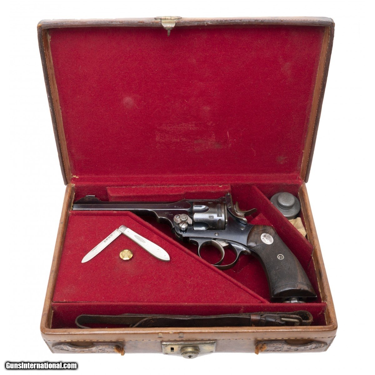 This revolver is marked on the barrel rib ""WILKINSON SWORD CO. PALL MALL LONDON"". This revolver is marked in a silver roundel ""TKR"" on the left side grip and is marked TKR on the lid of the leather luggage style case as is often found on personalized cases such as this. TKR was ""Thomas Kane McClintock Bunbury He was the2nd Baron of Rathdonnell 1848-1929,and his family addressed him as TKR. He was a member of Irish Aristocracy and served as Colonel in the Royal Irish Rifles .Additional information on TKR is included covering his service in the political arena such as lord Lieutenant of County Carlow and other posts. Included with this set is his holster (marked ""Wilkinson, Pall Mall London""). Along with his military belt and cartridge pouch also marked Wilkinson. The shoulder strap has a provision for his ""over the top"" whistle used by officers to signal to the troops in the trenches to climb out and attack the enemy usually resulting in the severe casualties of trench warfare. Photos of TKR as a young man and in later years are included. It is unusual to find such a complete ensemble intact as is this assembly. The revolvers has 90% original blue. Action works perfectly and barrel is also perfect in appearance. Grips show handling wear as to be expected years of service.