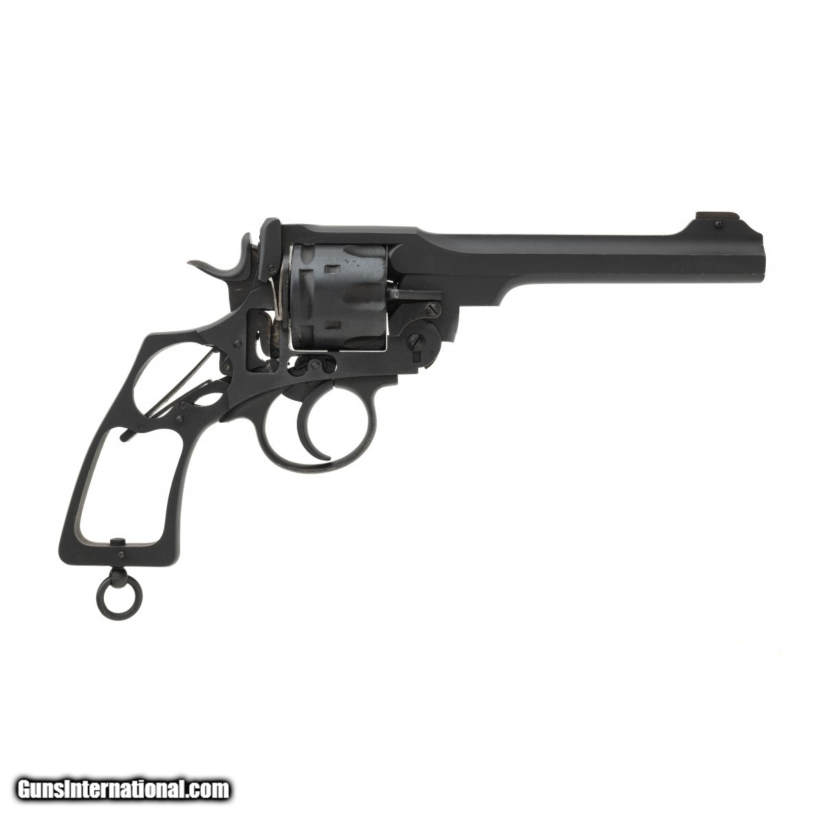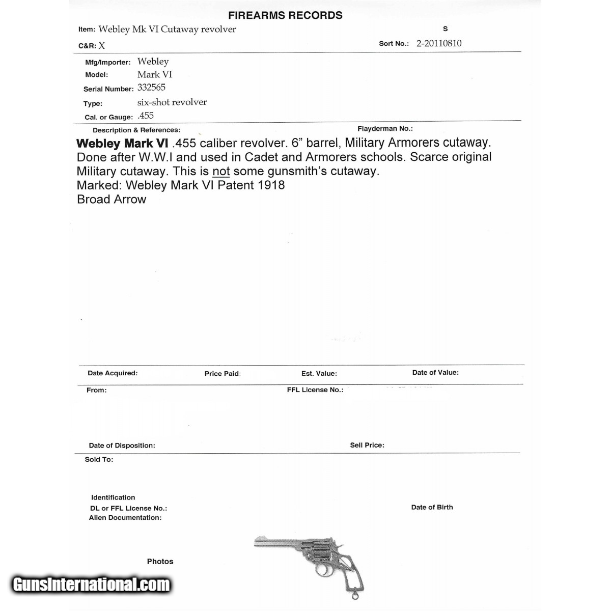 Serial No. 322565, made in 1918, .455, 6"" barrel. Scarce factory cutaway made after the war for cadet and Armorers schools. Webley is unit marked on the back strap ""T.B./M.C.S/19"", Bore is good with strong rifling visible, action functions correctly. CONSIGNMENT.
