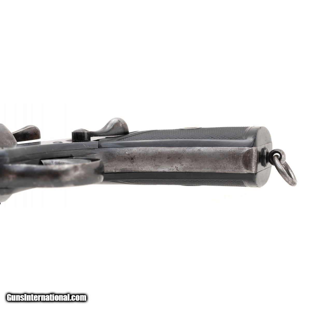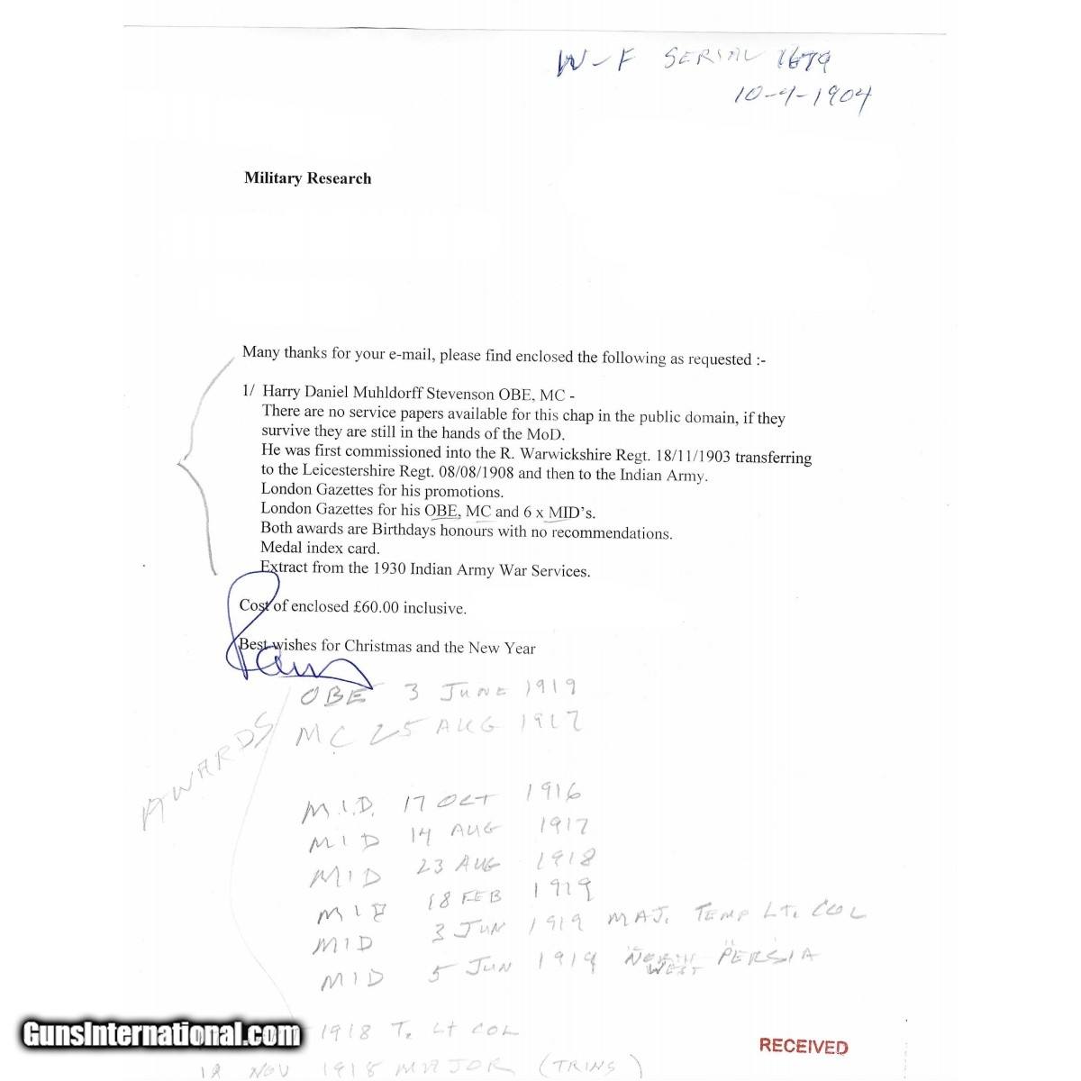 Description: " Serial No. 1679, circa 1903, .455 Cordite, 6"" Army & Navy C.S.L. marked barrel. 90% original blue remains with scattered grey patina noted. Bore is good with frosting visible in the strong rifling. Checkered Brown grips show light wear. Records indicate this Fosbery was issued to 2nd Lt. H. Stevenson who would serve in the Indian Army mostly with the Supply and Transport Corps. Stevenson would rise to the Ranks of Major and would be mentioned 6 times in Dispatches for Bravery! A copy of these dispatches are included. Action functions correctly. SOLD Curio/Relic: Yes |