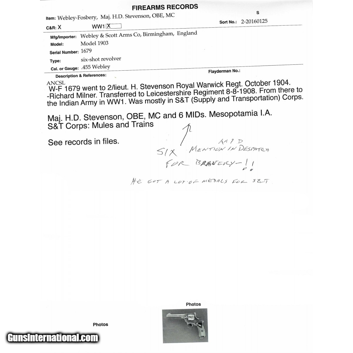 Serial No. 1679, circa 1903, .455 Cordite, 6"" Army & Navy C.S.L. marked barrel. 90% original blue remains with scattered grey patina noted. Bore is good with frosting visible in the strong rifling. Checkered Brown grips show light wear. Records indicate this Fosbery was issued to 2nd Lt. H. Stevenson who would serve in the Indian Army mostly with the Supply and Transport Corps. Stevenson would rise to the Ranks of Major and would be mentioned 6 times in Dispatches for Bravery! A copy of these dispatches are included. Action functions correctly.