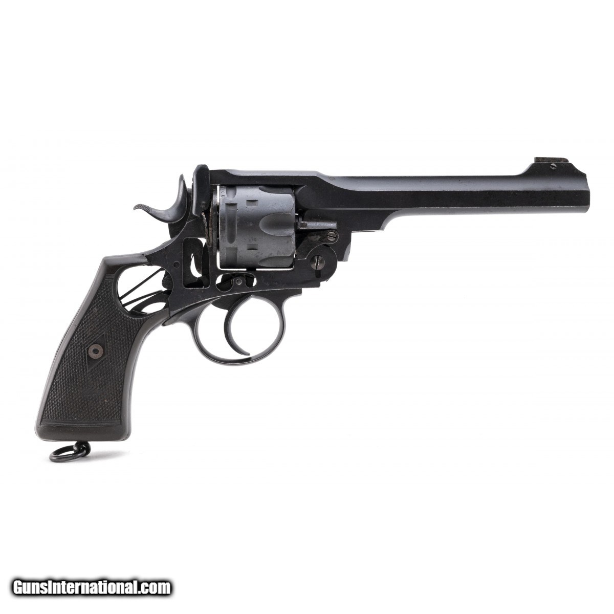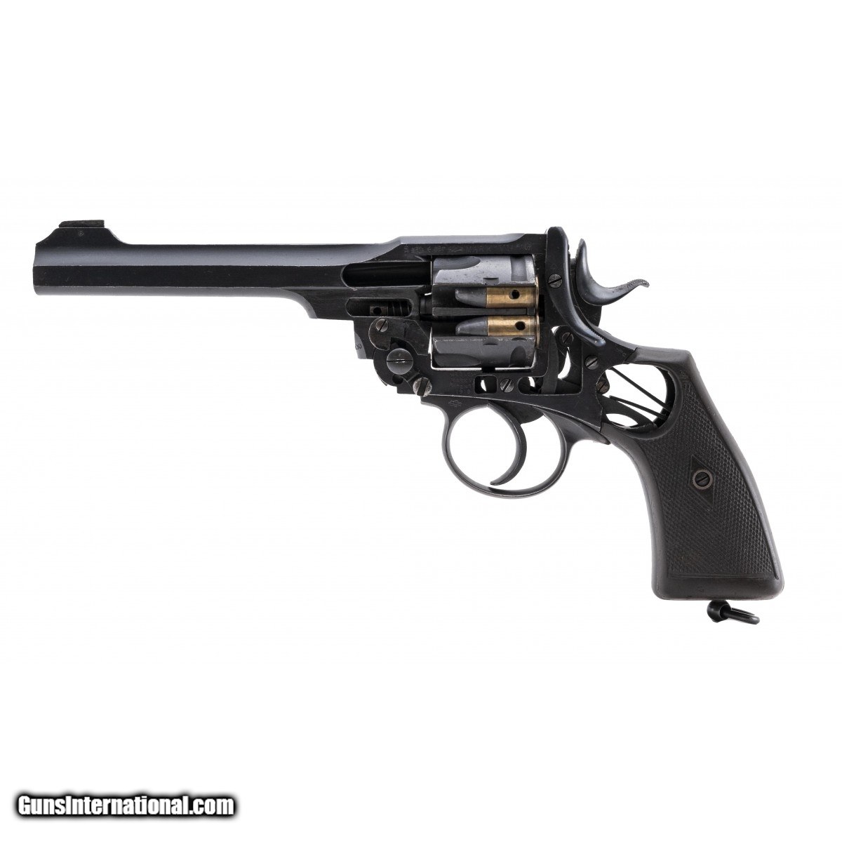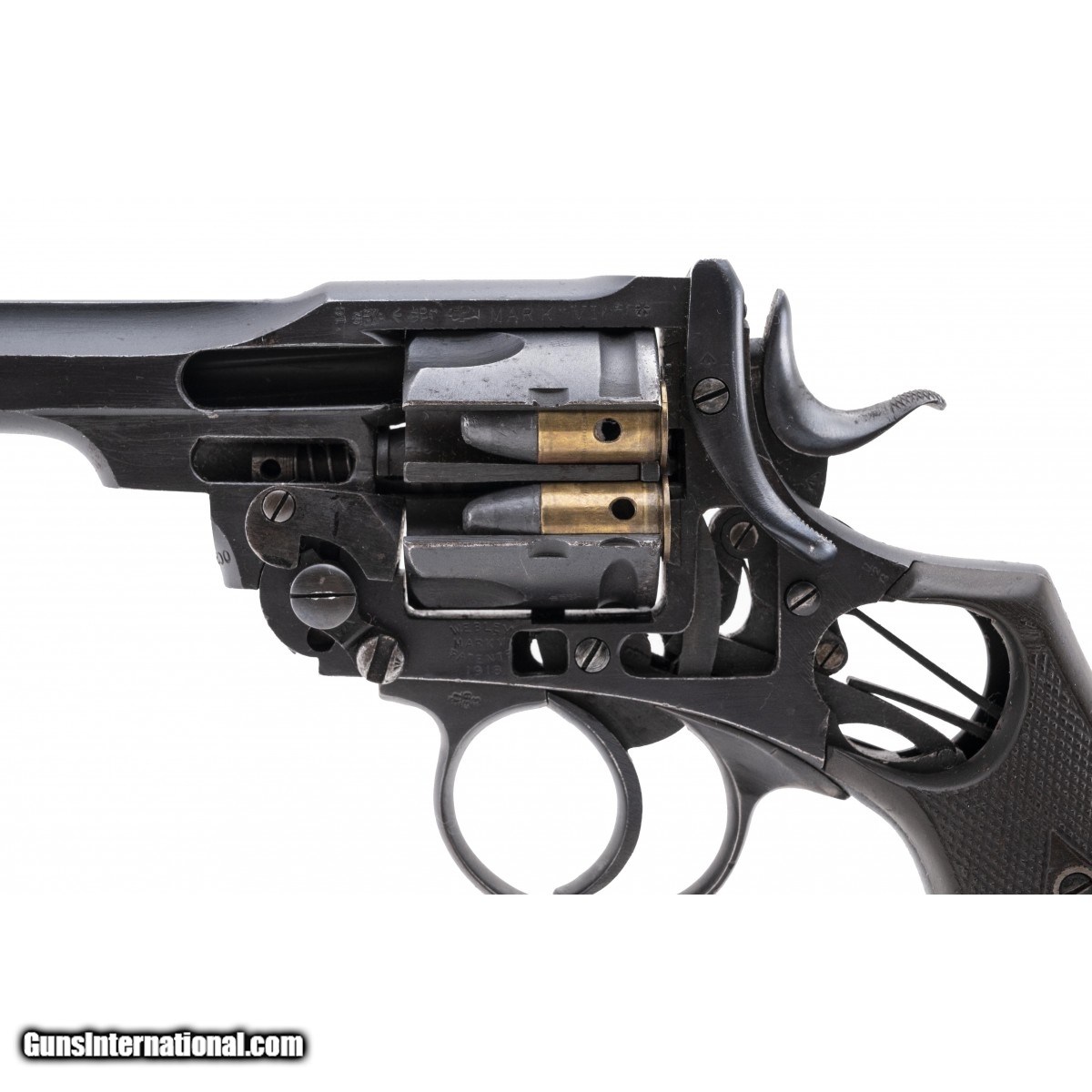 Scarce cut-away revolver. Cylinder has two dummy rounds inserted. Frame is dated 1918. Very good overall condition. A great addition for a Webley collector.