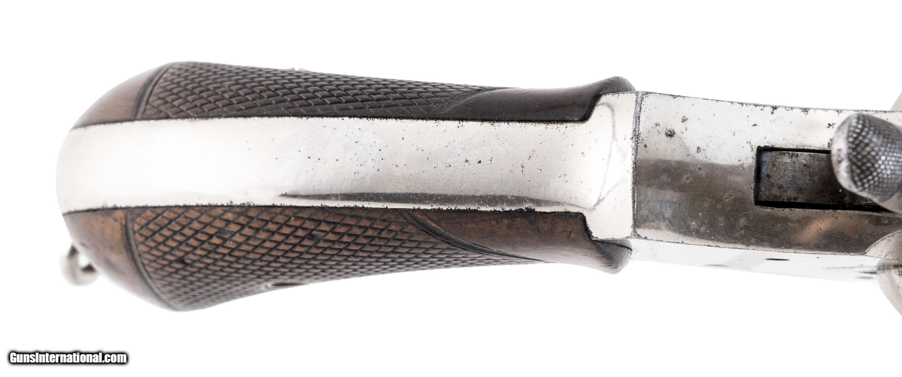 Description: "Very fine example with approximately 95% original nickel plating. Top strap is marked ""P. Webley & Son Birmingham"". Serial number 4856. Barrel is 5.5"" and has Birmingham proofs. Bore is very good with strong rifling and some very minor frosting. Grips are very good, no chips cracks or repairs. Action works perfectly. A desirable, high condition, Webley revolver. Curio/Relic: Yes Price: $4,975.00 Contact Seller |