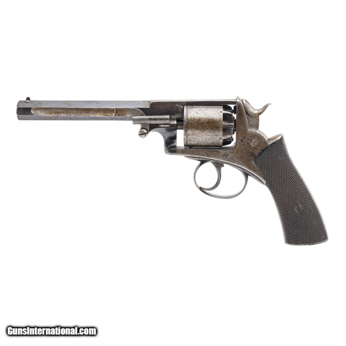 Serial No. 5108, circa 1850's, .44 caliber, 6.25"" octagonal barrel. Majority of its original blue remains on the barrel, thinning out on the edges and frame. Bore is good with surface oxidation noted in the grooves. Top strap is marked ""P Webley & Son's Maker"" Left side of the frame is marked ""Patent N.o 5108"". Brown two piece checkered grips are sharp with light wear noted. Action indexes correctly. Consignment