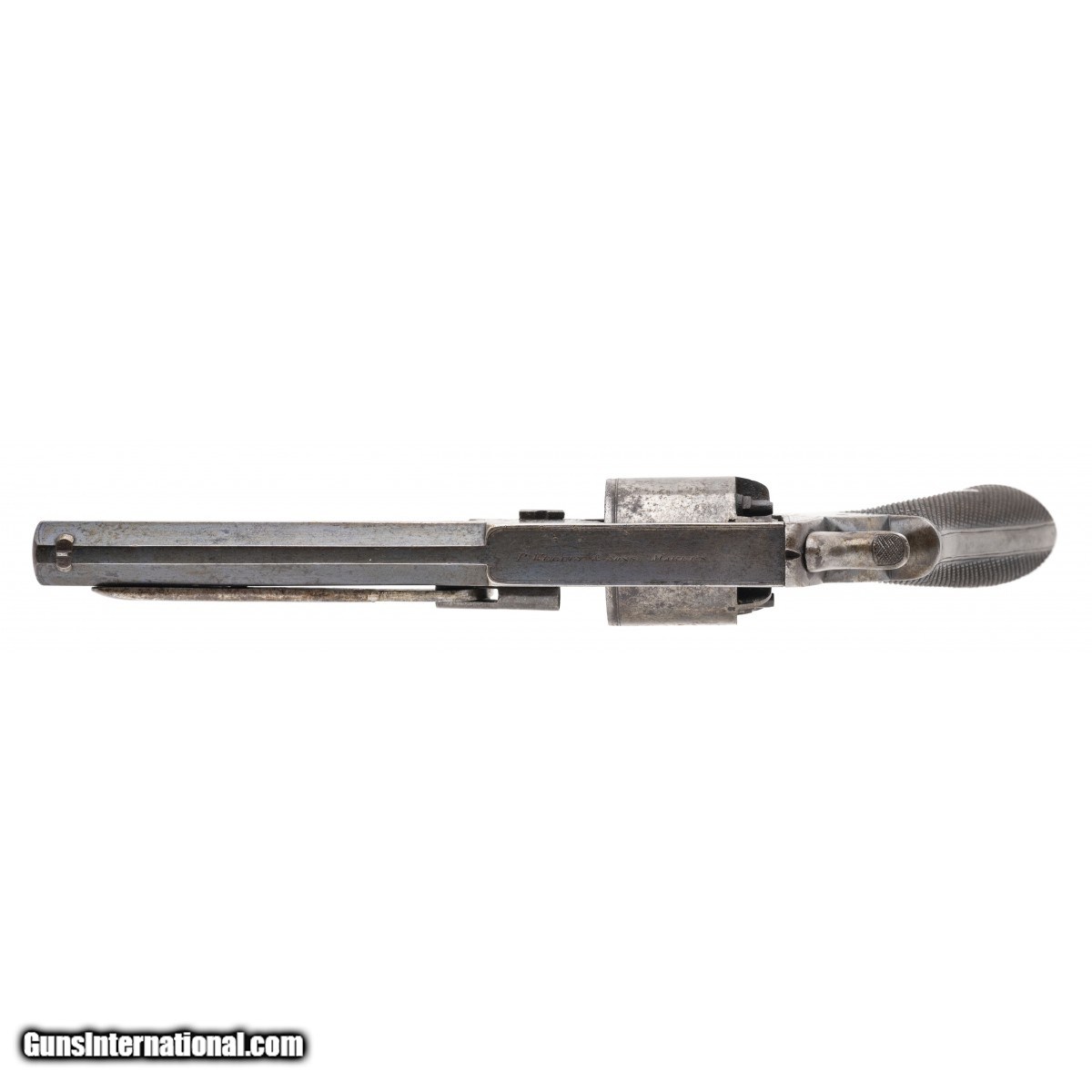 Description: " Serial No. 5108, circa 1850's, .44 caliber, 6.25"" octagonal barrel. Majority of its original blue remains on the barrel, thinning out on the edges and frame. Bore is good with surface oxidation noted in the grooves. Top strap is marked ""P Webley & Son's Maker"" Left side of the frame is marked ""Patent N.o 5108"". Brown two piece checkered grips are sharp with light wear noted. Action indexes correctly. Consignment SOLD Antique: Yes |