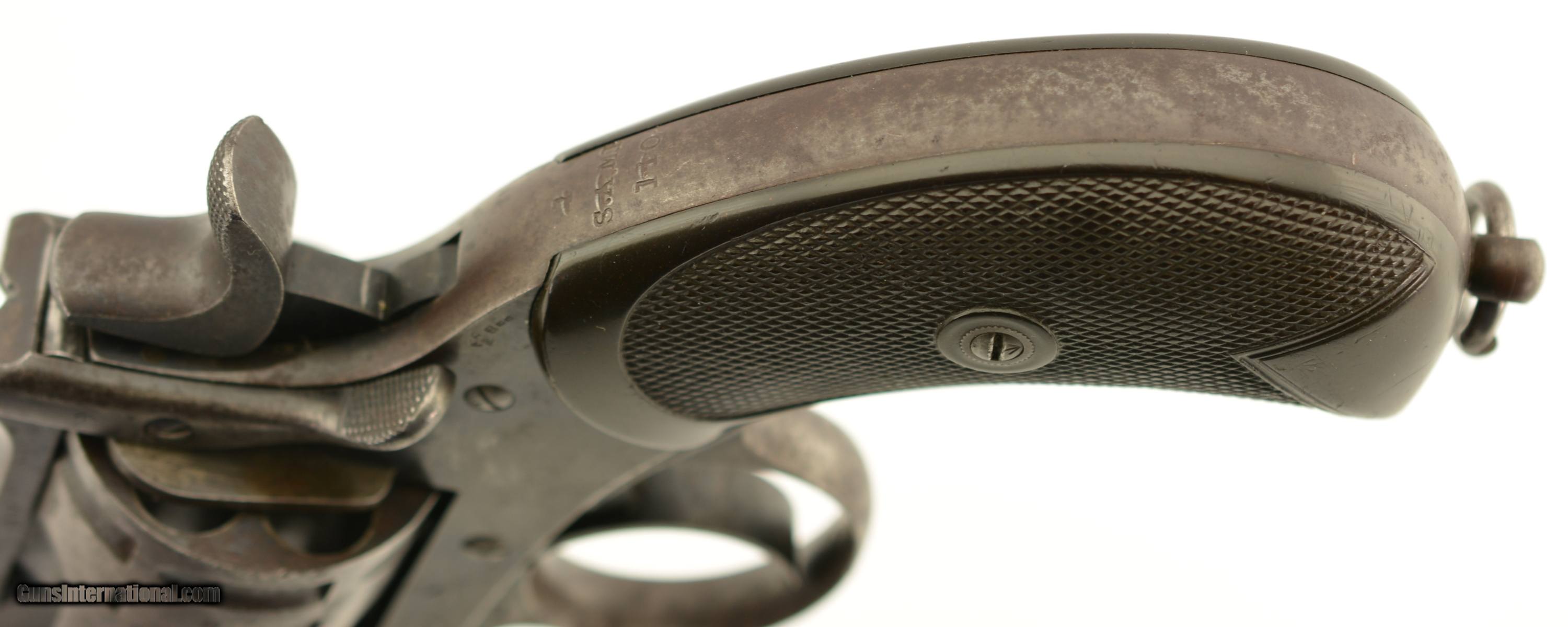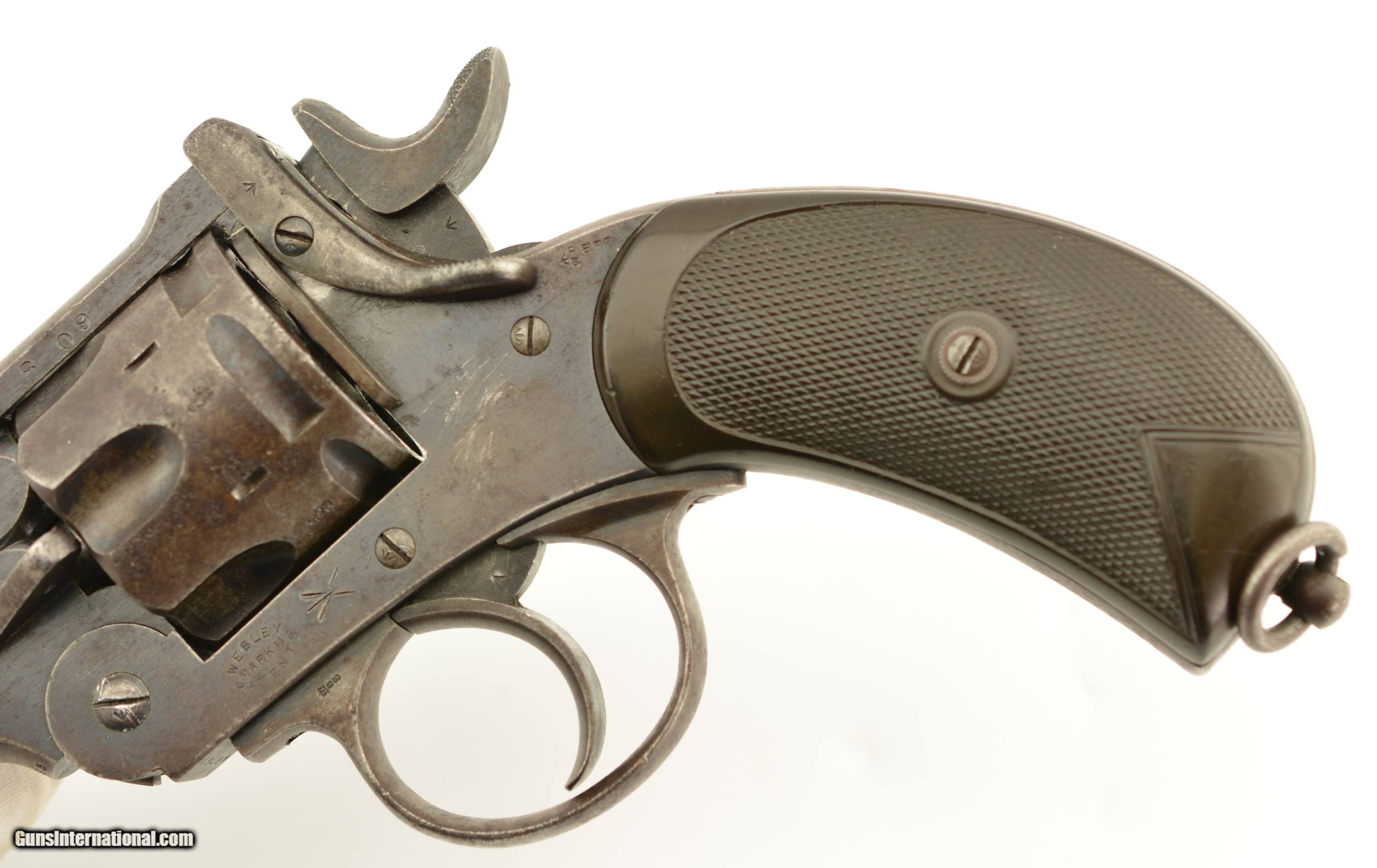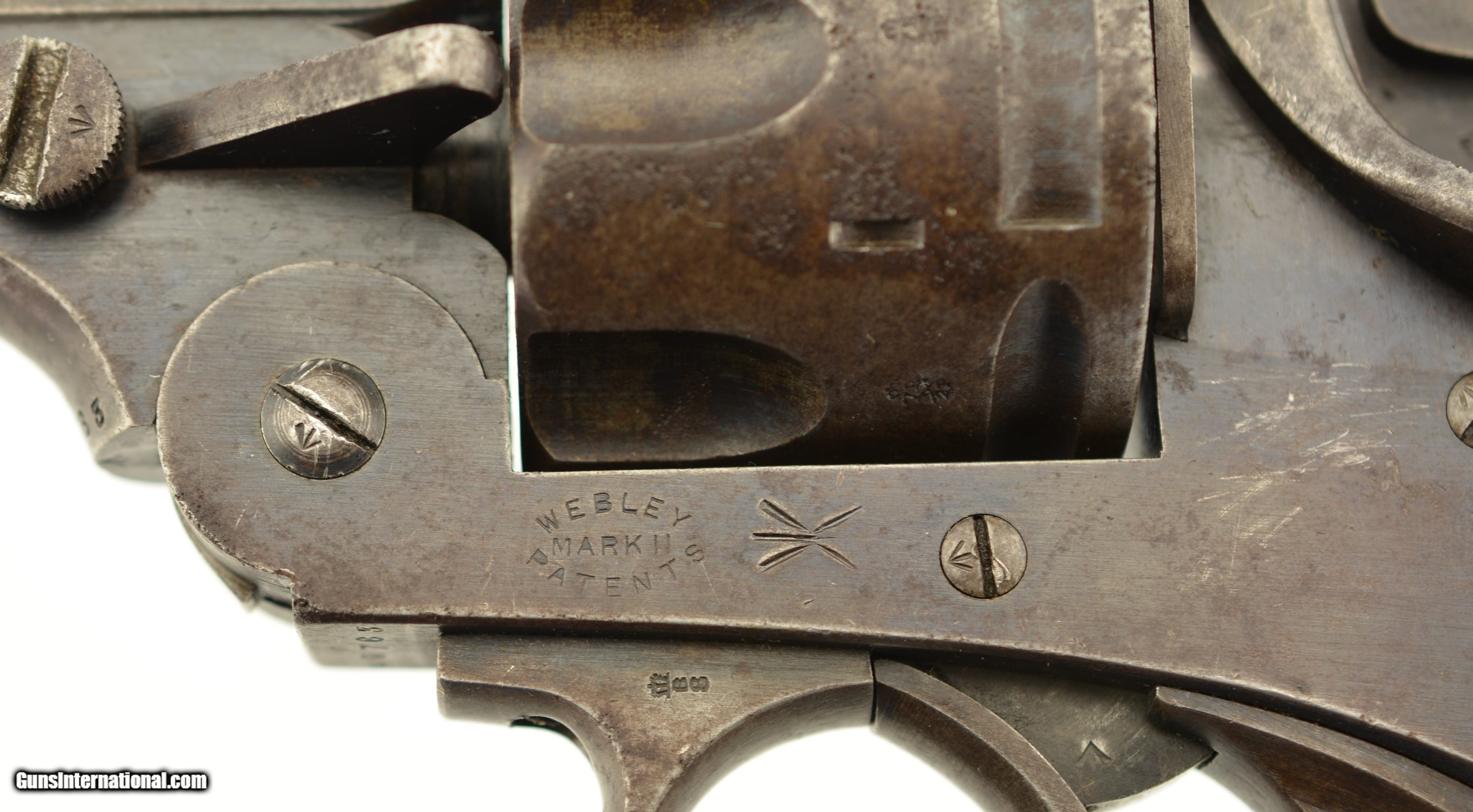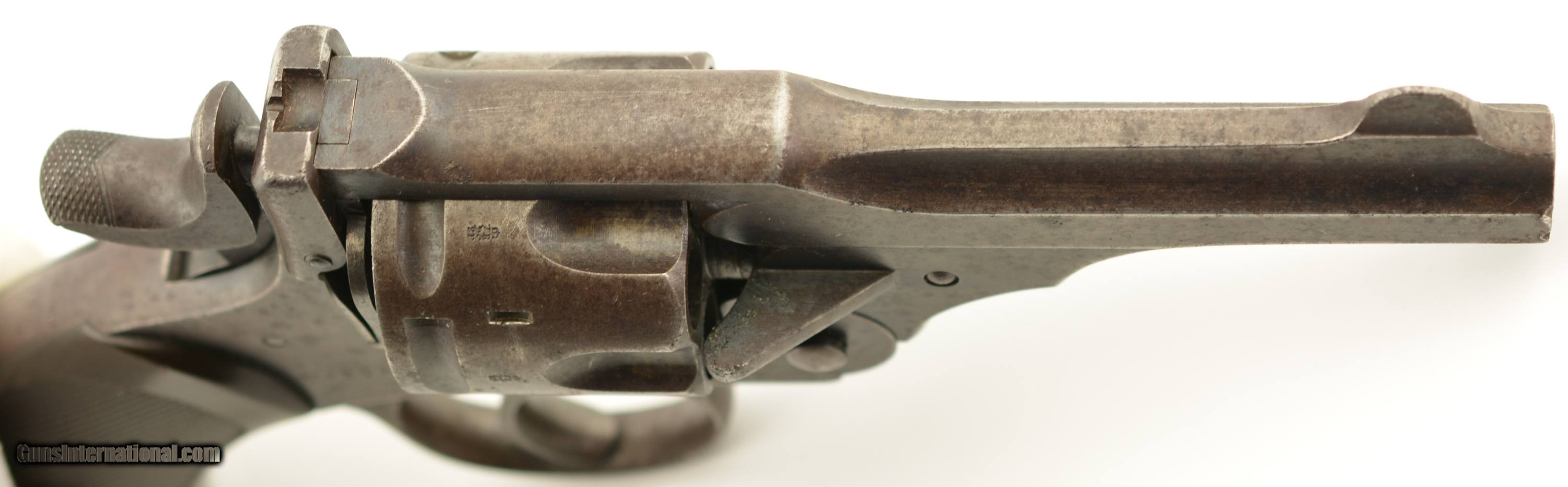 Description: Serial #40763, .455 Webley, 4" barrel with a fine, bright bore that has traces of mild freckling within the grooves. This is an all-matching numbered revolver that has retained approximately 50% of the original brushed blue finish, with the balance freckled plum-brown. Additionally, there is fairly bright silvering along the high edges and some minor surface scratches on the sides of the frame. Some dents are present on the sides of the muzzle as well. The revolver has numerous Broad Arrow property stamps, “8 09" issue date on the topstrap, along with a struck out "1 / S.A.M.R. / 110" unit stamp on the backstrap (1st South African Mounted Riflemen / 110). Double arrow civilian sale stamps are present on the frame and barrel as well. The checkered hard rubber, Broad Arrow marked grips are in fine shape with some minor flattening of the points, as well as a few minor scratches and handling blemishes on either panel. The lock-up is still tight and the mechanism functions flawlessly. The South African Mounted Riflemen were formed in 1913, and were the successors to the Cape Mounted Riflemen, a military unit that acted as mounted police in peacetime. During World War 1 they fought in German South-West Africa, and were also deployed against the Rand Rebellion in 1922. This is a very good example of a desirable Boer War Webley model, with a fantastic South African unit marking. Antique SOLD Antique: Yes Manufacturer: Webley Model: MK.II Caliber Info: .455 Gauge Info: .455 |