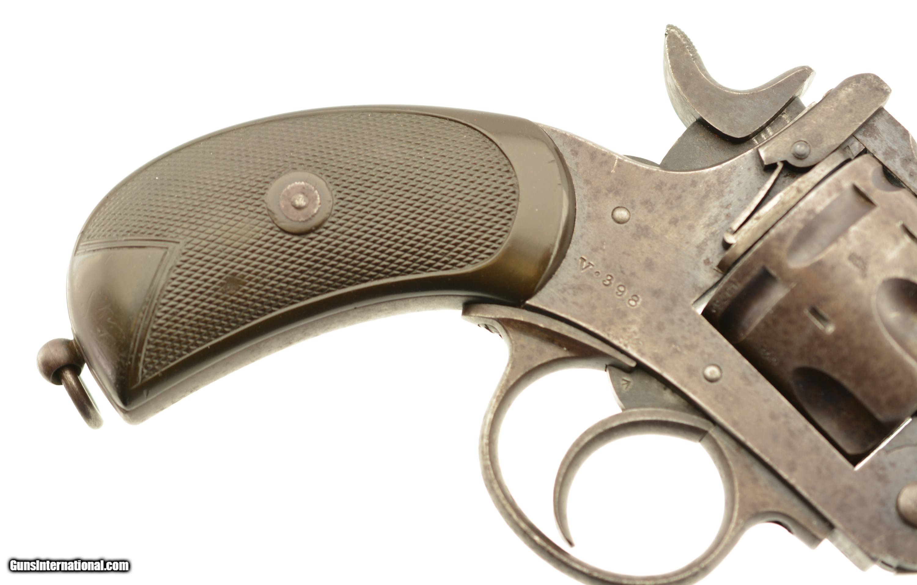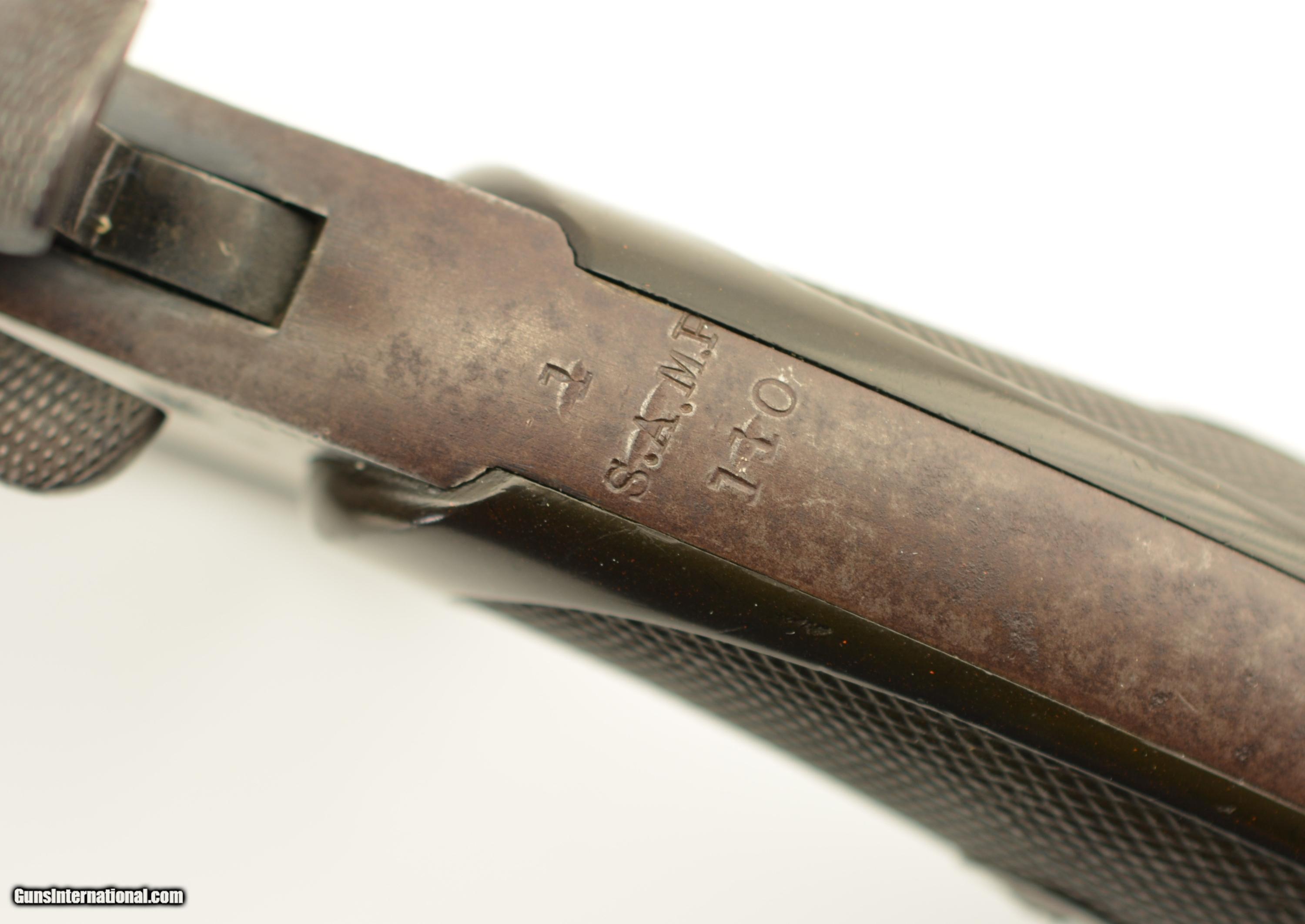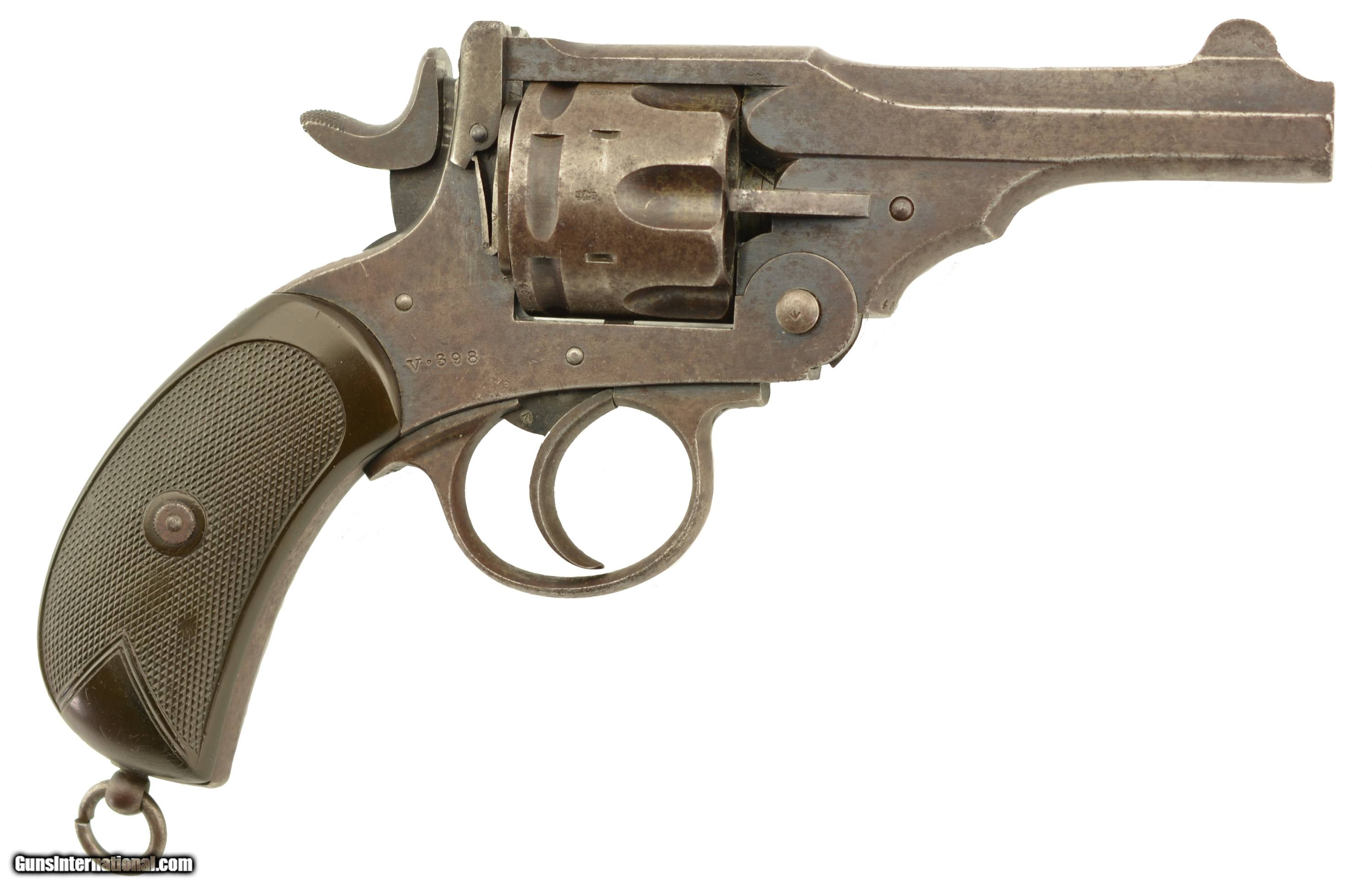 Description: Serial #40763, .455 Webley, 4" barrel with a fine, bright bore that has traces of mild freckling within the grooves. This is an all-matching numbered revolver that has retained approximately 50% of the original brushed blue finish, with the balance freckled plum-brown. Additionally, there is fairly bright silvering along the high edges and some minor surface scratches on the sides of the frame. Some dents are present on the sides of the muzzle as well. The revolver has numerous Broad Arrow property stamps, “8 09" issue date on the topstrap, along with a struck out "1 / S.A.M.R. / 110" unit stamp on the backstrap (1st South African Mounted Riflemen / 110). Double arrow civilian sale stamps are present on the frame and barrel as well. The checkered hard rubber, Broad Arrow marked grips are in fine shape with some minor flattening of the points, as well as a few minor scratches and handling blemishes on either panel. The lock-up is still tight and the mechanism functions flawlessly. The South African Mounted Riflemen were formed in 1913, and were the successors to the Cape Mounted Riflemen, a military unit that acted as mounted police in peacetime. During World War 1 they fought in German South-West Africa, and were also deployed against the Rand Rebellion in 1922. This is a very good example of a desirable Boer War Webley model, with a fantastic South African unit marking. Antique SOLD Antique: Yes Manufacturer: Webley Model: MK.II Caliber Info: .455 Gauge Info: .455 |