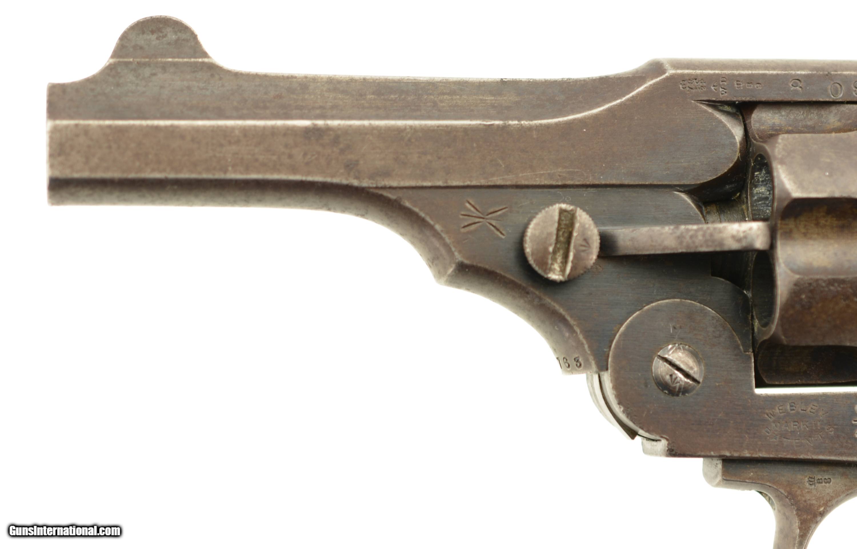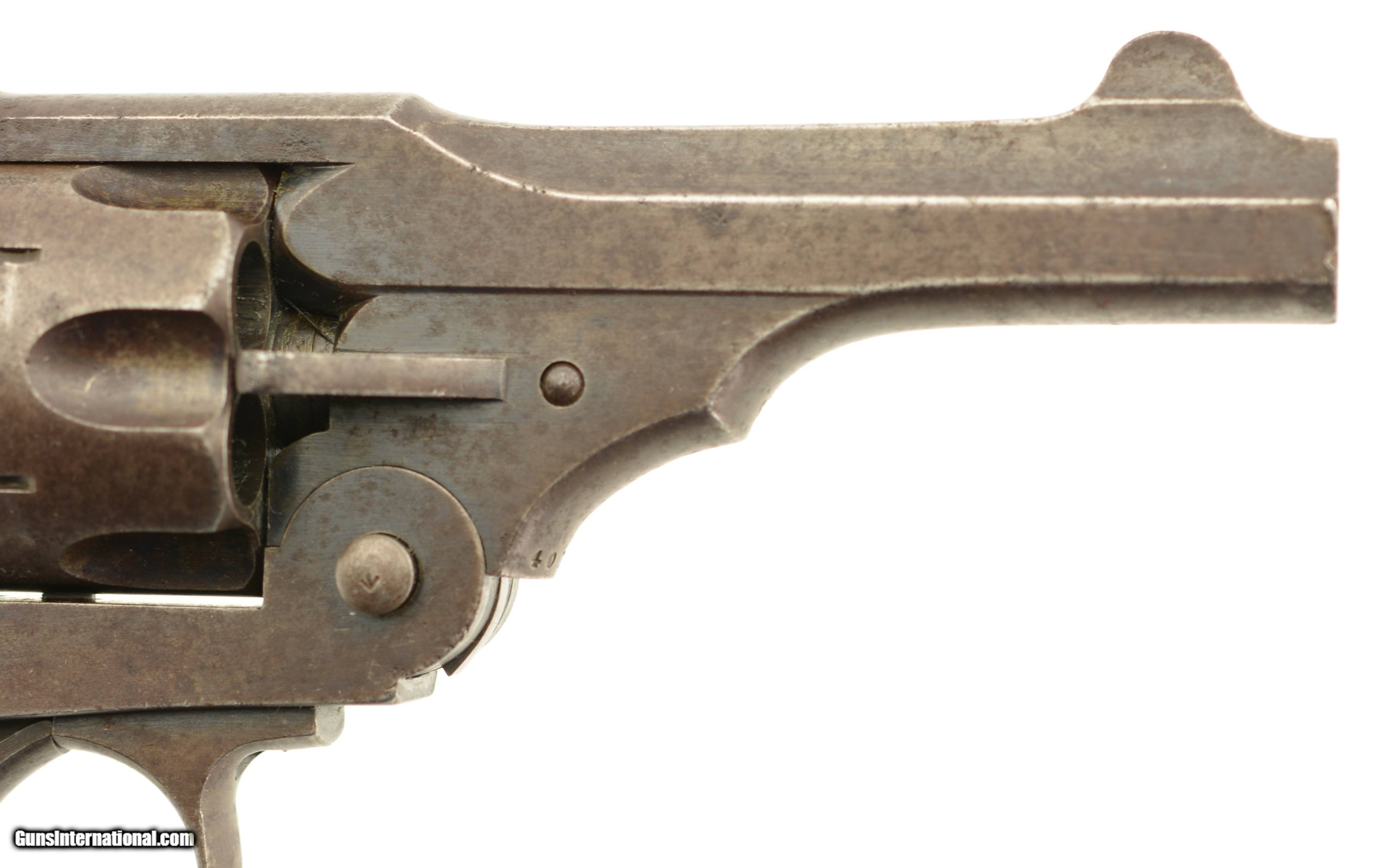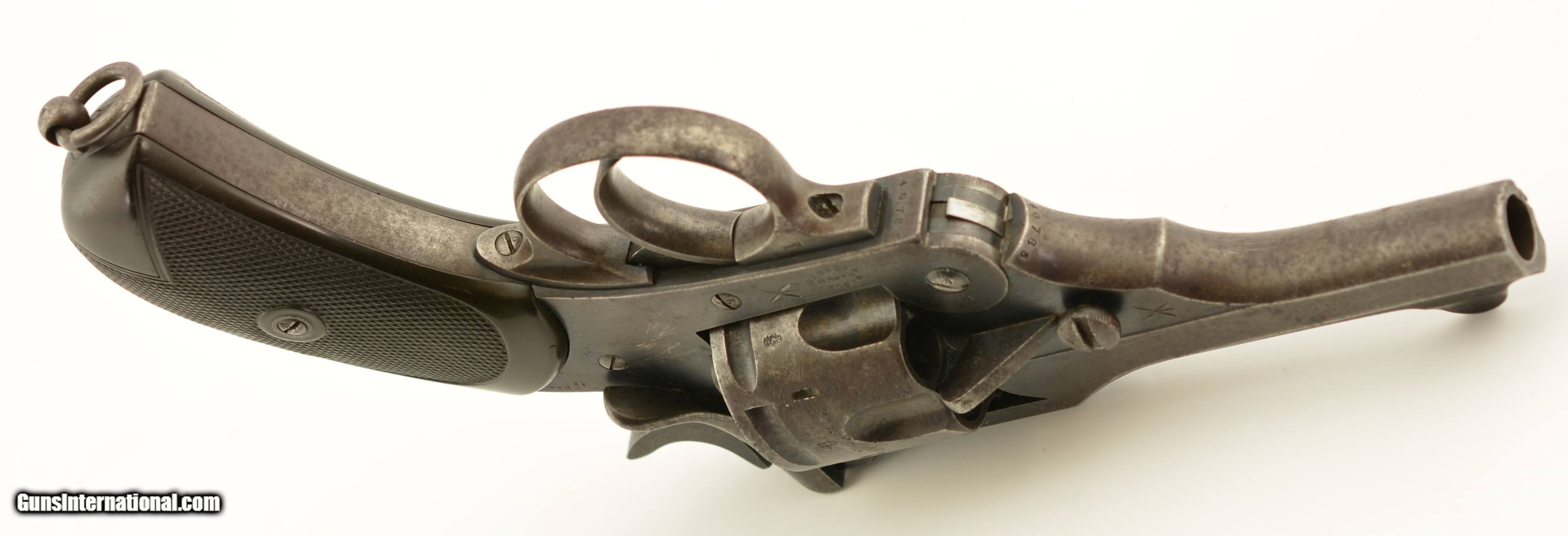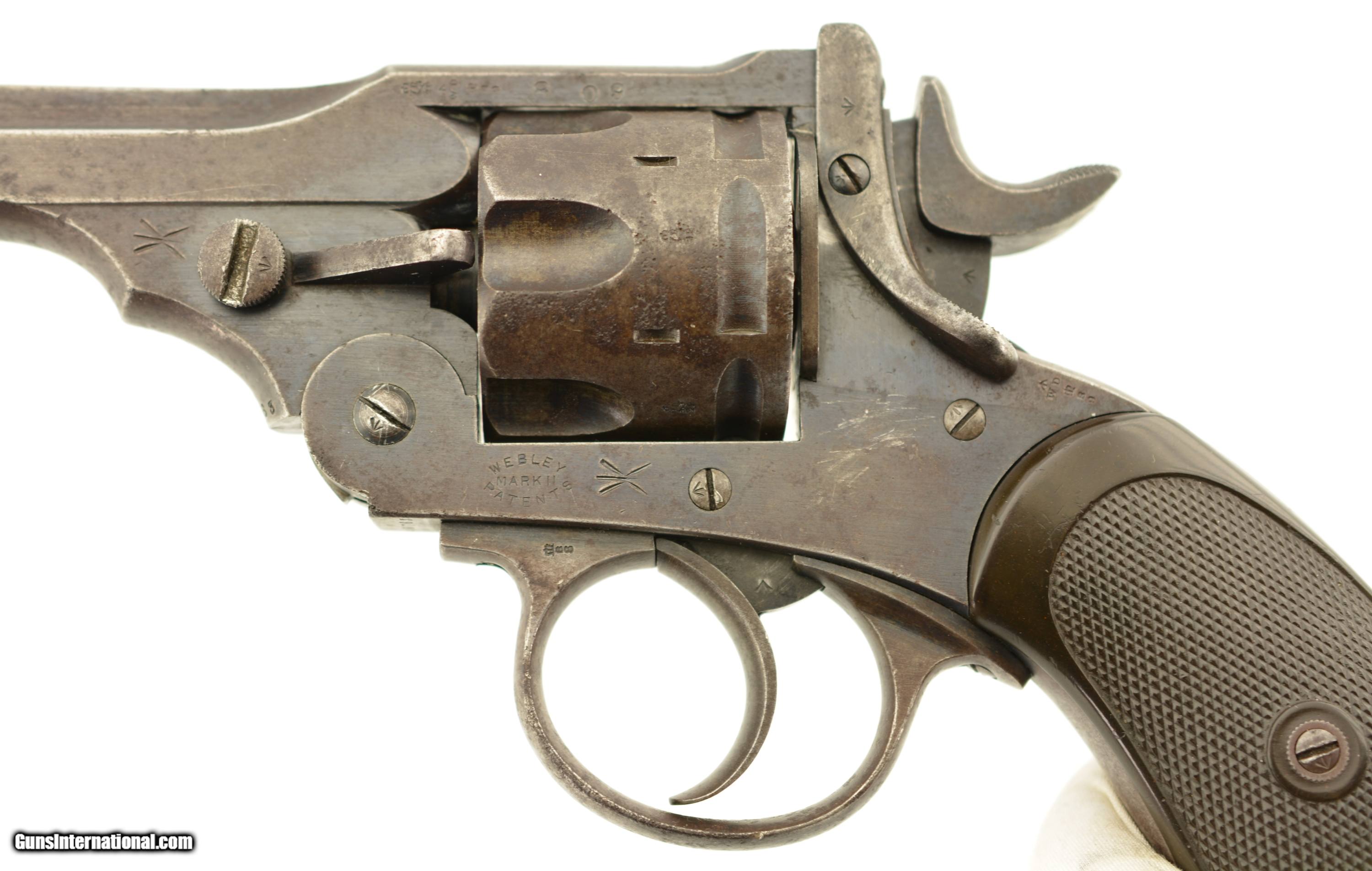 Description: Serial #40763, .455 Webley, 4" barrel with a fine, bright bore that has traces of mild freckling within the grooves. This is an all-matching numbered revolver that has retained approximately 50% of the original brushed blue finish, with the balance freckled plum-brown. Additionally, there is fairly bright silvering along the high edges and some minor surface scratches on the sides of the frame. Some dents are present on the sides of the muzzle as well. The revolver has numerous Broad Arrow property stamps, “8 09" issue date on the topstrap, along with a struck out "1 / S.A.M.R. / 110" unit stamp on the backstrap (1st South African Mounted Riflemen / 110). Double arrow civilian sale stamps are present on the frame and barrel as well. The checkered hard rubber, Broad Arrow marked grips are in fine shape with some minor flattening of the points, as well as a few minor scratches and handling blemishes on either panel. The lock-up is still tight and the mechanism functions flawlessly. The South African Mounted Riflemen were formed in 1913, and were the successors to the Cape Mounted Riflemen, a military unit that acted as mounted police in peacetime. During World War 1 they fought in German South-West Africa, and were also deployed against the Rand Rebellion in 1922. This is a very good example of a desirable Boer War Webley model, with a fantastic South African unit marking. Antique SOLD Antique: Yes Manufacturer: Webley Model: MK.II Caliber Info: .455 Gauge Info: .455 |