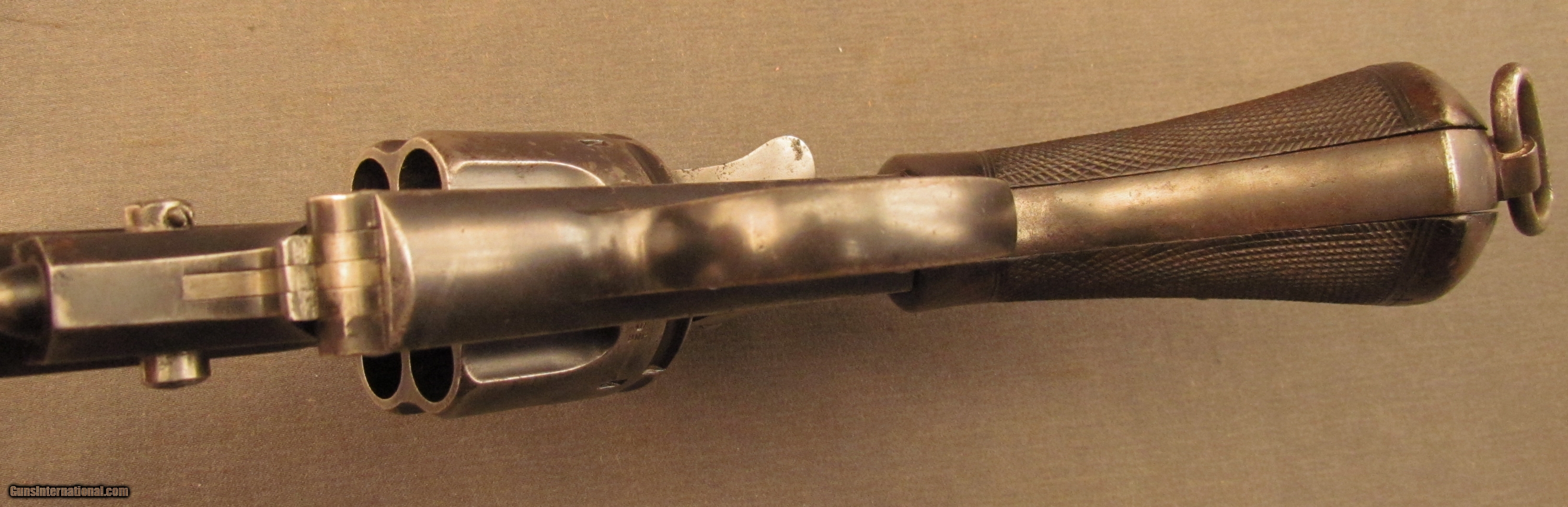 Description: Serial #906, .45 Colt, 5 3/4” octagon barrel with a very good-fine, bright bore that has some traces of light freckling within the grooves. The metal of this handsome revolver has retained about 75% of the original blue, mostly at the breech-end of the barrel, within the cylinder flutes, and along the left rear portion of the frame. The balance of the metal has developed a pewter gray and plum-brown patina with some scattered mild freckling, as well as a few areas of mild pinprick pitting, most noticeably on the right rear portion of the frame and on the left side of the barrel about midway down. The barrel rib is retailer marked: “ARMY & NAVY C.S.L.”; and the Webley “Winged Bullet” trademark is crisp and clear on the left side of the frame. A previous owner has engraved his name in crisp block capitals on the left breech of the barrel. Despite the post-1925 applied, supplemental Birmingham .455 .760” (.455 Mk. VI) proof marks, the revolver has been rechambered to .45 Colt, and the individual chambers have been expertly chamfered for the longer Colt cartridge. The checkered English walnut grips are assembly numbered to the gun on the interior (926) with both panels exhibiting some light surface wear, and mild flattening of the points. There are some further surface scratches and minor blemishes on the butt as well. The lock-up is still quite tight, although there is a very small amount of lateral play, and the mechanism is fully functional. This is a great looking, and rarely seen antique Webley that would make a great addition to any collection. {Ref: “The Webley Story” by William Chipchase Dowell; 1962} Antique SOLD Antique: Yes Manufacturer: Webley Model: Kaufmann Serial Number: 906 Caliber Info: .45 LC Gauge Info: .45 LC |
