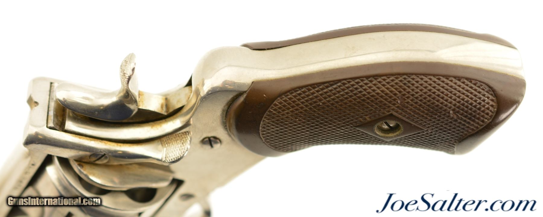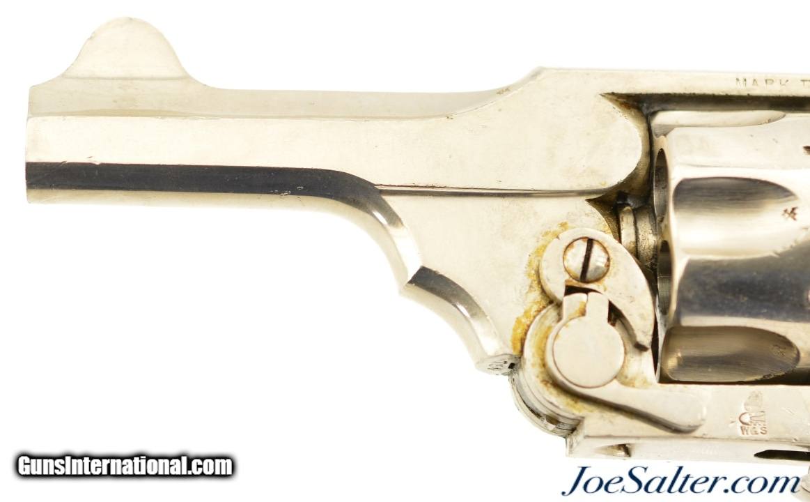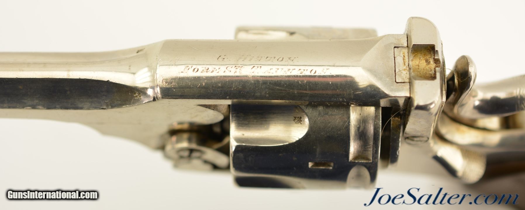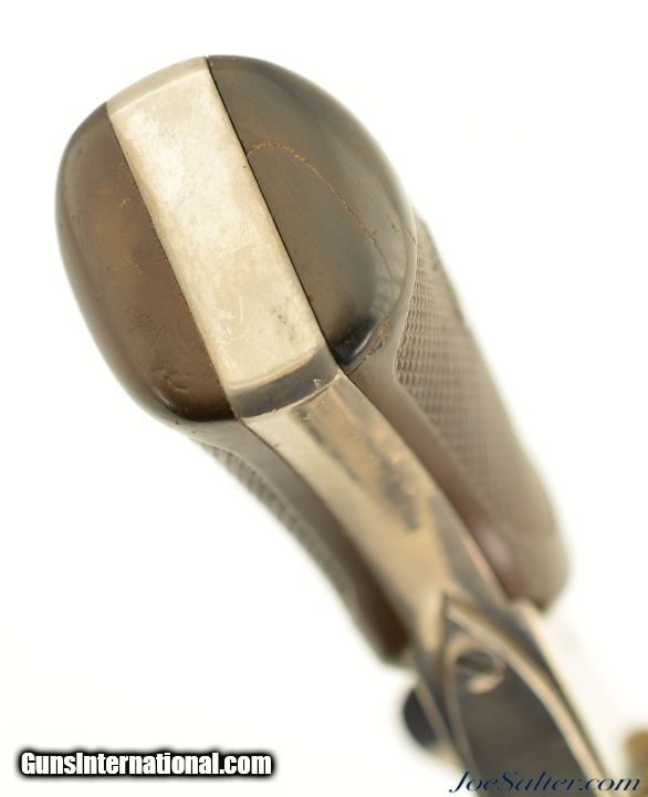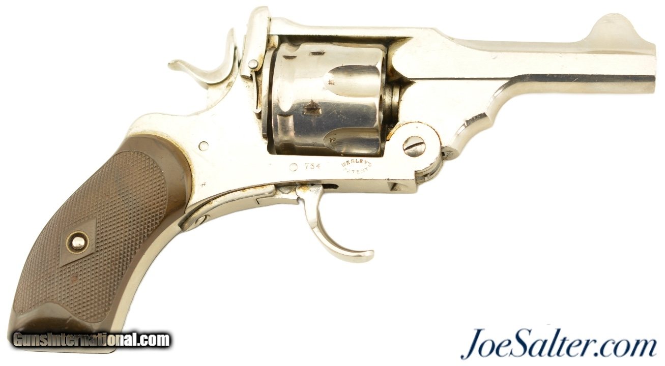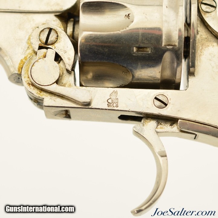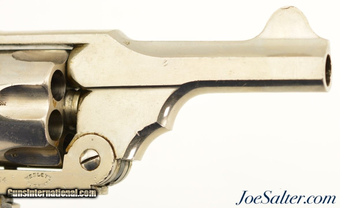 Description: Serial #754, .380 Revolver, 3" barrel with a very good bore that has even freckling throughout. This is a handsome revolver that has matching numbers on the frame, cylinder, and barrel, and is fitted with the rare folding trigger. The metal retains 92-95% of a maker reapplied nickel finish that has scattered small marks and blemishes, as well as some spots of brown freckling in spots. A faint, but still legible retailer name is present on the topstrap: "G. HINTON / TAUNTON", and the Webley "Winged Bullet" logo is crisp on the left side of the frame. The checkered hard rubber grips are in very condition with minor wear, and a repaired chip on the butt of the right panel. The barrel lock-up is tight and the mechanism is fully functional. This is a very good example of a highly desirable, .380 Webley with folding trigger. Antique; SOLD Antique: Yes |