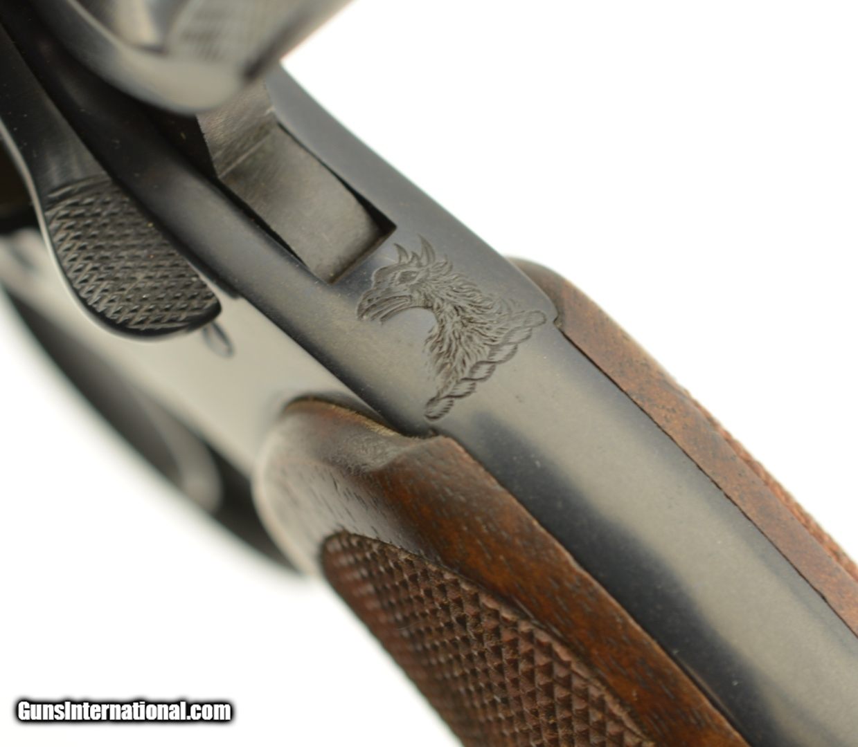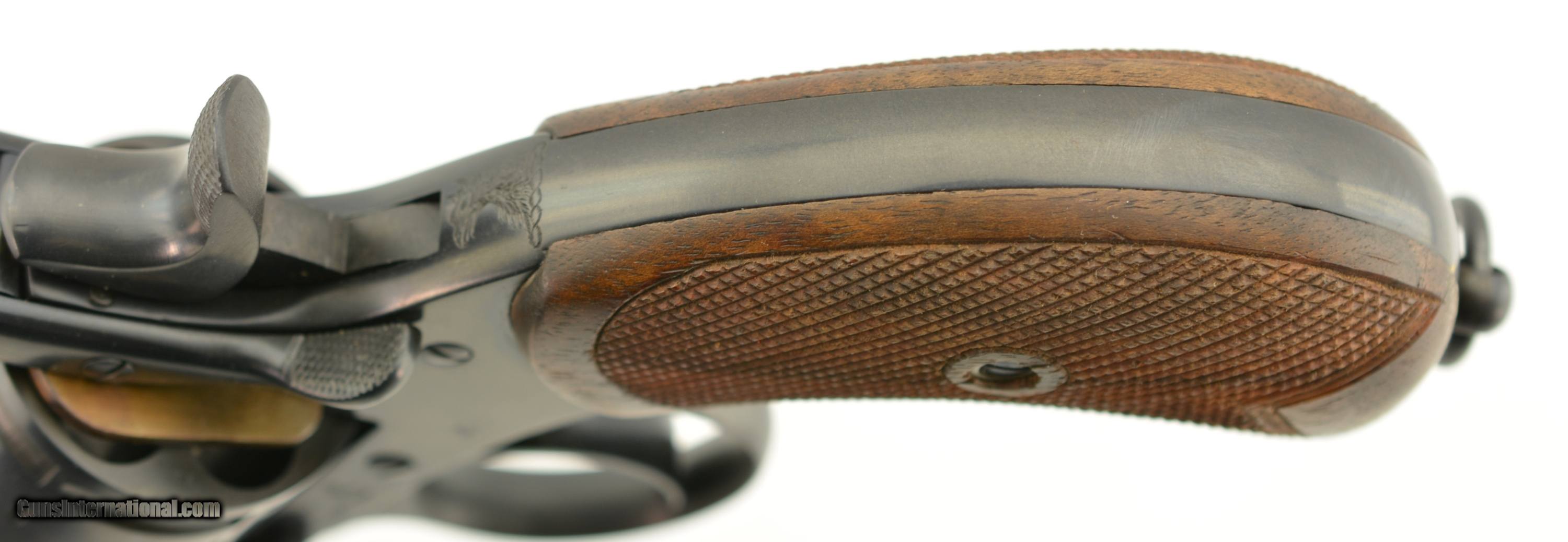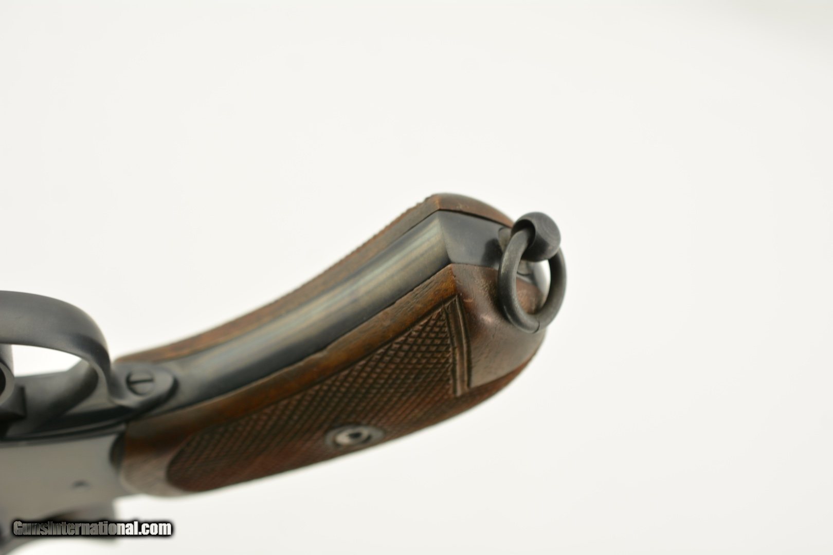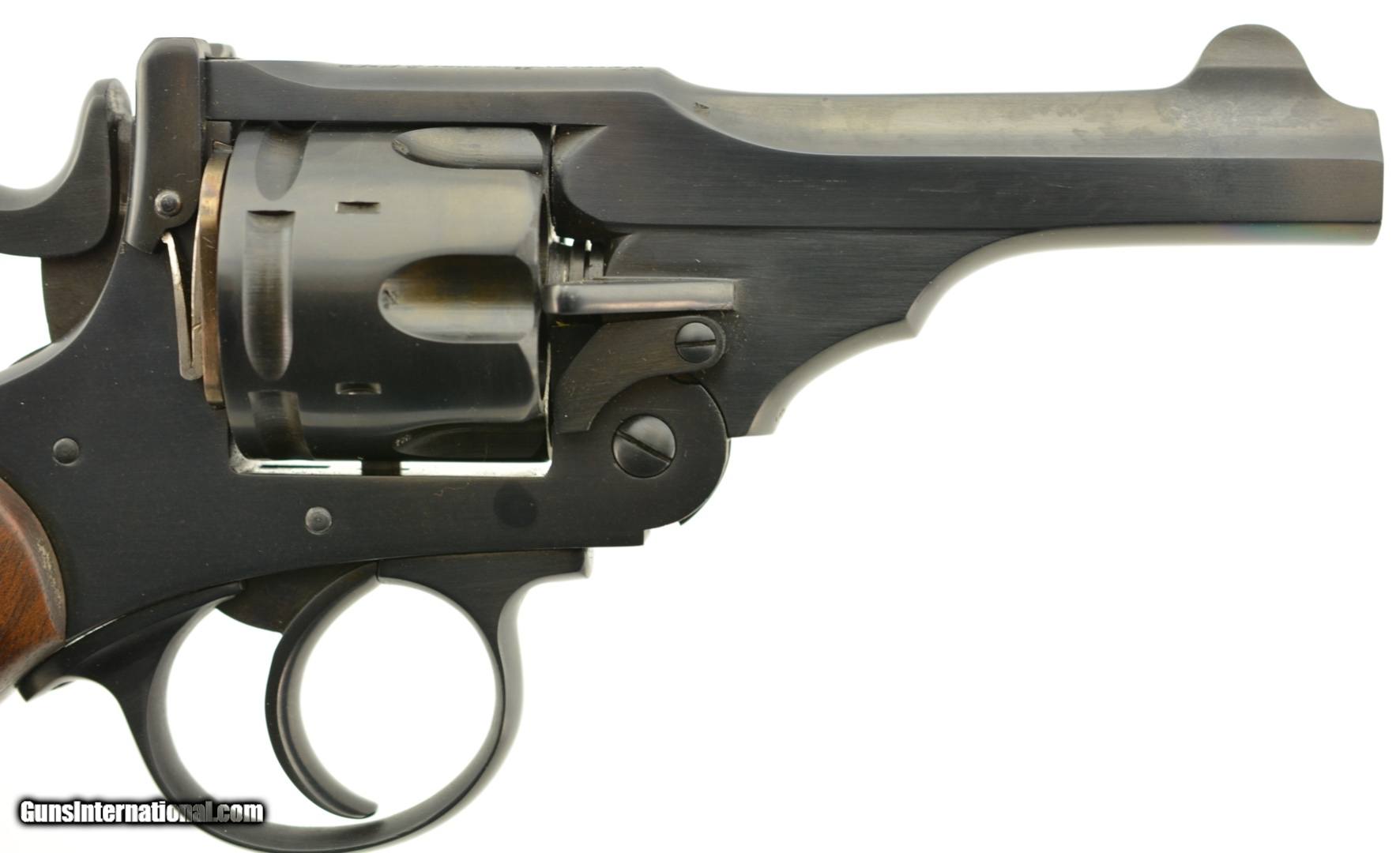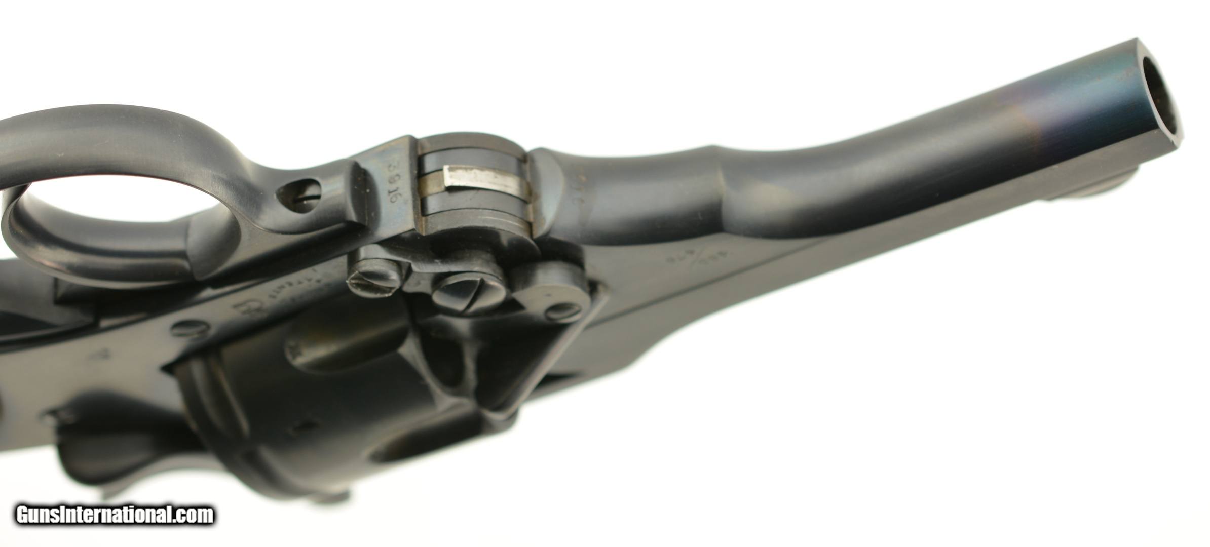Description: Serial #3916, .455 Webley, 4" barrel with a fine, bright bore that has traces of freckling within the grooves towards the breech. This revolver has matching numbers on the frame, barrel, and cylinder, with the metal retaining virtually all of an expertly reapplied blue finish that has left the edges and markings crisp and clear. "WESTLEY RICHARDS & Co. Ld. / LONDON. W" is engraved along the topstrap, and an armorial crest depicting the head of a Griffin is present at the top of the backstrap, just below the hammer. The finely checkered, modern walnut grips are in excellent shape and exhibit almost no wear or flattening of the points. The lock-up is rock-solid, and the action functions flawlessly. This is a truly handsome Mk. IV Webley, and is in excellent restored condition. FFL or C&R SOLD Curio/Relic: Yes |
