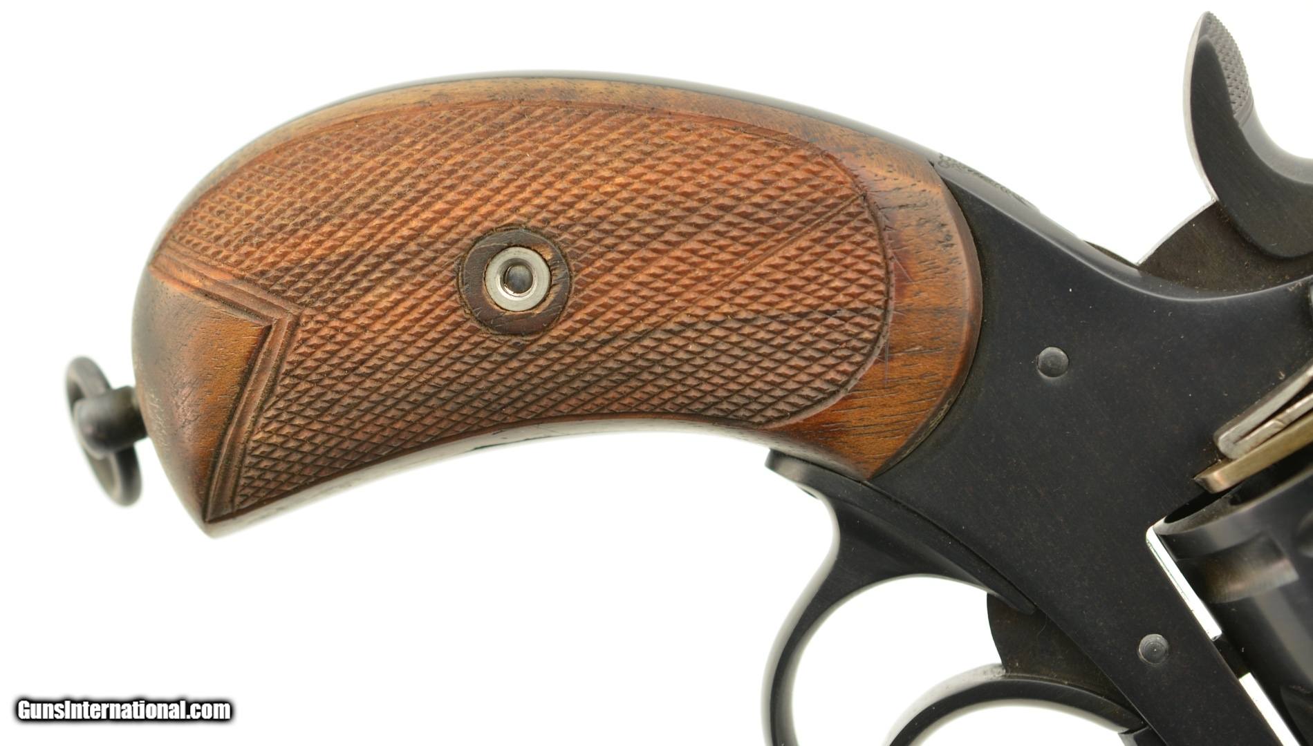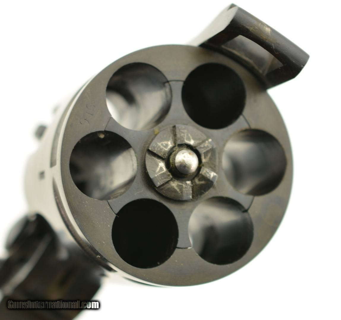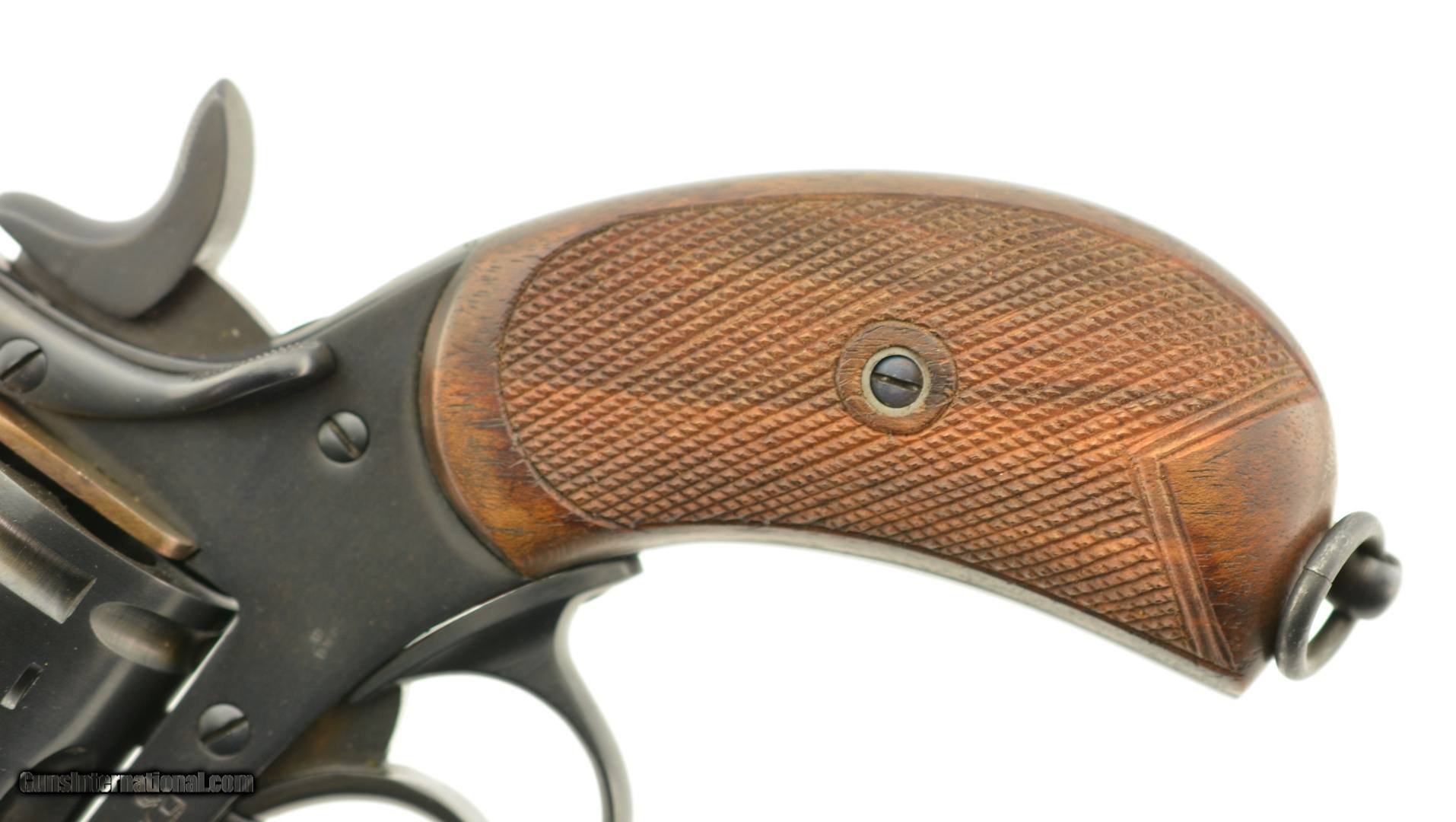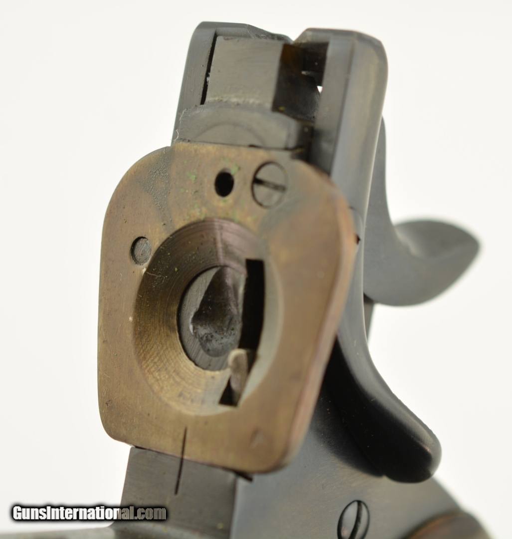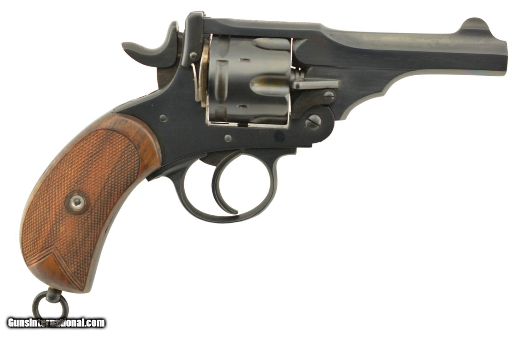 Description: Serial #3916, .455 Webley, 4" barrel with a fine, bright bore that has traces of freckling within the grooves towards the breech. This revolver has matching numbers on the frame, barrel, and cylinder, with the metal retaining virtually all of an expertly reapplied blue finish that has left the edges and markings crisp and clear. "WESTLEY RICHARDS & Co. Ld. / LONDON. W" is engraved along the topstrap, and an armorial crest depicting the head of a Griffin is present at the top of the backstrap, just below the hammer. The finely checkered, modern walnut grips are in excellent shape and exhibit almost no wear or flattening of the points. The lock-up is rock-solid, and the action functions flawlessly. This is a truly handsome Mk. IV Webley, and is in excellent restored condition. FFL or C&R SOLD Curio/Relic: Yes |