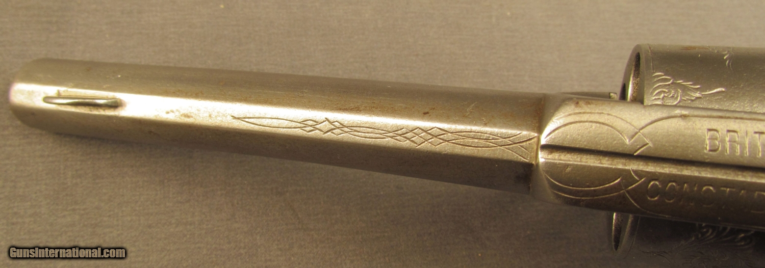 Description: S# 34, .500 revolver, 5 1/2 inch barrel, good bore with strong rifling and with light erosion throughout. This revolver has pre 1898 Belgian proofs and remains in very good condition with a light patina developing on the cleaned metal surfaces that show light engraving and scattered areas of light pitting. The Gutta Percha grips show a griffon and elephant on each side with floral design. Right side has a small crack near top and is quite worn. Left side shows less wear and sun fading. Action works well, front trigger guard screw and lanyard loop are missing. An interesting large bore revolver. SOLD Antique: Yes Manufacturer: Belgian Model: British Constabulary Serial Number: 34 Caliber Info: .500 Webley Gauge Info: .500 Webley |