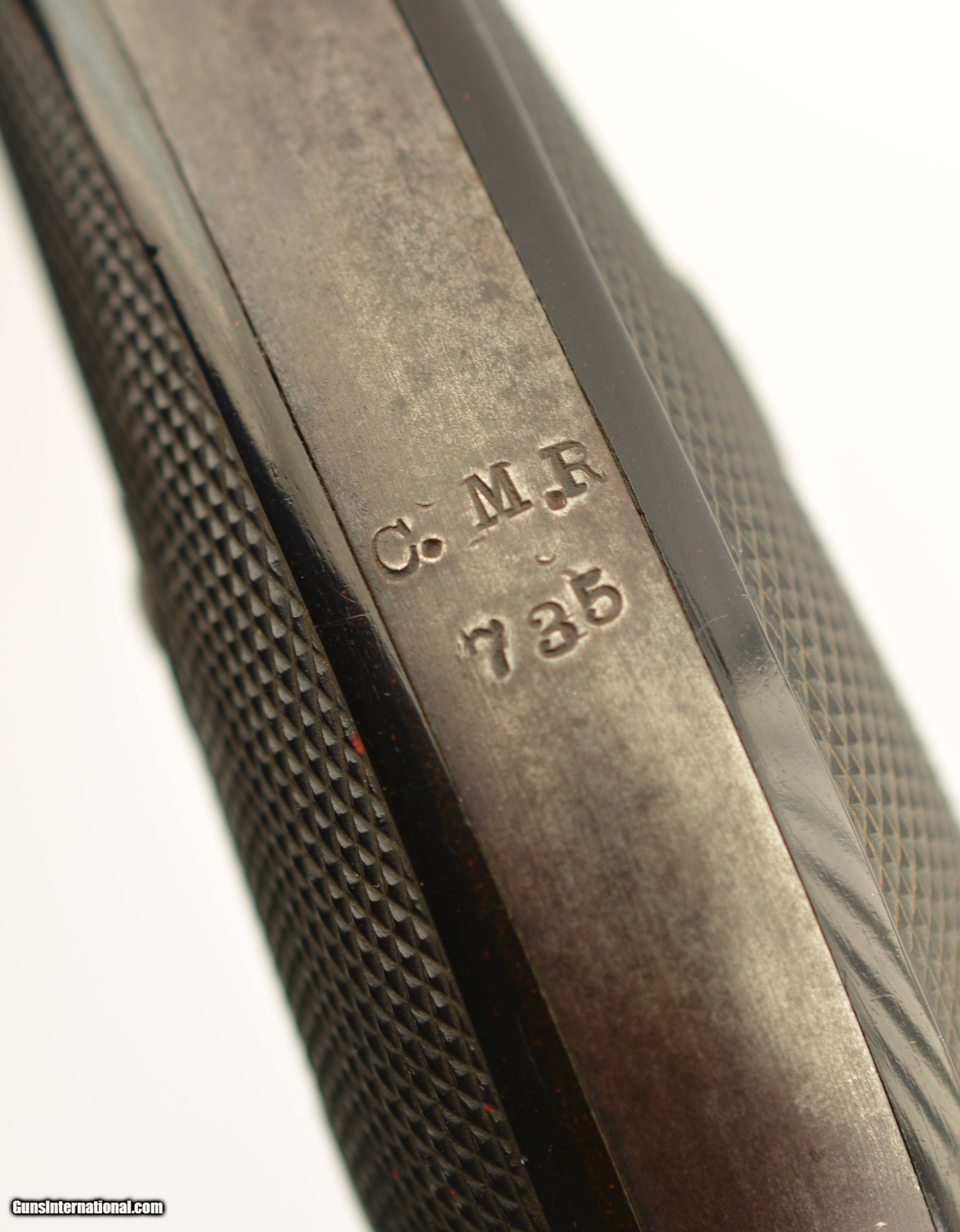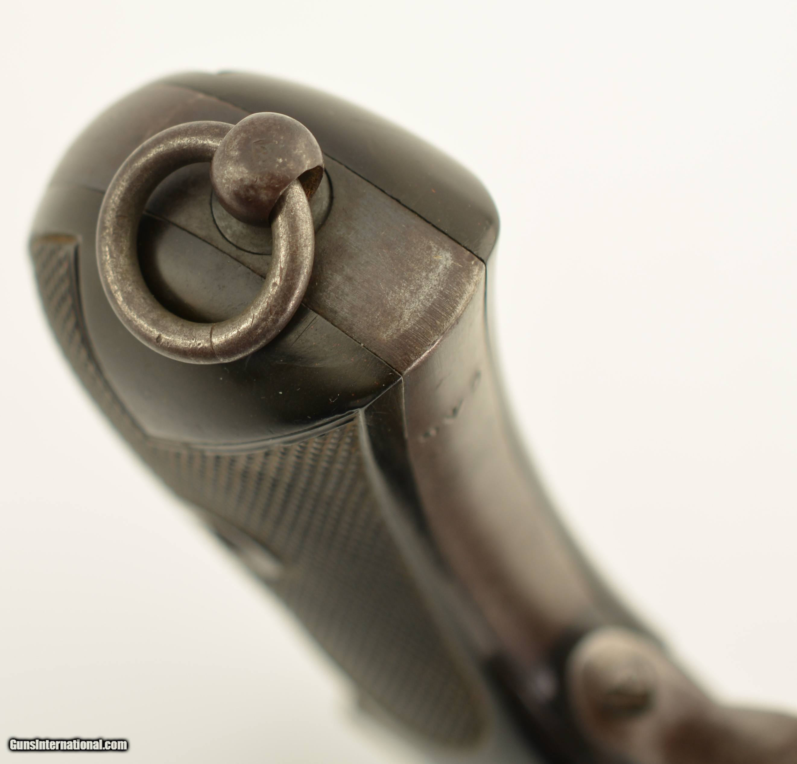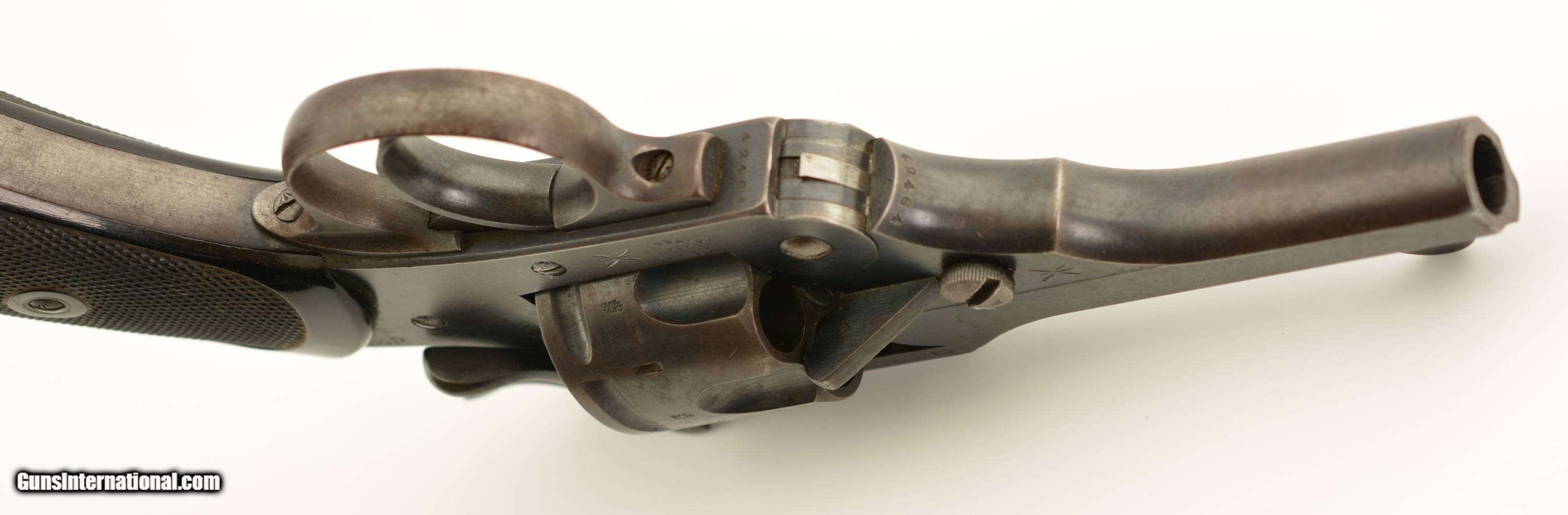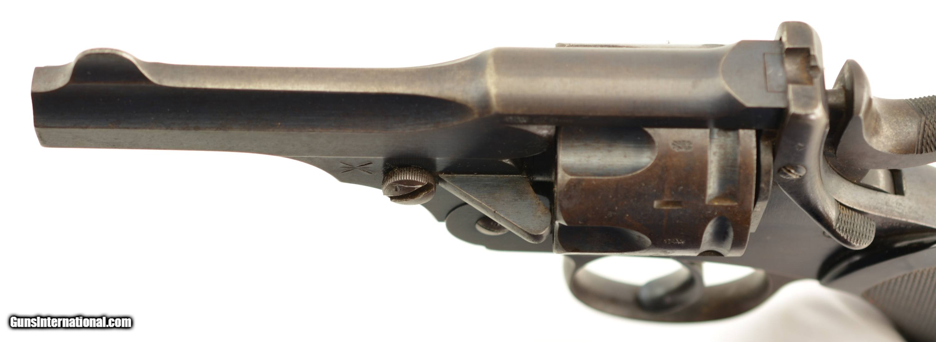 Description: Serial #42464, .455 Webley, 4" barrel with a fine, bright bore that has some mild freckling within the grooves at the breech. This is an all-matching numbered revolver that has retained 70-75% of the original brushed blue finish that has silvered and faded along the raised edges, projections, and there is mild brown freckling throughout. Additionally, there is some mottled brown flaking on the topstrap, trigger guard, and gripstraps. The revolver has numerous Broad Arrow property stamps along with a deeply struck "C.M.R. / 735" unit stamp on the backstrap about halfway down (Cape Mounted Riflemen / 735). A further "C^G" property mark is present on the frontstrap near the toe of the butt denoting possession by the Cape Government. Double arrow civilian sale stamps are present on the frame and barrel as well. The checkered hard rubber, Broad Arrow marked grips are in fine shape with some minor flattening of the points, as well as a few minor scratches and handling blemishes, mainly towards the butt. The lock-up is still tight and the mechanism functions flawlessly. The Cape Mounted Riflemen were a combination military and police force, and saw extensive service both in tribal conflicts, and the Boer War. In 1913 it was incorporated into the South African Army and was renamed the 1st South African Mounted Riflemen. This is a fine-near excellent example of a desirable Boer War Webley model, with a great and desirable South African unit marking. Antique SOLD Antique: Yes Manufacturer: Webley Model: Mk. II Serial Number: 42464 Caliber Info: .455 Gauge Info: .455 |