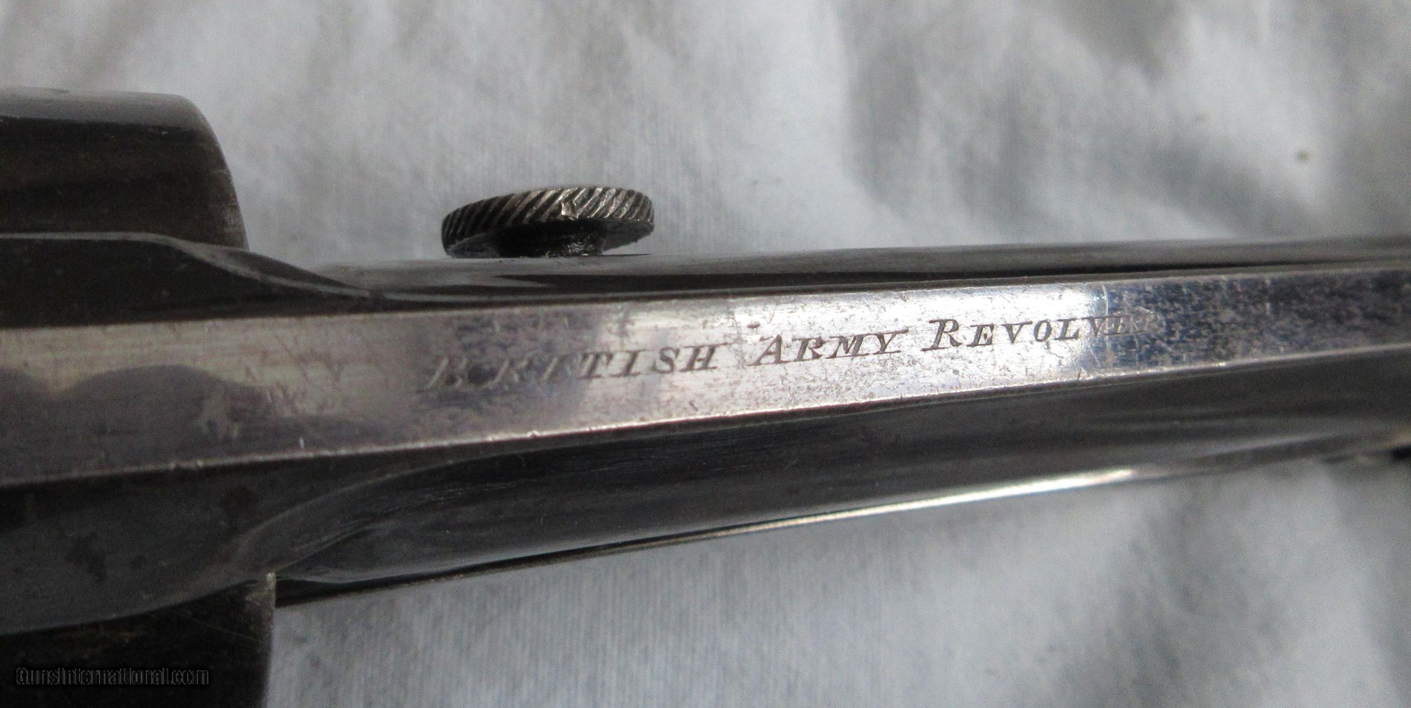 Description: A rare, early, circa 1871 Webley Pryse 6 cylinder .455 beautifully fitted with a folding steel blade. It has British proofs on the cylinder and barrel. Marked, Joint Patents, Stanton & Co. numbered C 45572. The folding blade mechanism is quite ingenious and it functions flawlessly. The blade has never been sharpened. The Pryse levers lock the cylinder up tight as a drum. It indexes perfectly. The barrel rifling is strong. The grips show very little wear. The lanyard ring is tight. Lots of blue remain on the body and the folding blade release. It comes in a fitted box with a Blanch trade label and box of ammunition. The barrel is marked, British Army Revolver. This might have been a prototype created at the request of a British officer heading to the various conflicts during that time period. Beautifully made. SOLD Antique: Yes Manufacturer: Webley Pryse Serial Number: C 45572 Caliber Info: 455 Condition: Excellent Wood Condition: Fine Bore Condition: Fine |