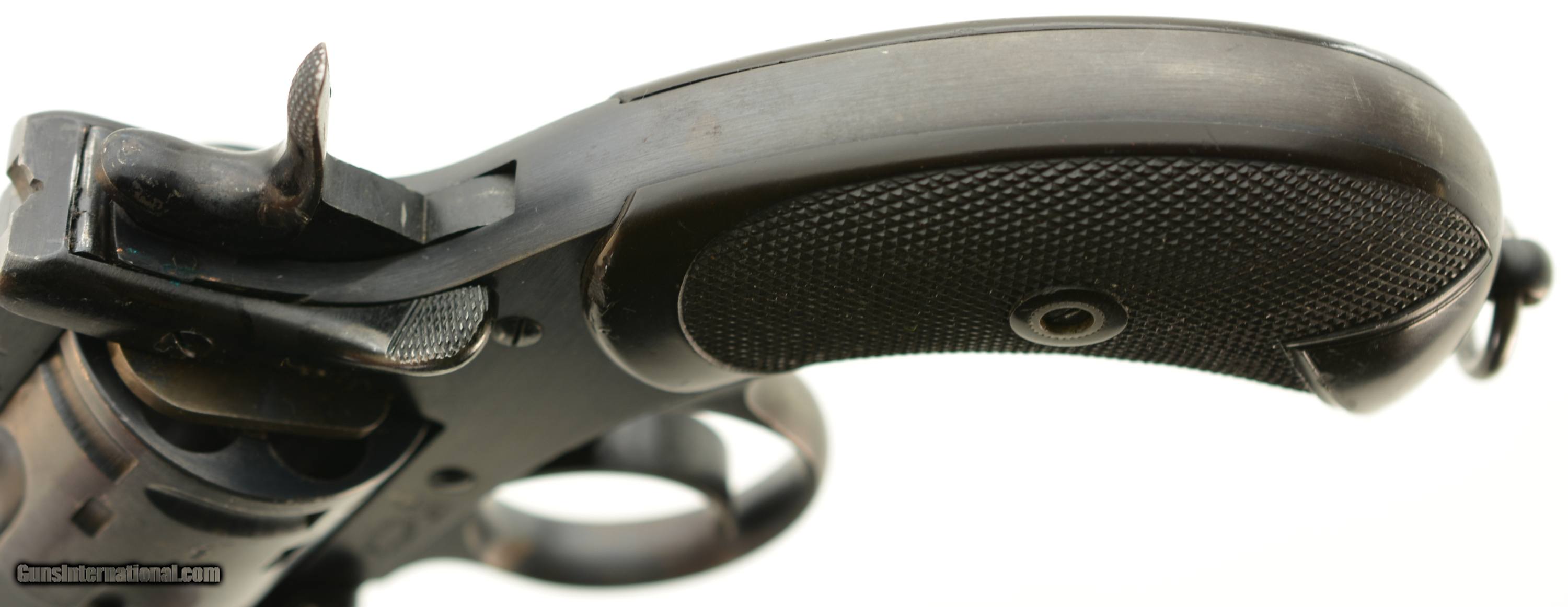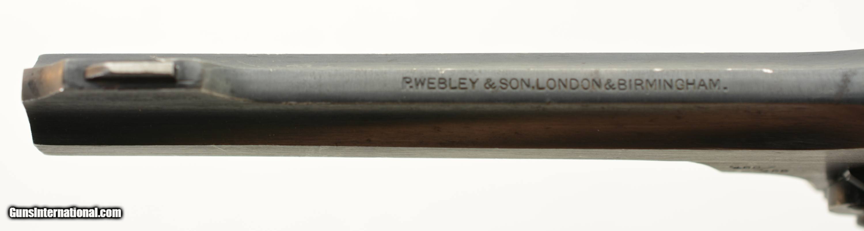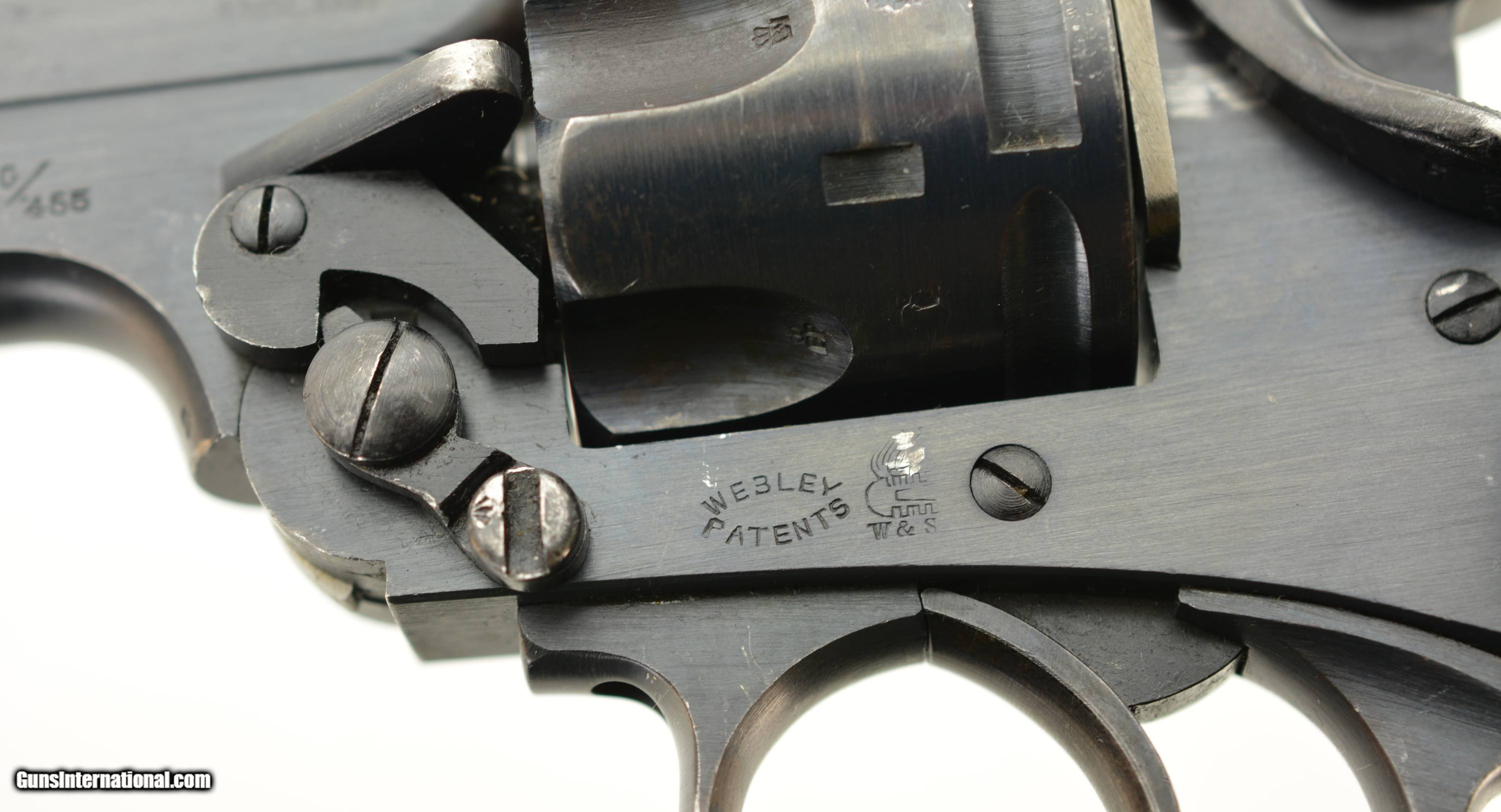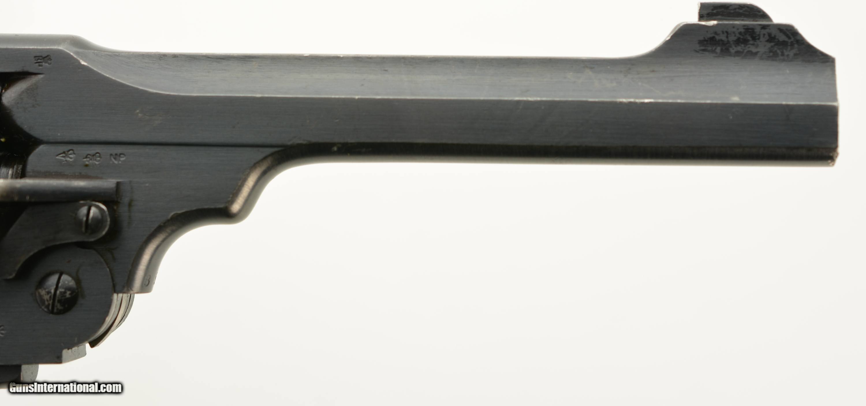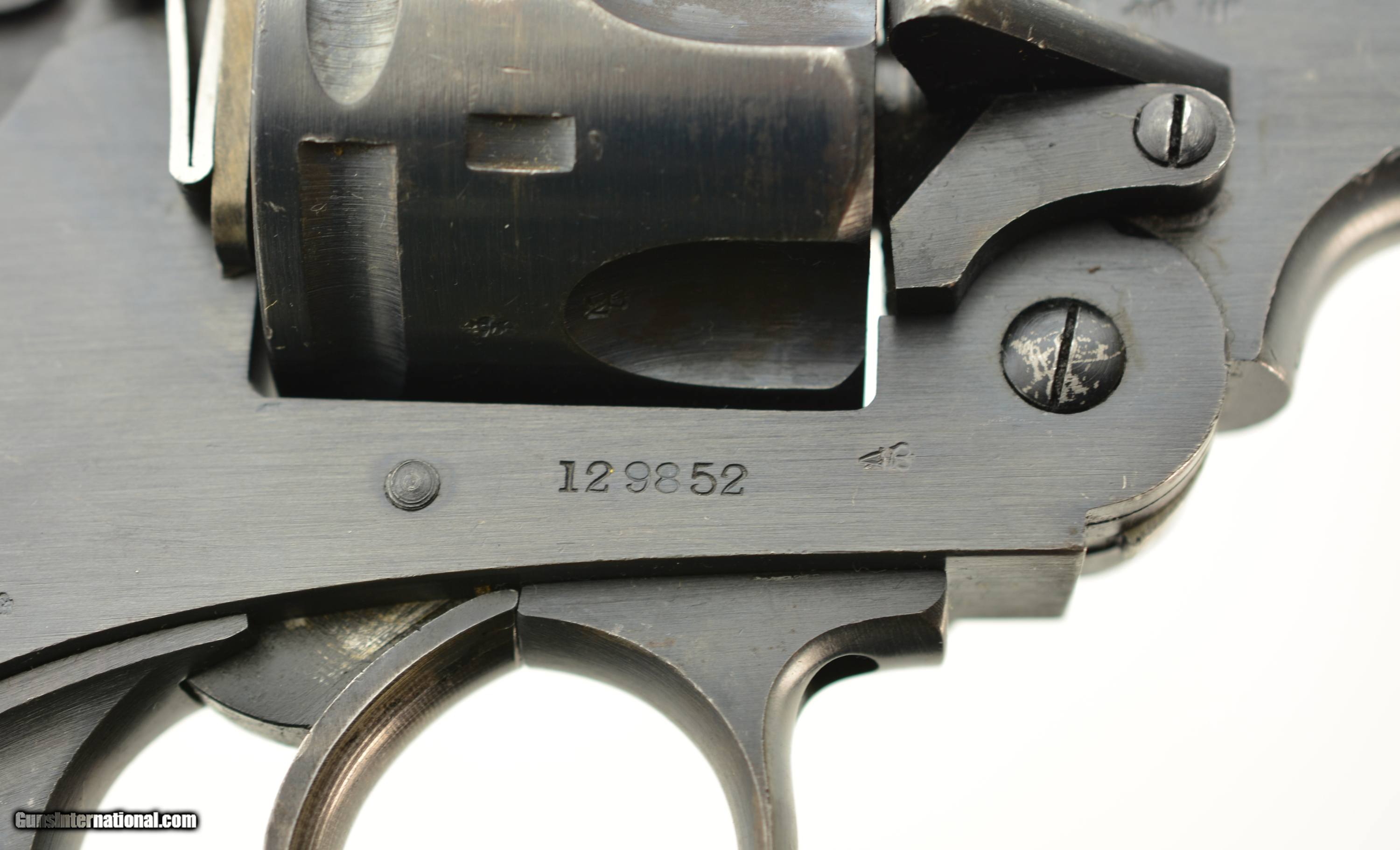 Description: Serial #129852, .455 Webley, 6" barrel with an excellent, bright bore. This is a handsome, commercially marked revolver that retains 95-97% of the original brushed blue finish that has mild silvering along the high and exposed edges, as well as a gentle turn-ring on the cylinder. Traces of Suncorite are present at the front sight, on the hammer, and on the thumb-lever. All markings are crisp, and the checkered Vulcanite grips are in very good-near fine shape with some minor flattening of the points, as well as light surface scratches, and a chip at the toe of the right panel. The lock-up is still tight, and the mechanism functions flawlessly. This example is stamped "England" as required for export. These revolvers were built between 1913 - 1915. The 6" barrel appears to be more scarce than the 4" examples. This is a very nice early Mk. V Webley, in a desirable configuration. FFL or C&R SOLD Curio/Relic: Yes |